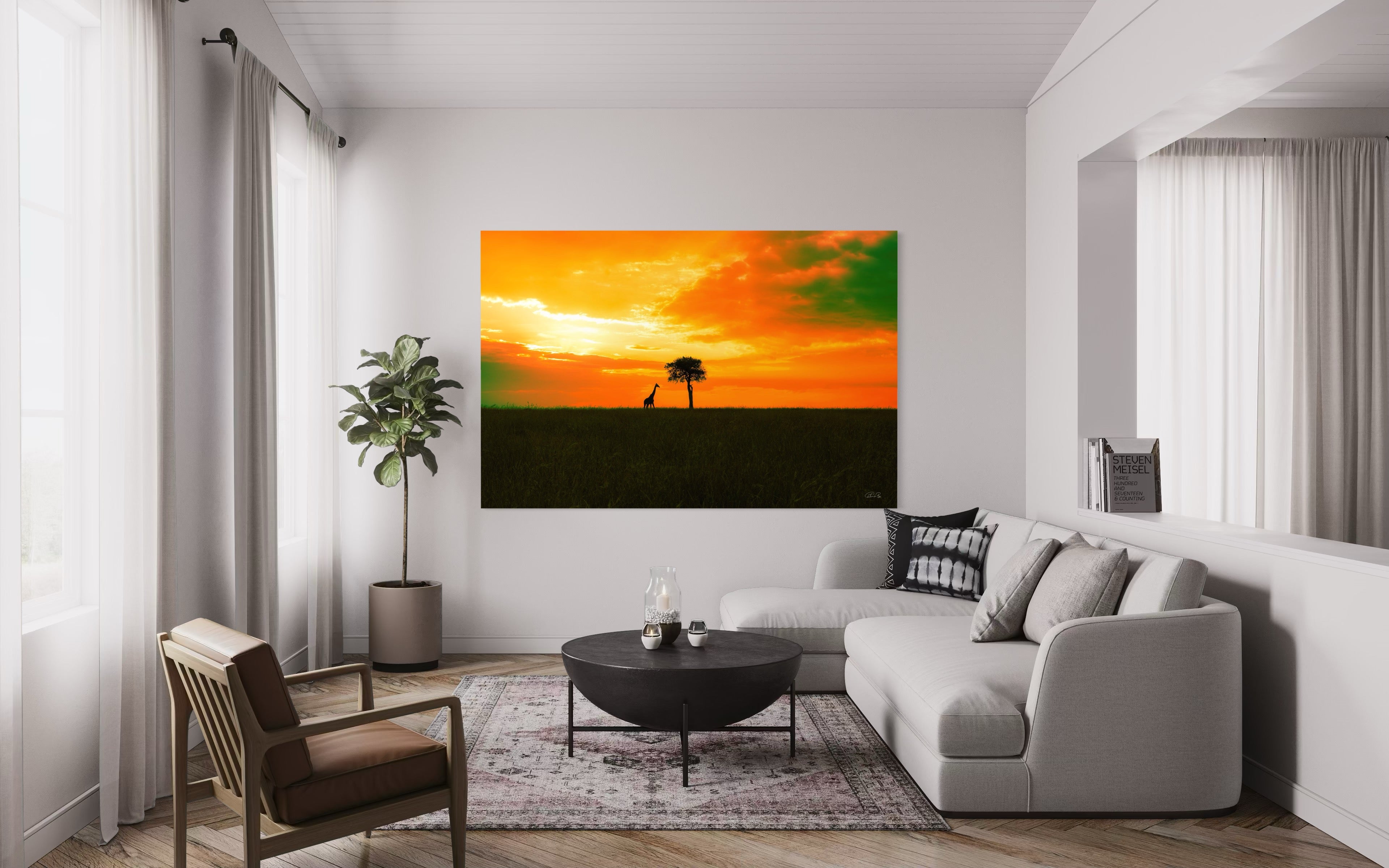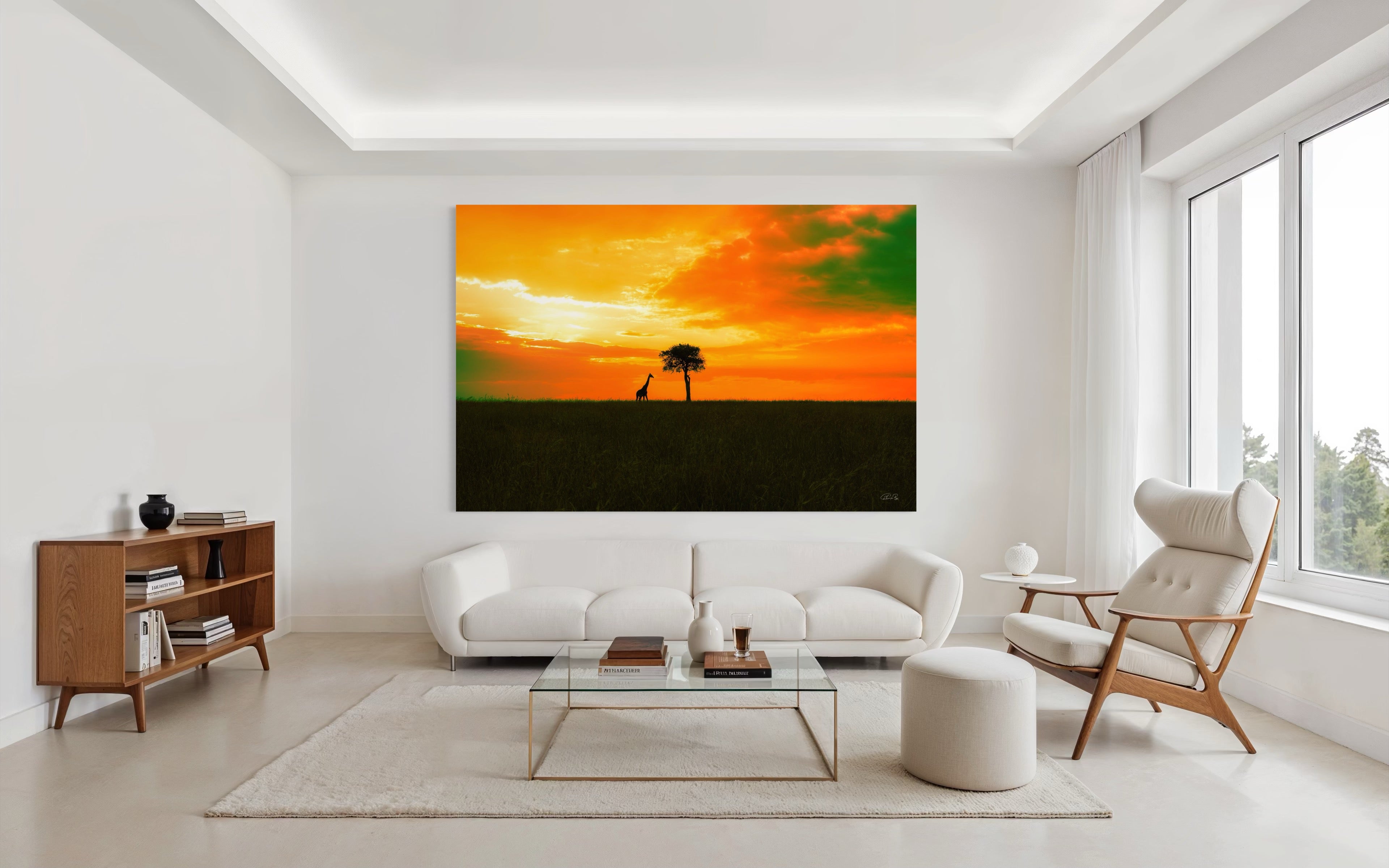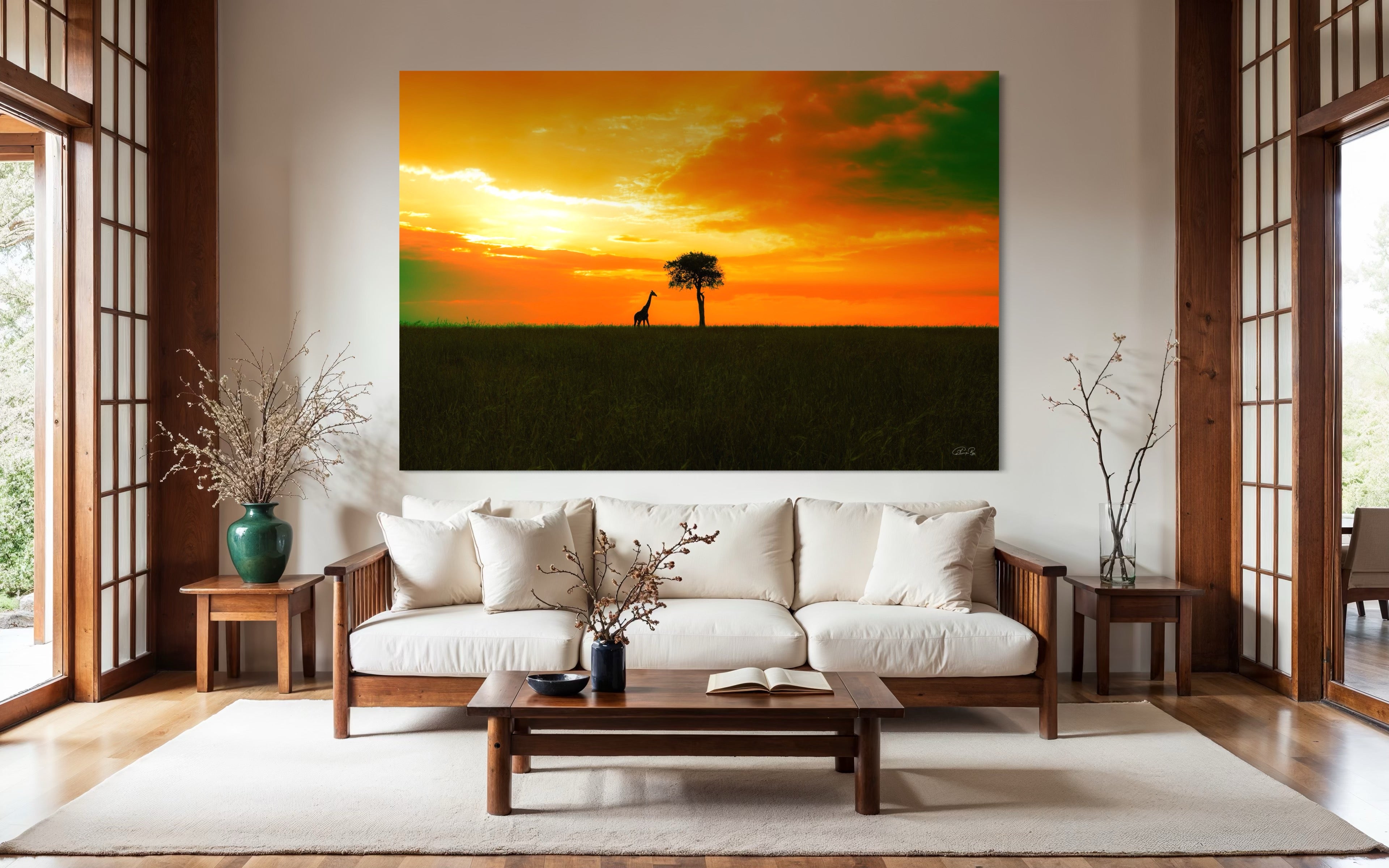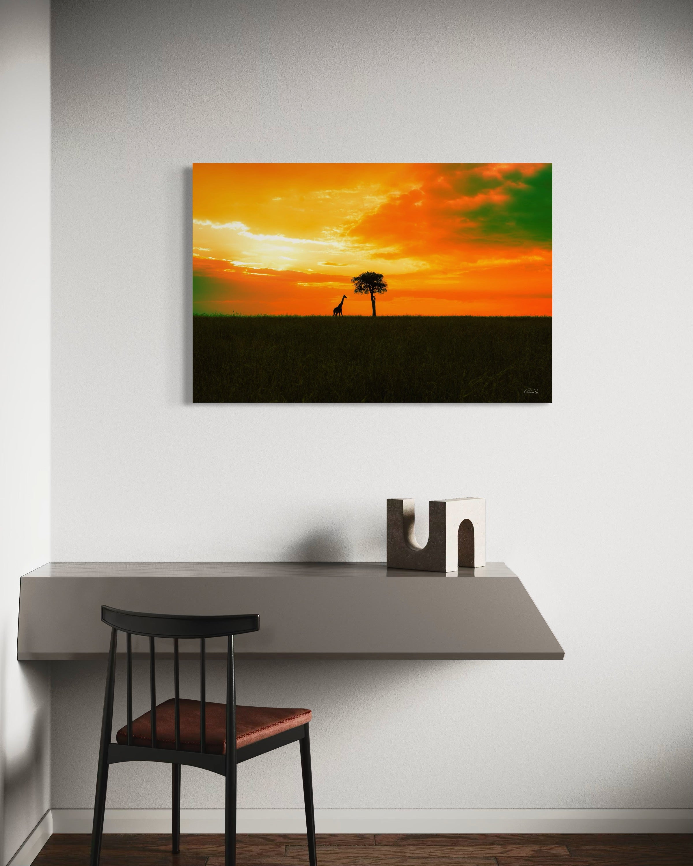 As the African sun dipped toward the horizon, the sky transformed into a canvas of gold and fire. In that vast, silent savannah, I stood witness — and ready. My dream composition, long imagined, unfolded before me: a lone giraffe and a solitary acacia tree, silhouetted against a horizon that stretched into eternity.