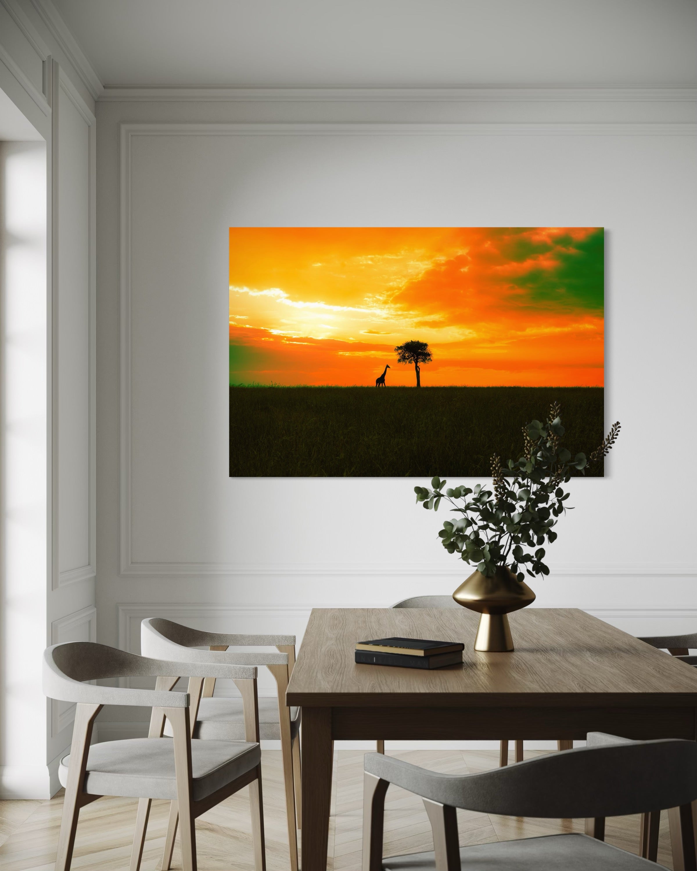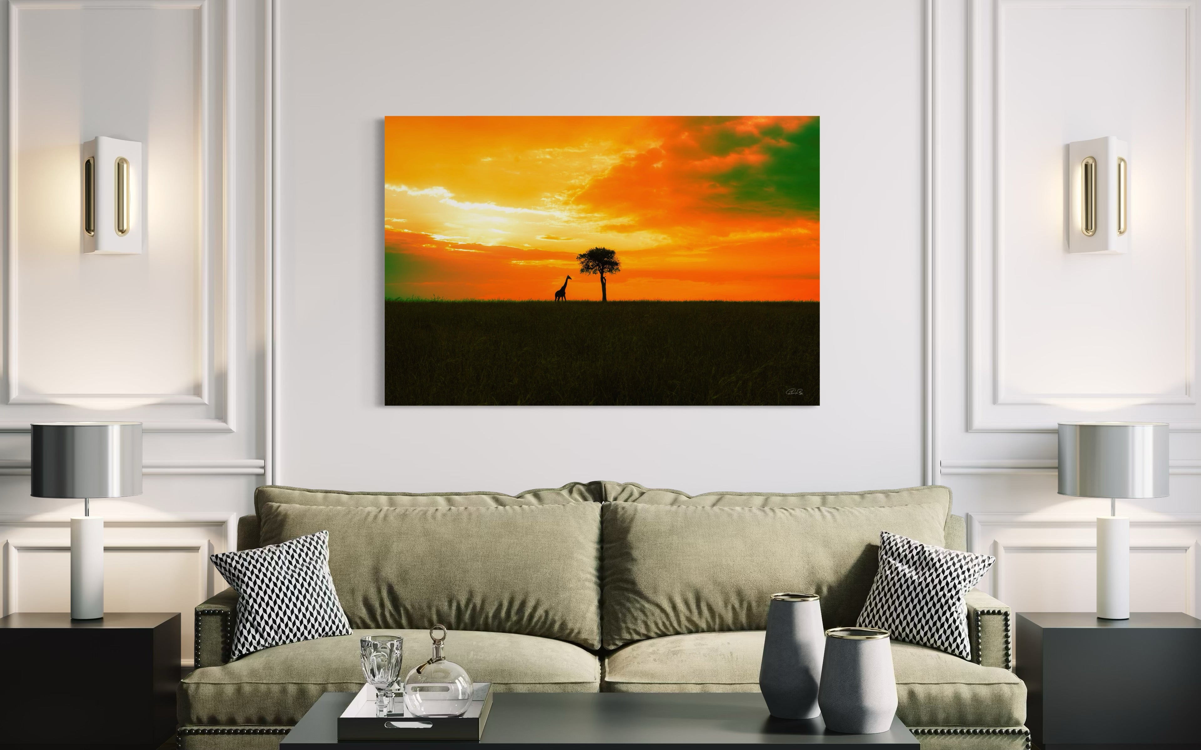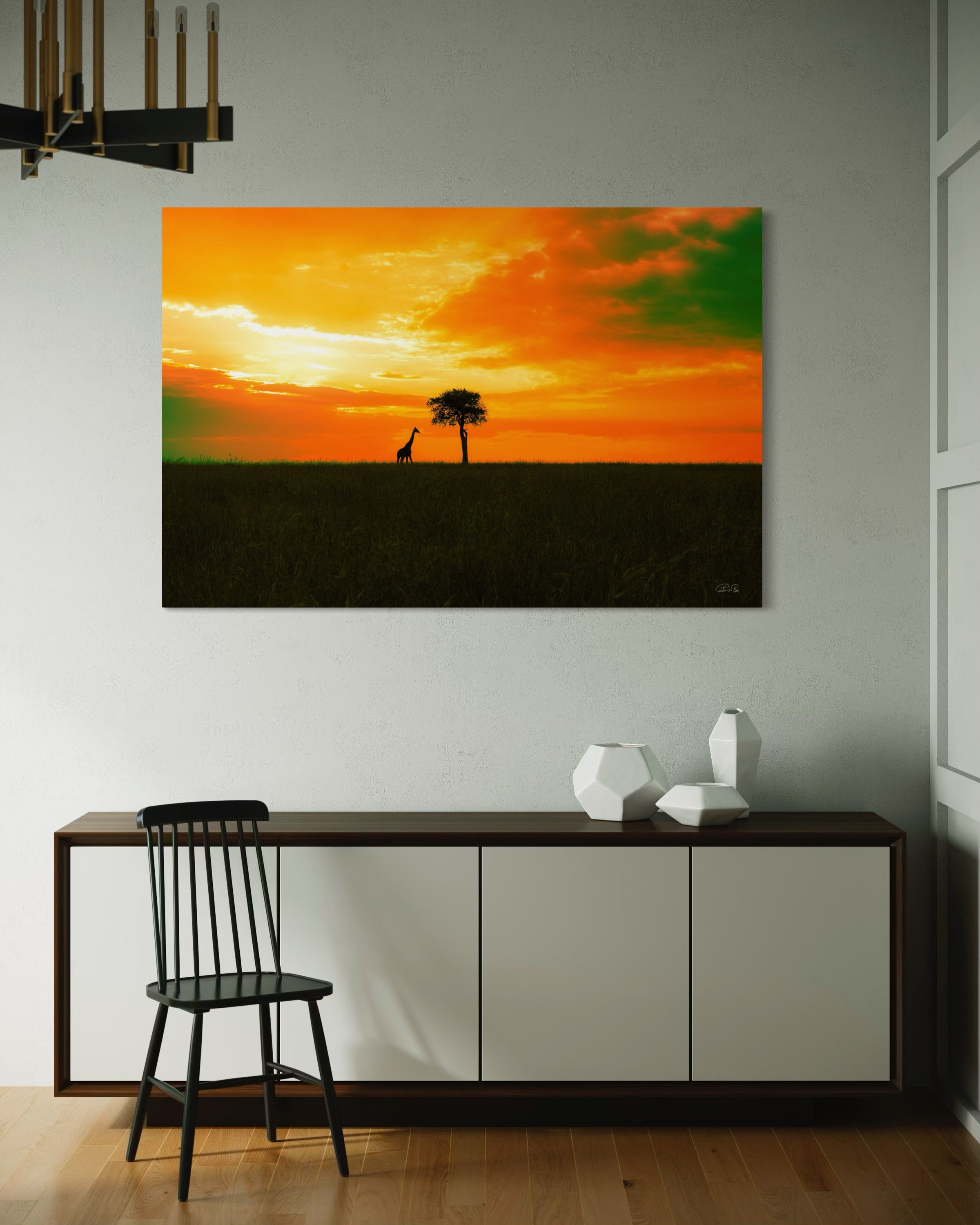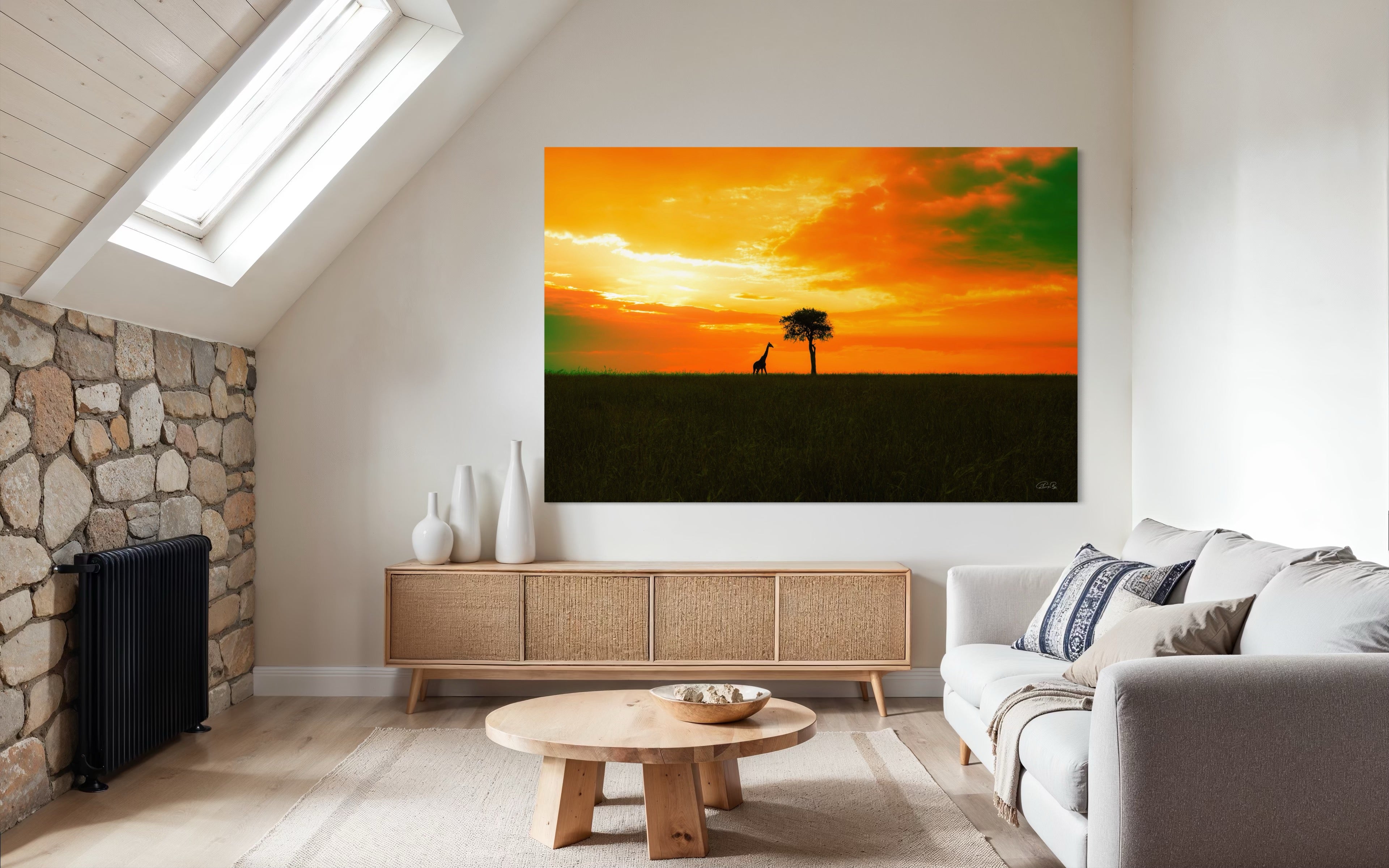 As the African sun dipped toward the horizon, the sky transformed into a canvas of gold and fire. In that vast, silent savannah, I stood witness — and ready. My dream composition, long imagined, unfolded before me: a lone giraffe and a solitary acacia tree, silhouetted against a horizon that stretched into eternity.