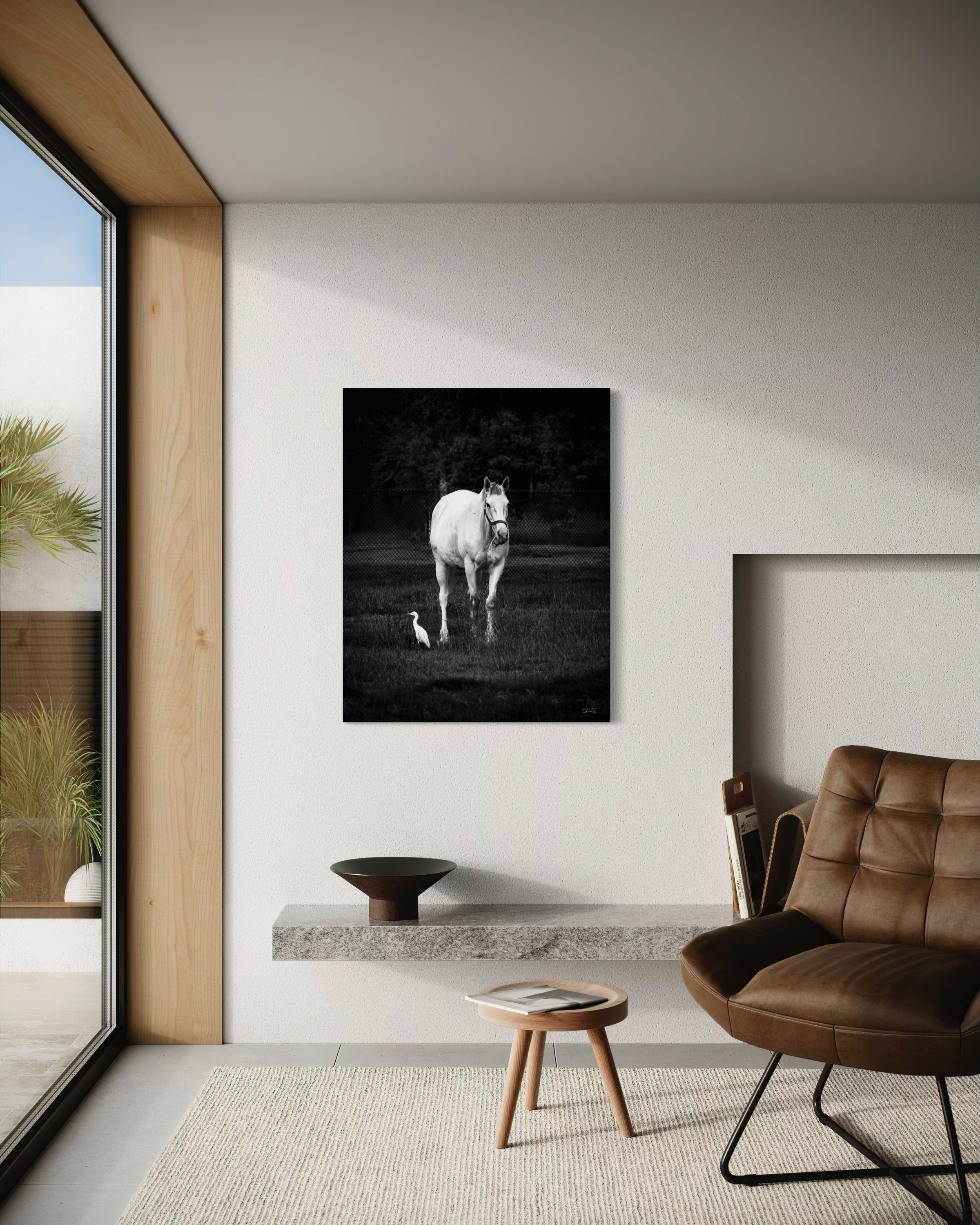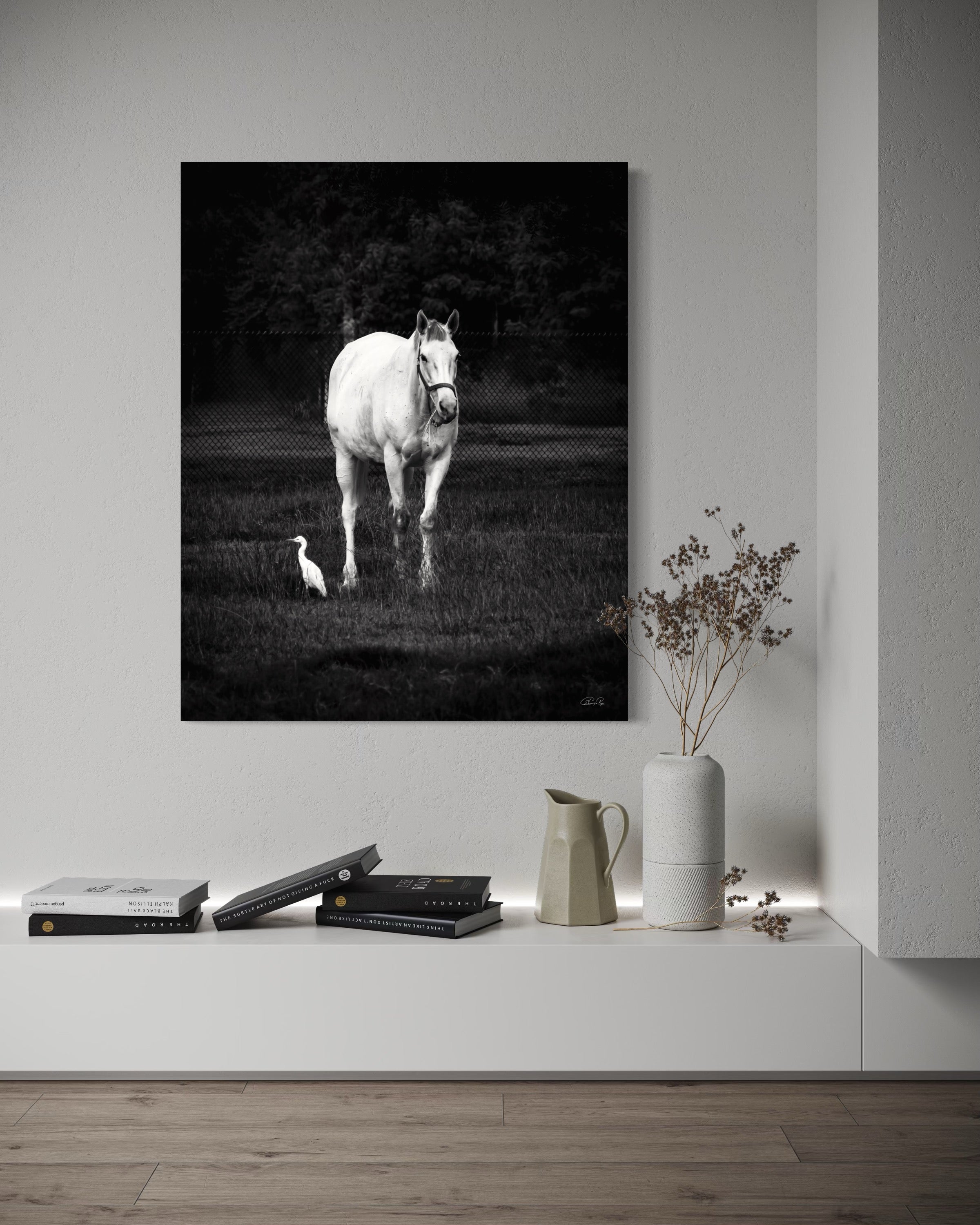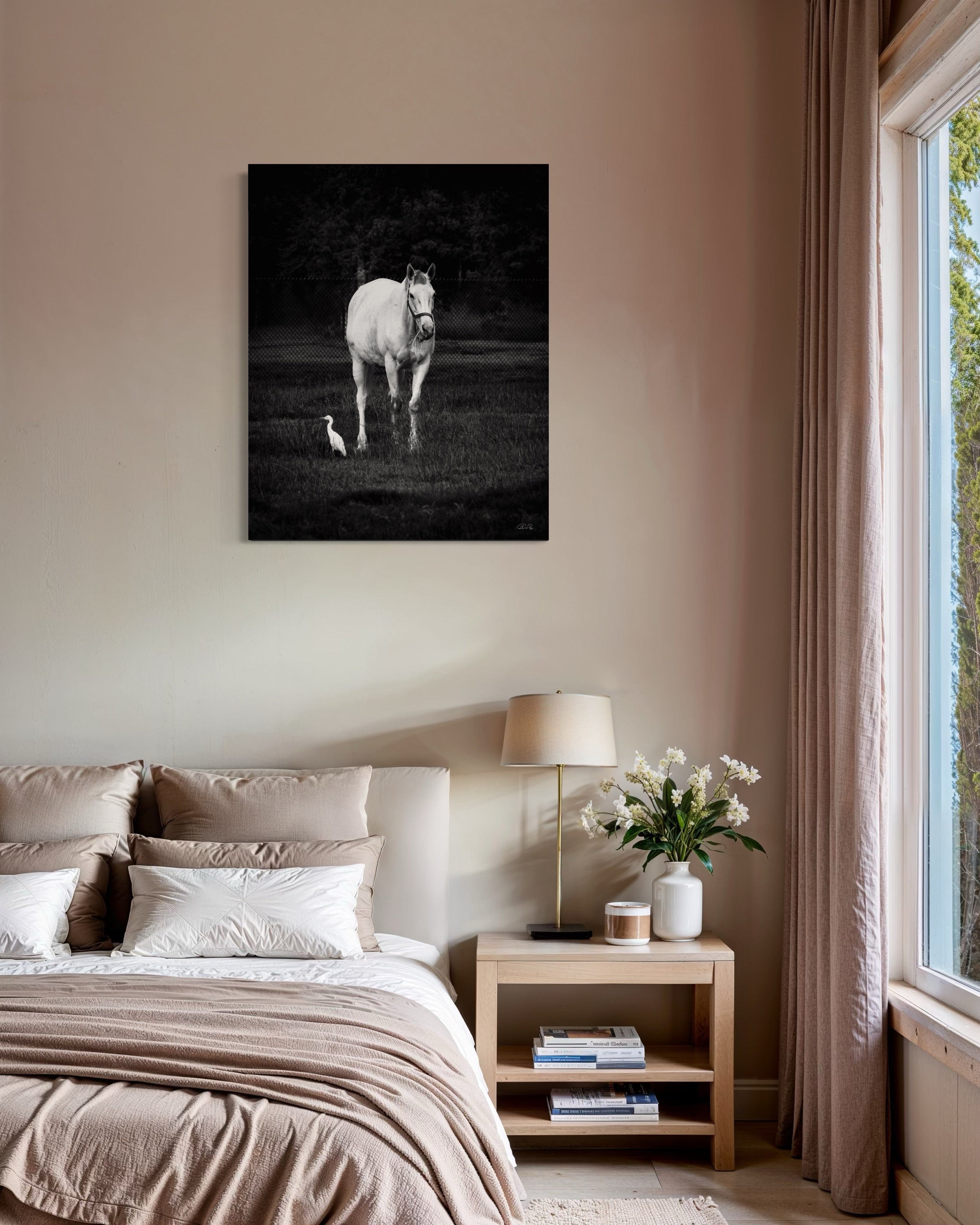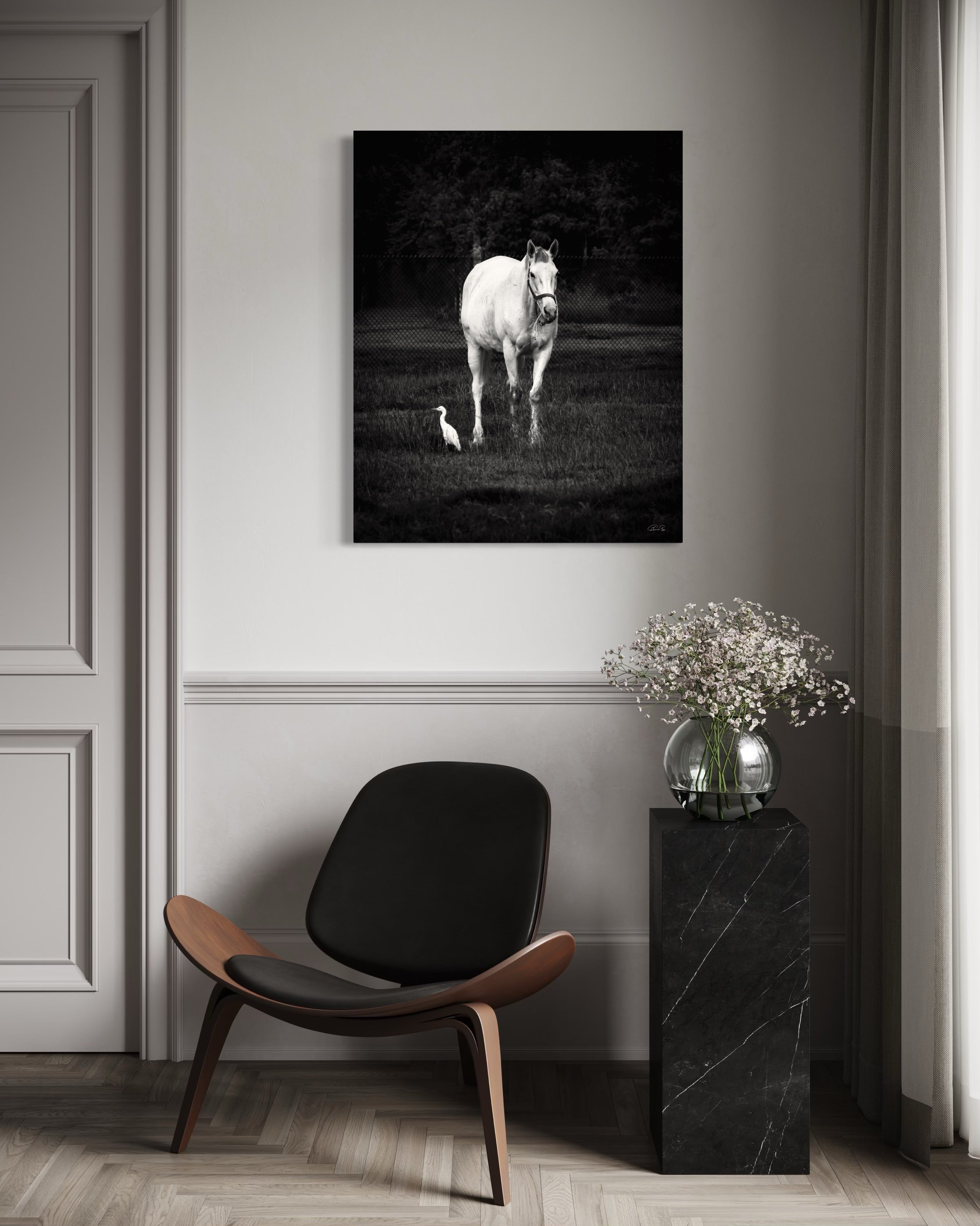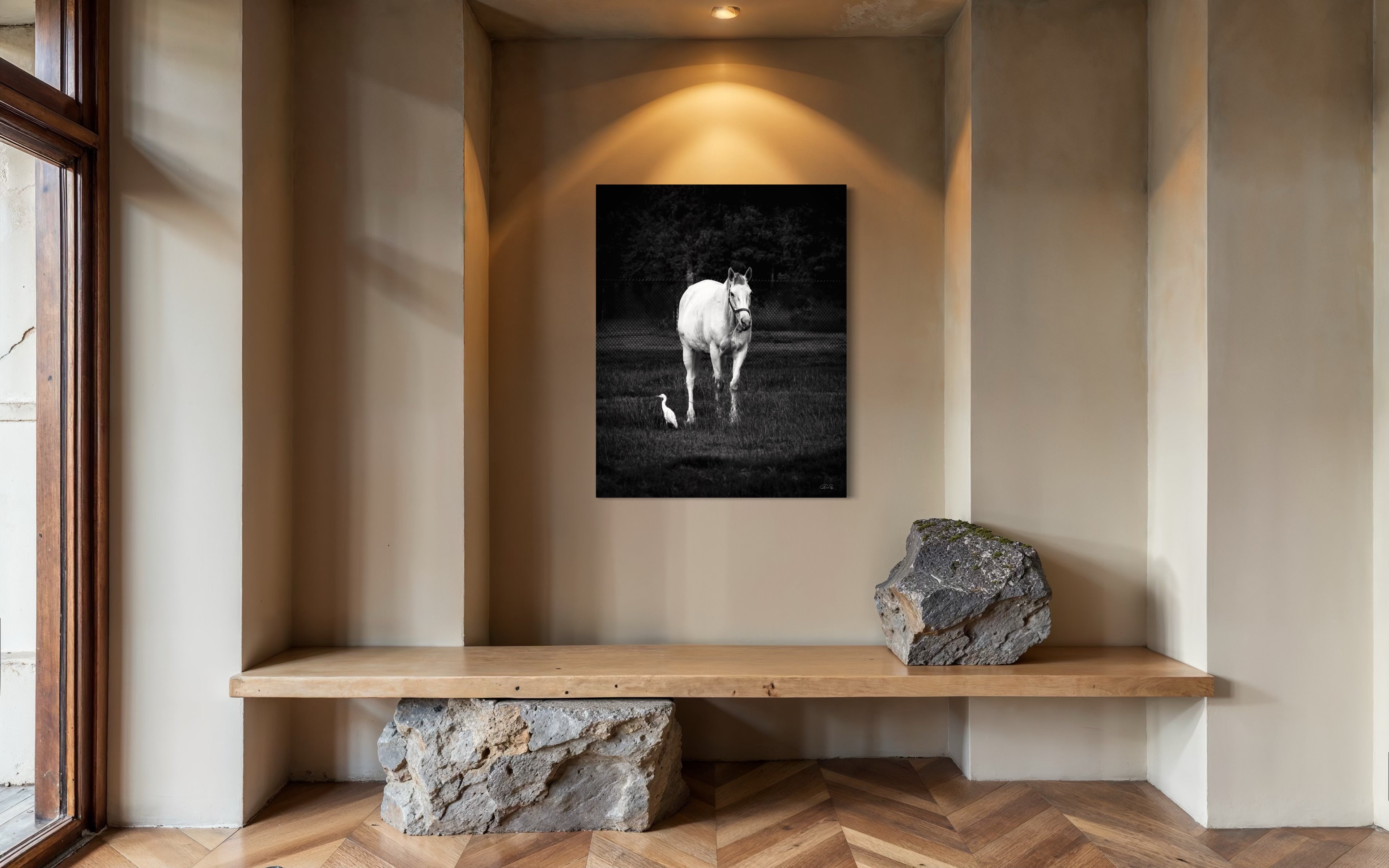 As a resident equine veterinarian at the nation's premier thoroughbred stud, the early mornings unfold like sacred rituals, revealing the essence of this enchanting world. It was on one such fine morning, as the first rays of dawn caressed the sprawling lush green paddock, that my eyes beheld a sight that stirred my soul. A regal grey mare stood with elegant poise, her presence commanding admiration. To my astonishment, an egret graced her side, a picture of effortless grace. In that fleeting moment, different species converged in perfect harmony, creating a composition that exuded timeless beauty and sheer elegance. Nature, in its infinite wisdom, had orchestrated this exquisite encounter, and I, a humble witness, could not resist capturing its magnificence. With careful precision, I chose the monochromatic mode, for it allowed the depth of feeling and the profound mood to permeate the frame. In that serene composition, I found myself blessed, for I had captured an ephemeral moment that embodied grace, elegance, and the delicate dance of existence itself.