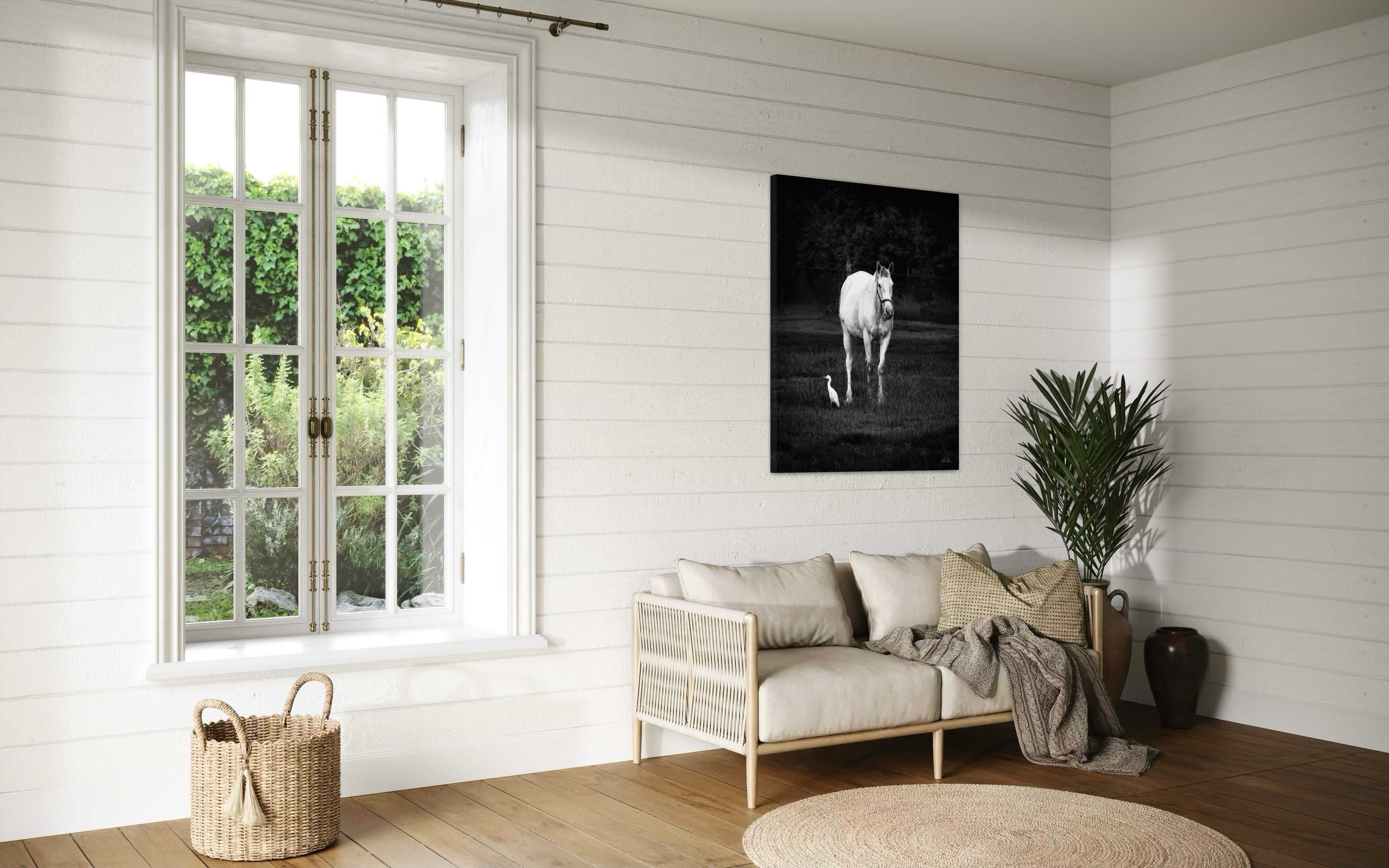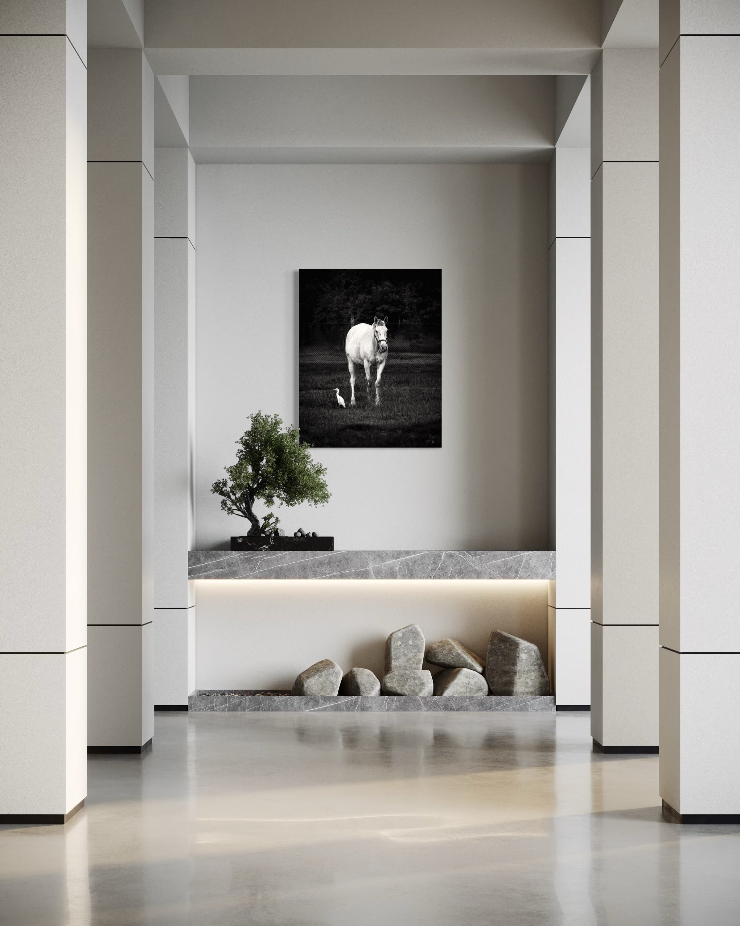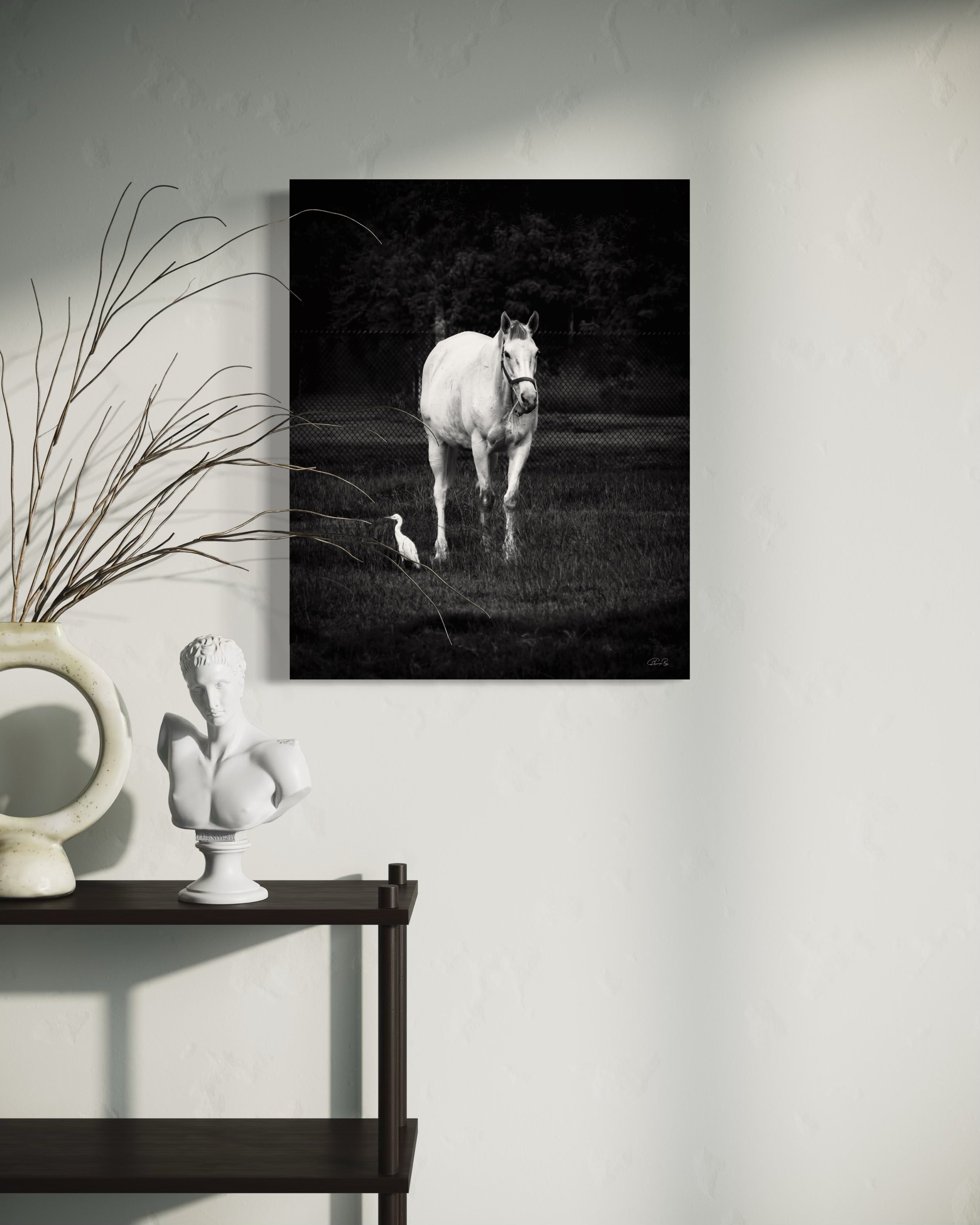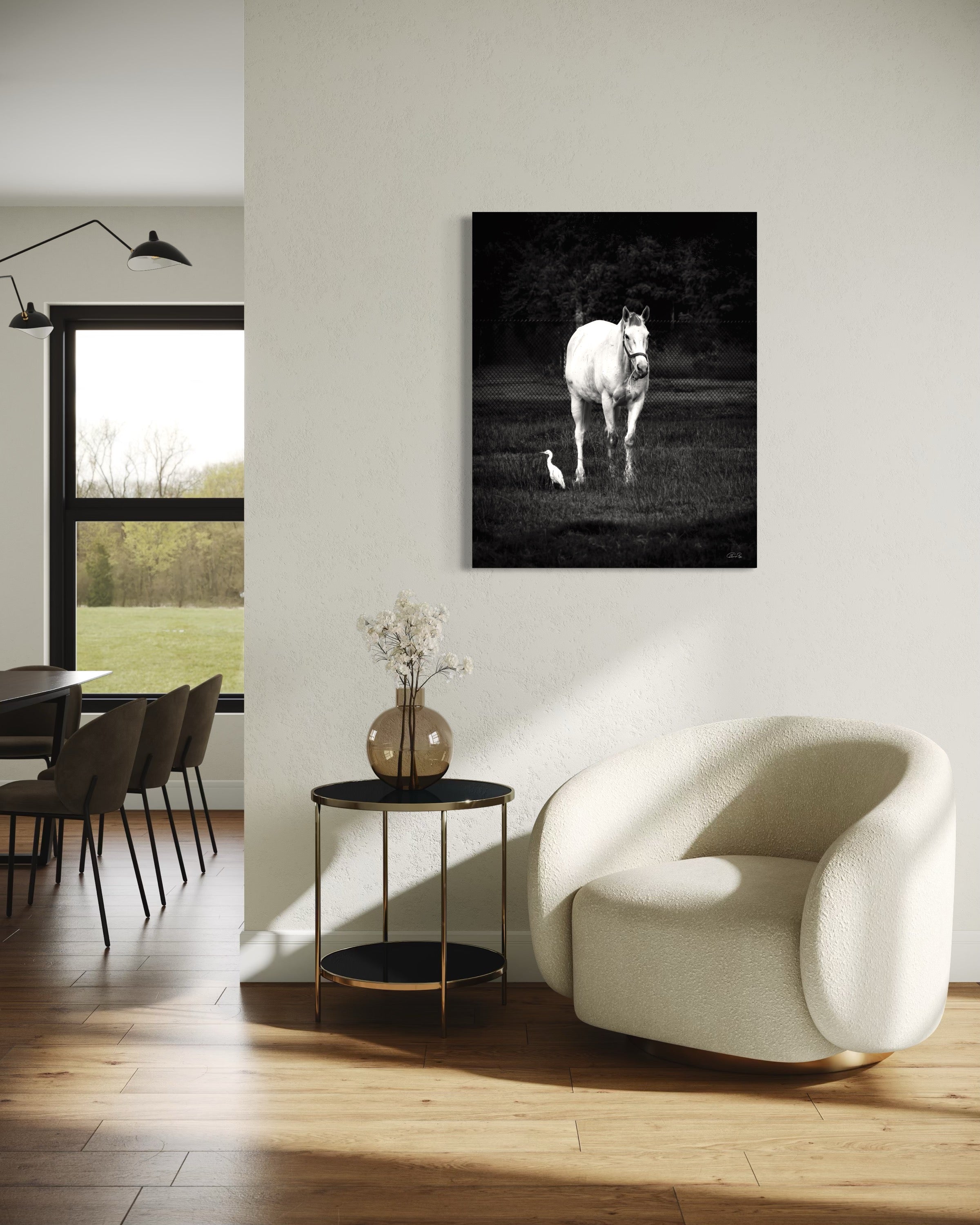 As a resident equine veterinarian at the nation's premier thoroughbred stud, the early mornings unfold like sacred rituals, revealing the essence of this enchanting world. It was on one such fine morning, as the first rays of dawn caressed the sprawling lush green paddock, that my eyes beheld a sight that stirred my soul. A regal grey mare stood with elegant poise, her presence commanding admiration. To my astonishment, an egret graced her side, a picture of effortless grace. In that fleeting moment, different species converged in perfect harmony, creating a composition that exuded timeless beauty and sheer elegance. Nature, in its infinite wisdom, had orchestrated this exquisite encounter, and I, a humble witness, could not resist capturing its magnificence. With careful precision, I chose the monochromatic mode, for it allowed the depth of feeling and the profound mood to permeate the frame. In that serene composition, I found myself blessed, for I had captured an ephemeral moment that embodied grace, elegance, and the delicate dance of existence itself.