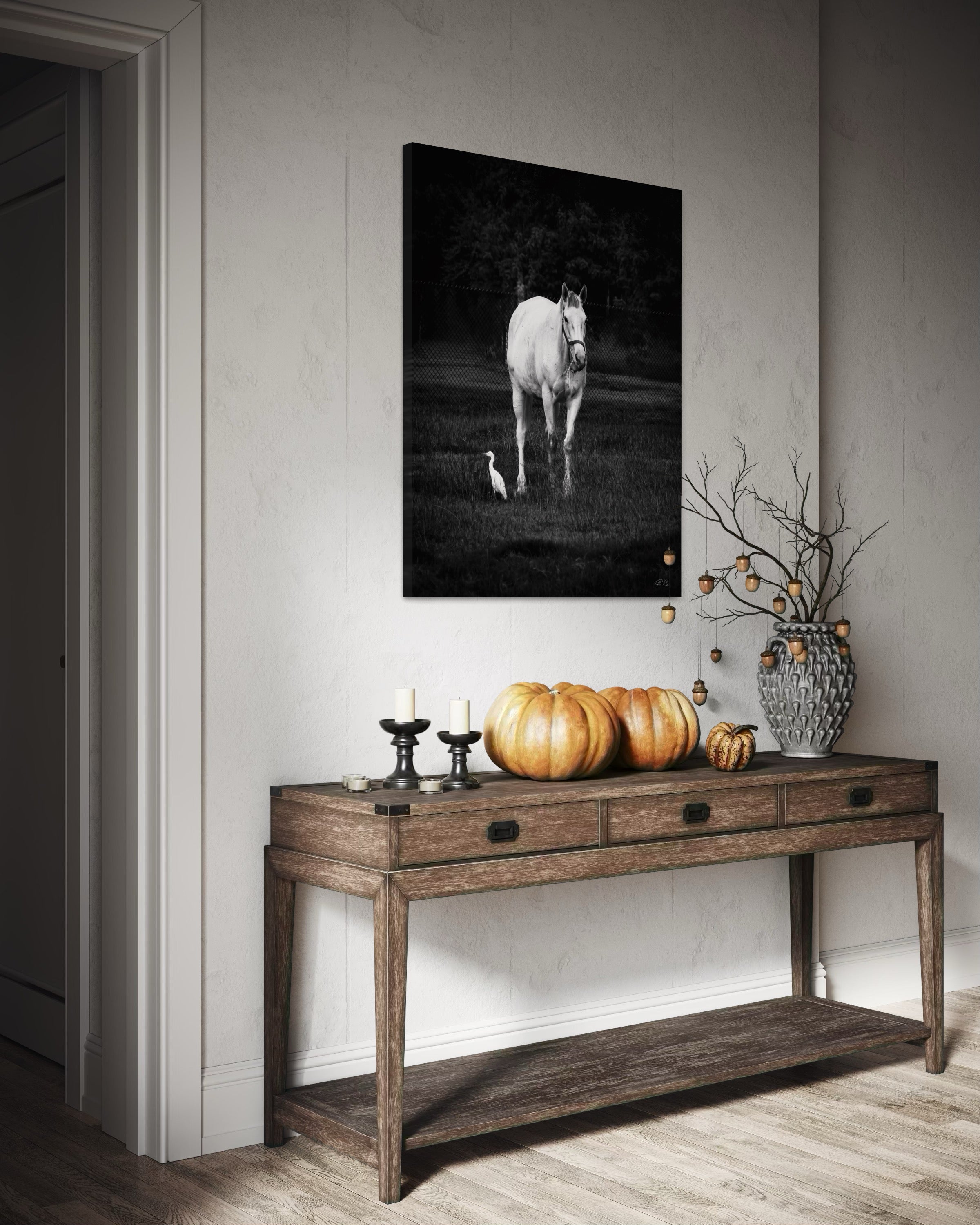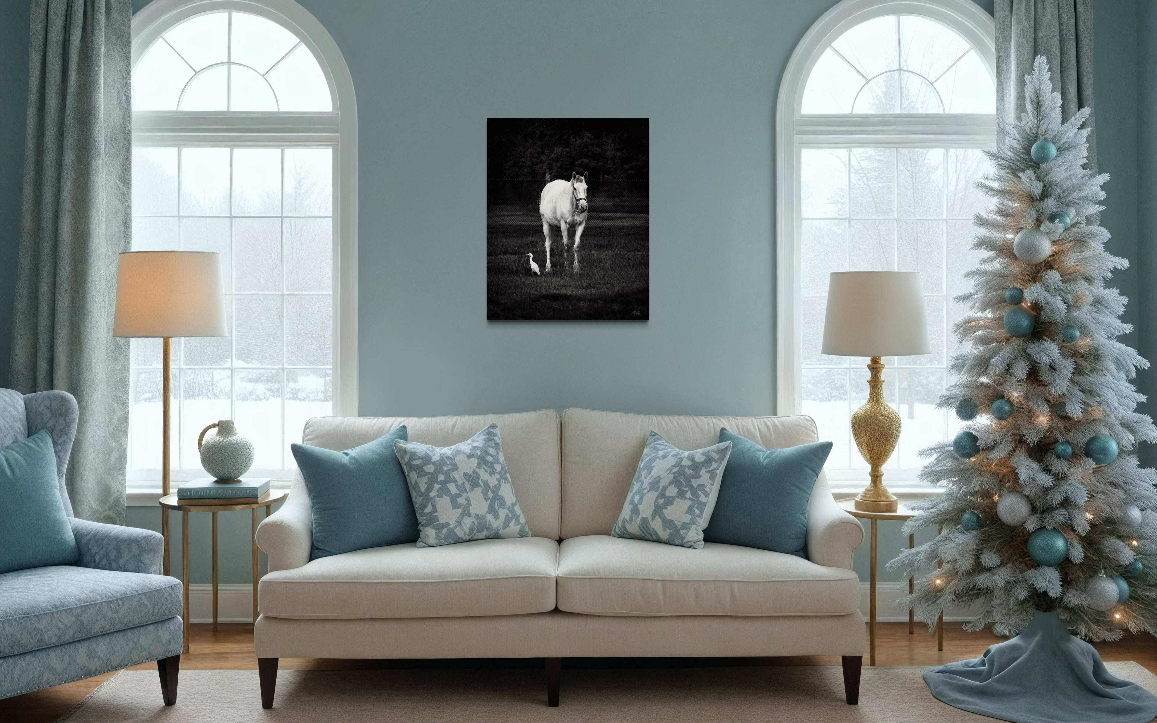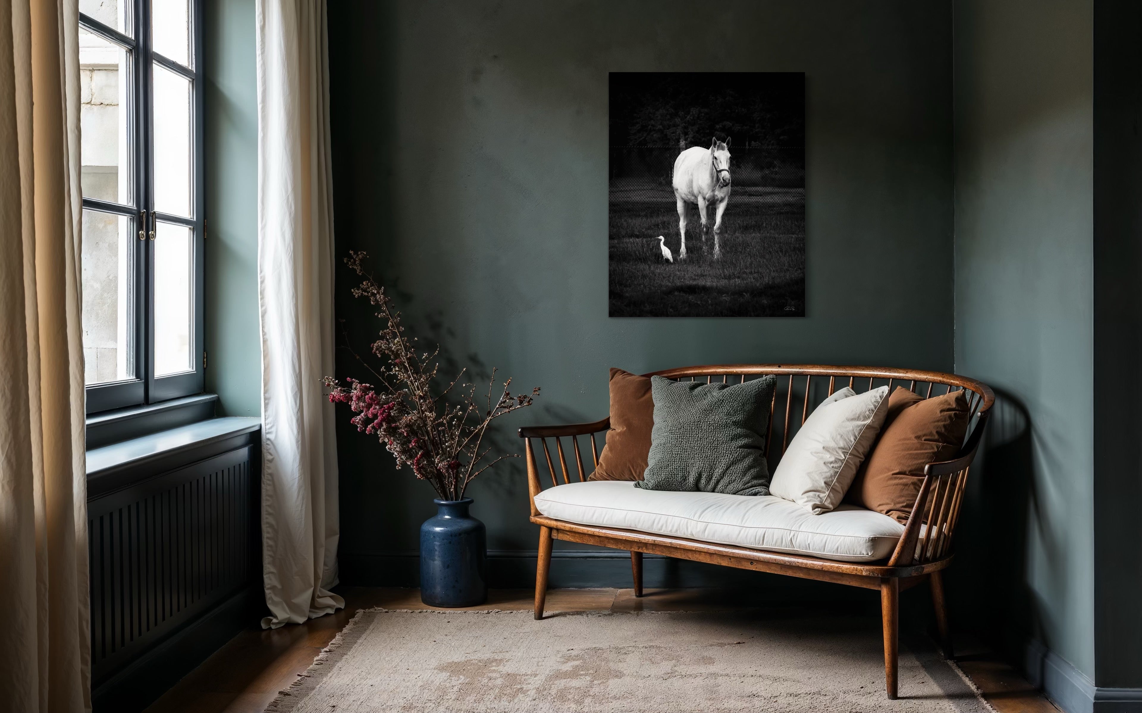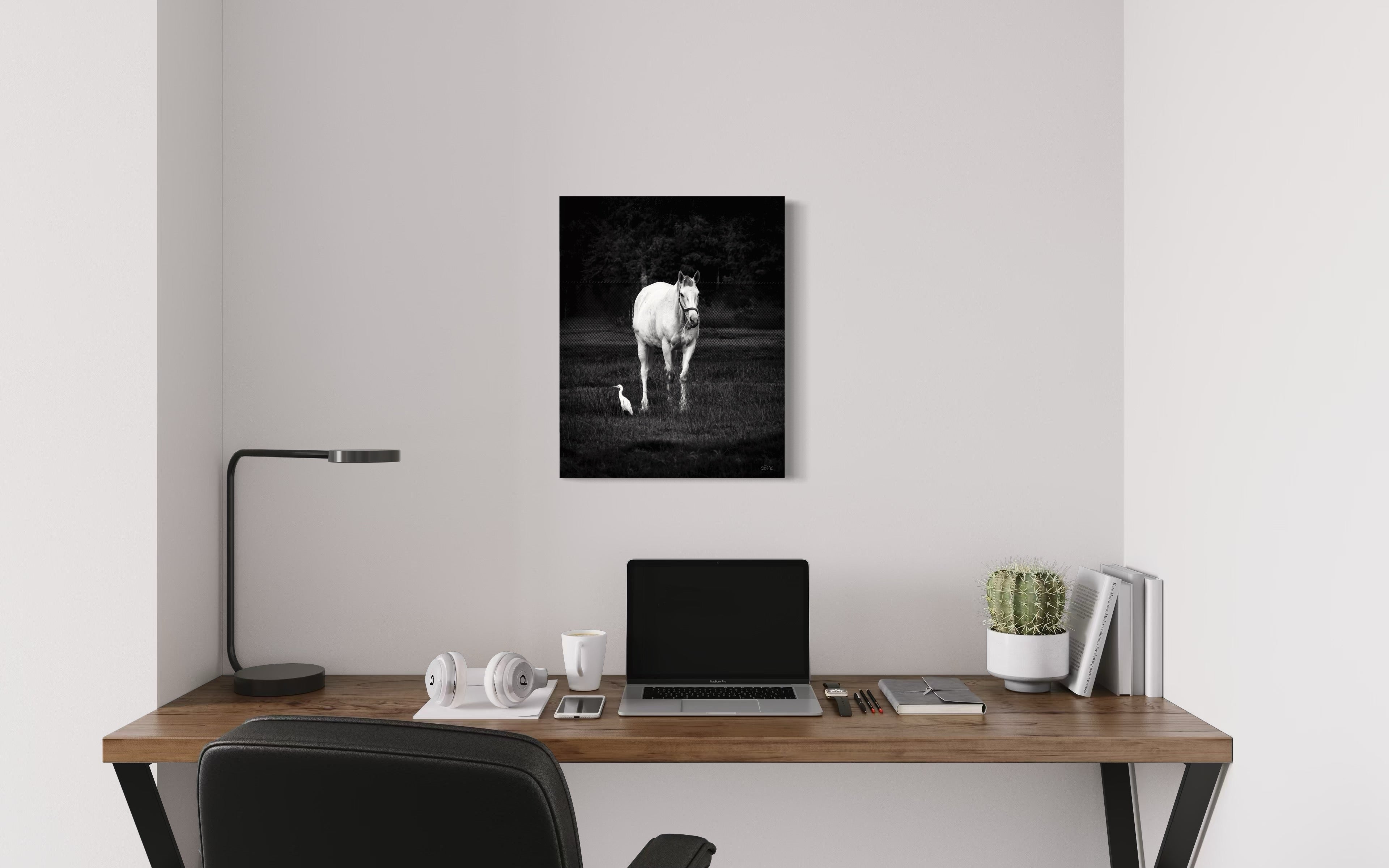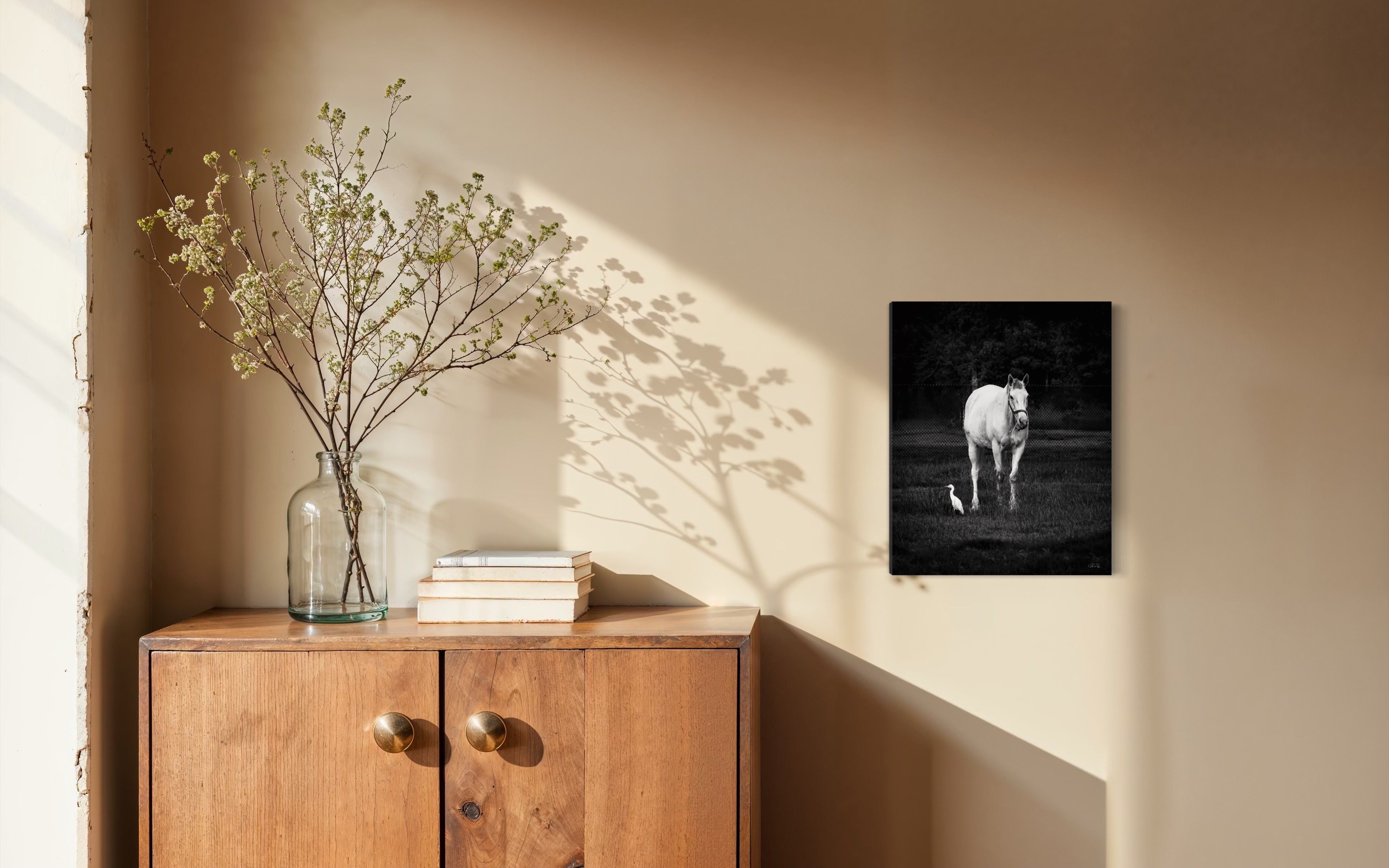 As a resident equine veterinarian at the nation's premier thoroughbred stud, the early mornings unfold like sacred rituals, revealing the essence of this enchanting world. It was on one such fine morning, as the first rays of dawn caressed the sprawling lush green paddock, that my eyes beheld a sight that stirred my soul. A regal grey mare stood with elegant poise, her presence commanding admiration. To my astonishment, an egret graced her side, a picture of effortless grace. In that fleeting moment, different species converged in perfect harmony, creating a composition that exuded timeless beauty and sheer elegance. Nature, in its infinite wisdom, had orchestrated this exquisite encounter, and I, a humble witness, could not resist capturing its magnificence. With careful precision, I chose the monochromatic mode, for it allowed the depth of feeling and the profound mood to permeate the frame. In that serene composition, I found myself blessed, for I had captured an ephemeral moment that embodied grace, elegance, and the delicate dance of existence itself.