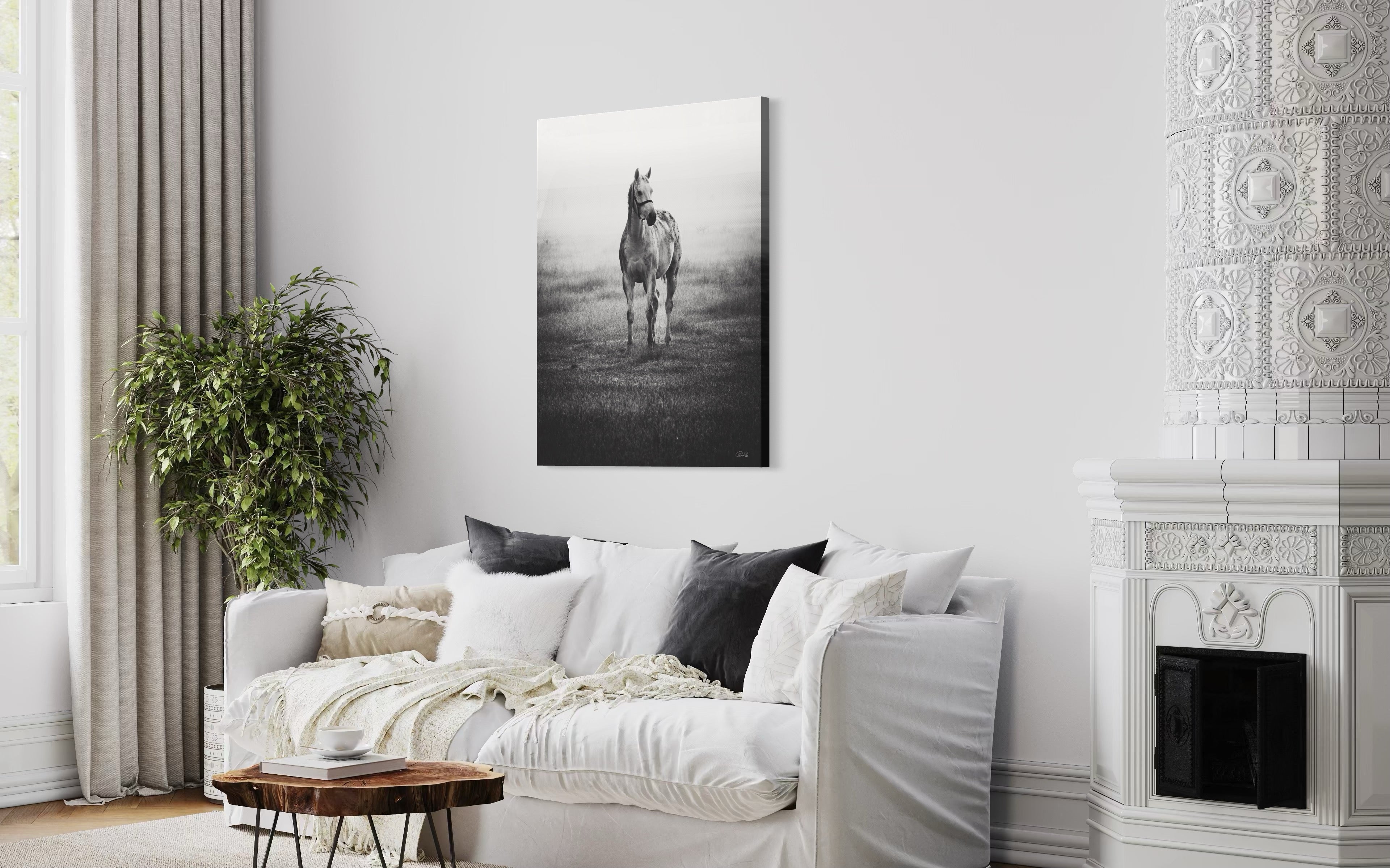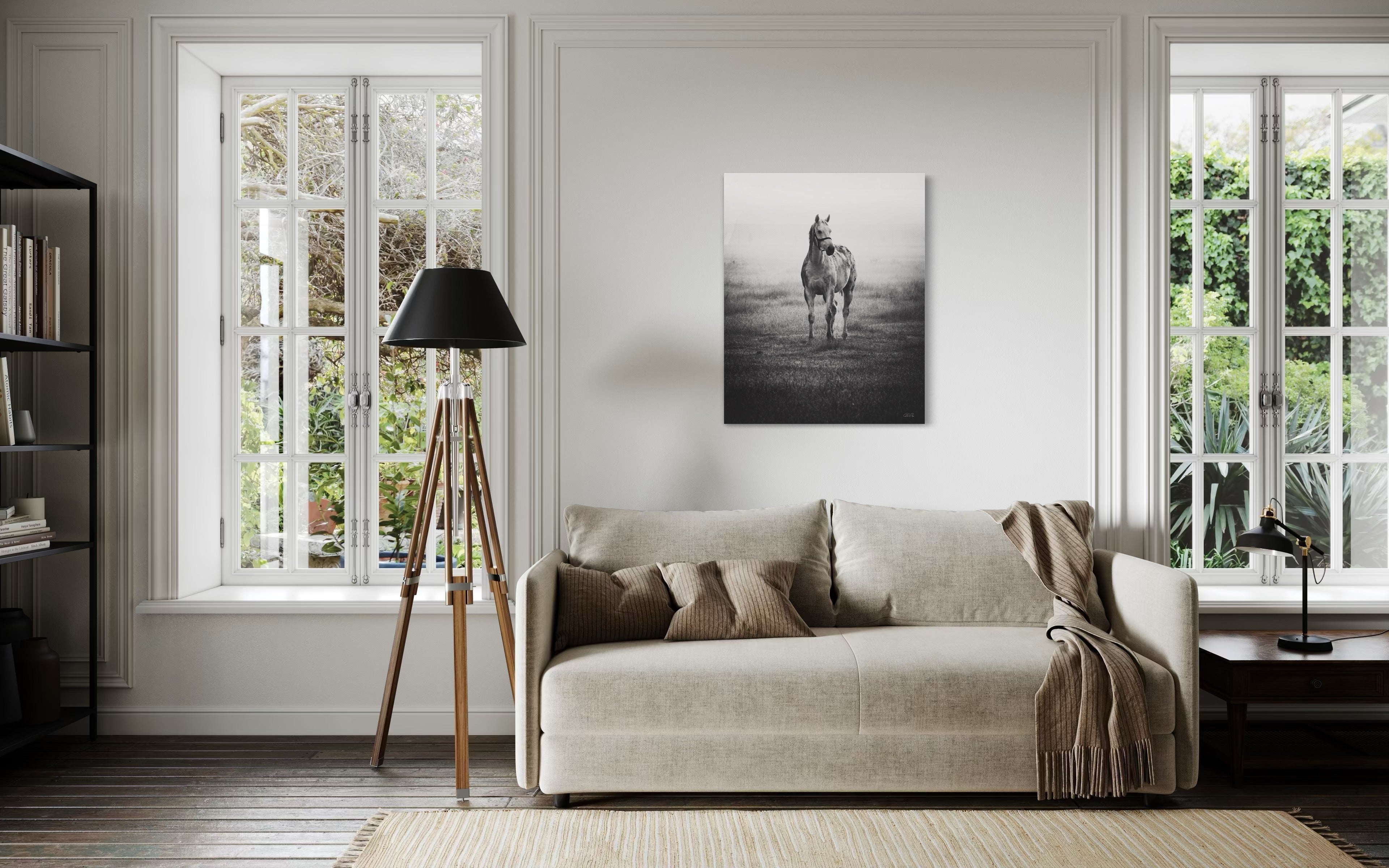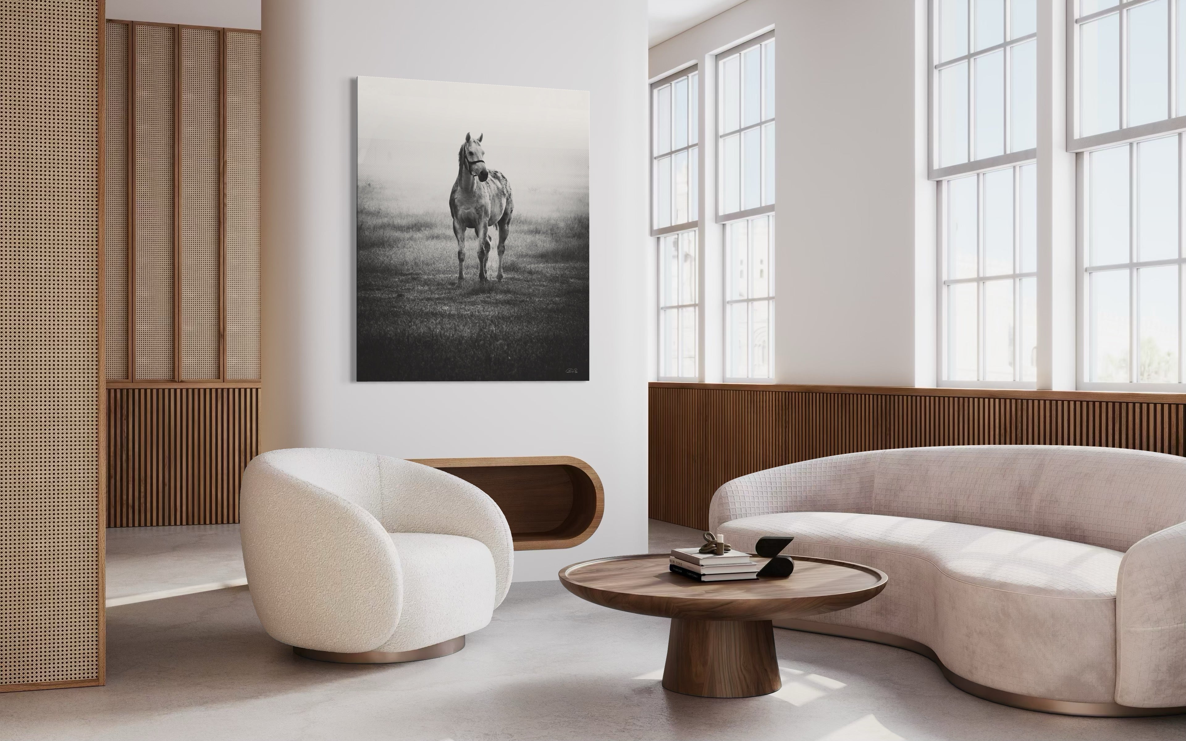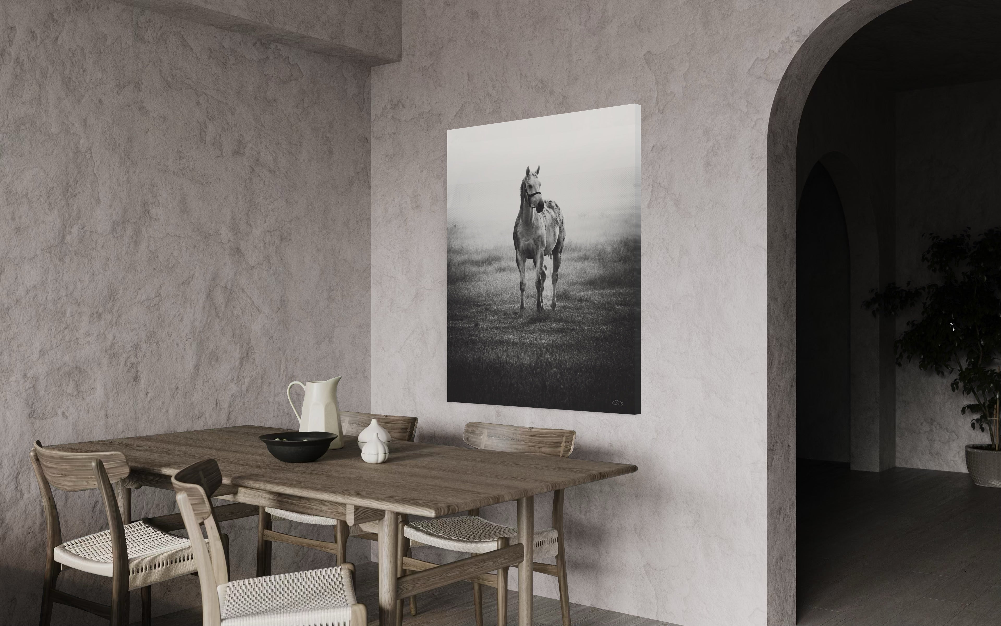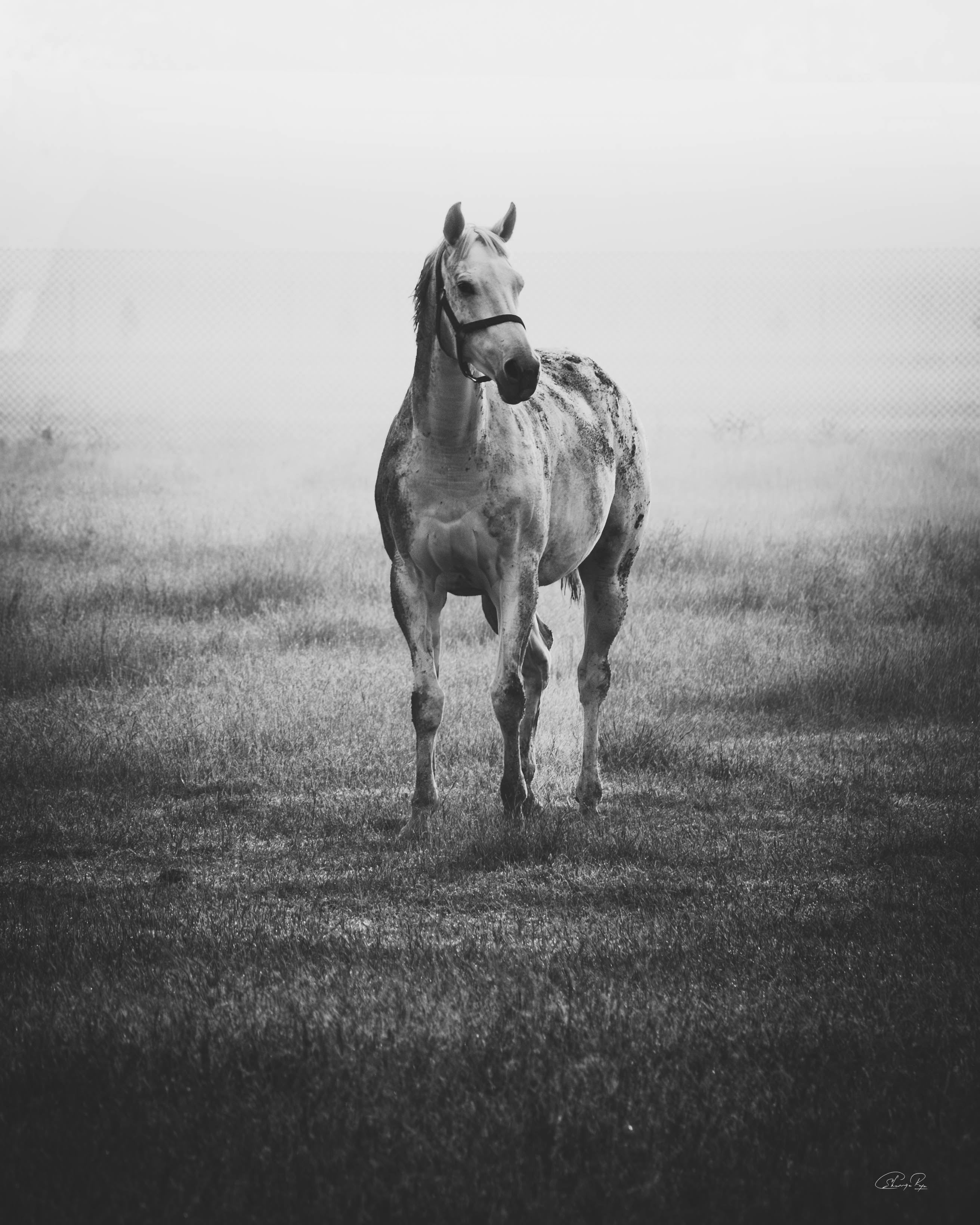 In the midst of a serene mid-December winter, as I found myself in the enchanting realm of a picturesque thoroughbred stud nestled in India, my gaze was instantly captured by a vision of ethereal beauty. A graceful grey mare, adorned with the gentle curves of impending maternity, stood with an eloquence that seemed to transcend the earthly plane. As a resident veterinarian at this splendid stud farm, my duties often commenced at the break of dawn. Yet, beyond my equine practice, I harbored a profound passion for the art of capturing life's exquisite moments through the lens of my camera. It was during one of my routine check-ups in the paddock that this celestial creature, with her eyes fixed intently upon me, beckoned me forward. Our connection, forged in that misty morning's embrace, felt nothing short of divine. Rays of sunlight delicately diffused through the backdrop, casting an otherworldly glow upon the scene. In an effort to amplify the mood, beauty, and transcendent essence of the moment, I chose to immortalize it through the medium of monochrome, allowing the very soul of the photograph to shine forth. Truly, I felt blessed to have been granted the privilege of capturing such a sacred encounter. For what more could I ask, being both a veterinarian and a connoisseur of fine art? This elegant masterpiece, encapsulating the essence of both fine art and the magnificence of thoroughbreds, shall remain a limited edition, with only twenty-one prints in existence. Those fortunate enough to possess one shall bear witness to the profound harmony between the realms of artistry and equine majesty.