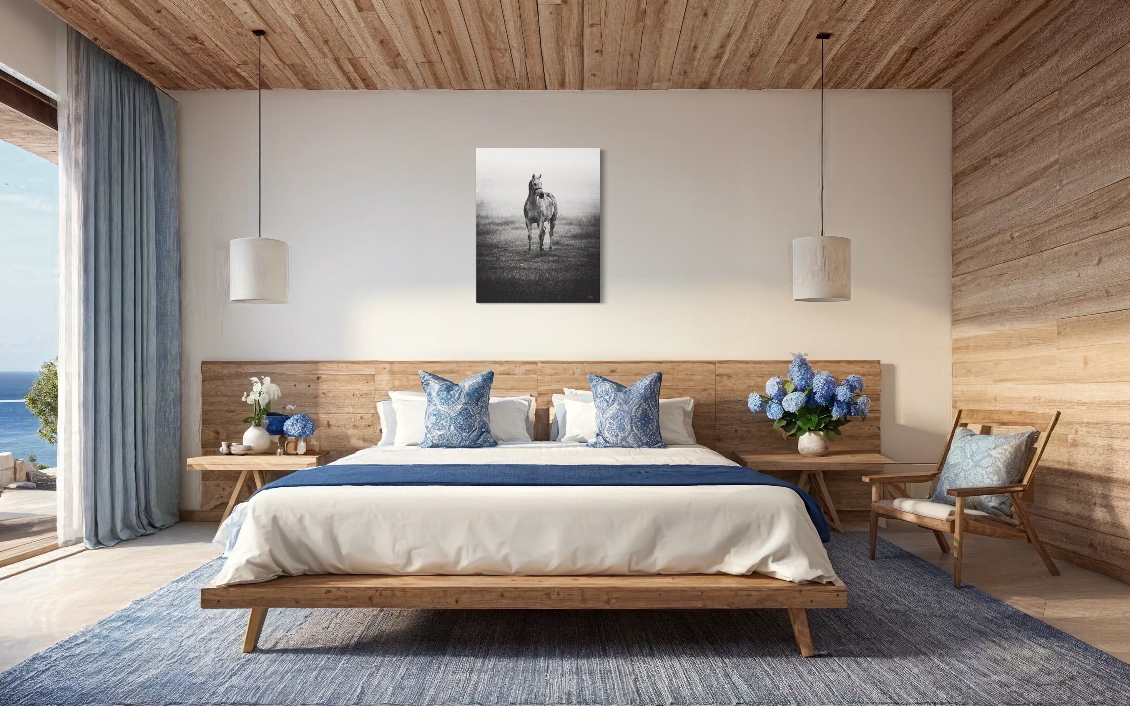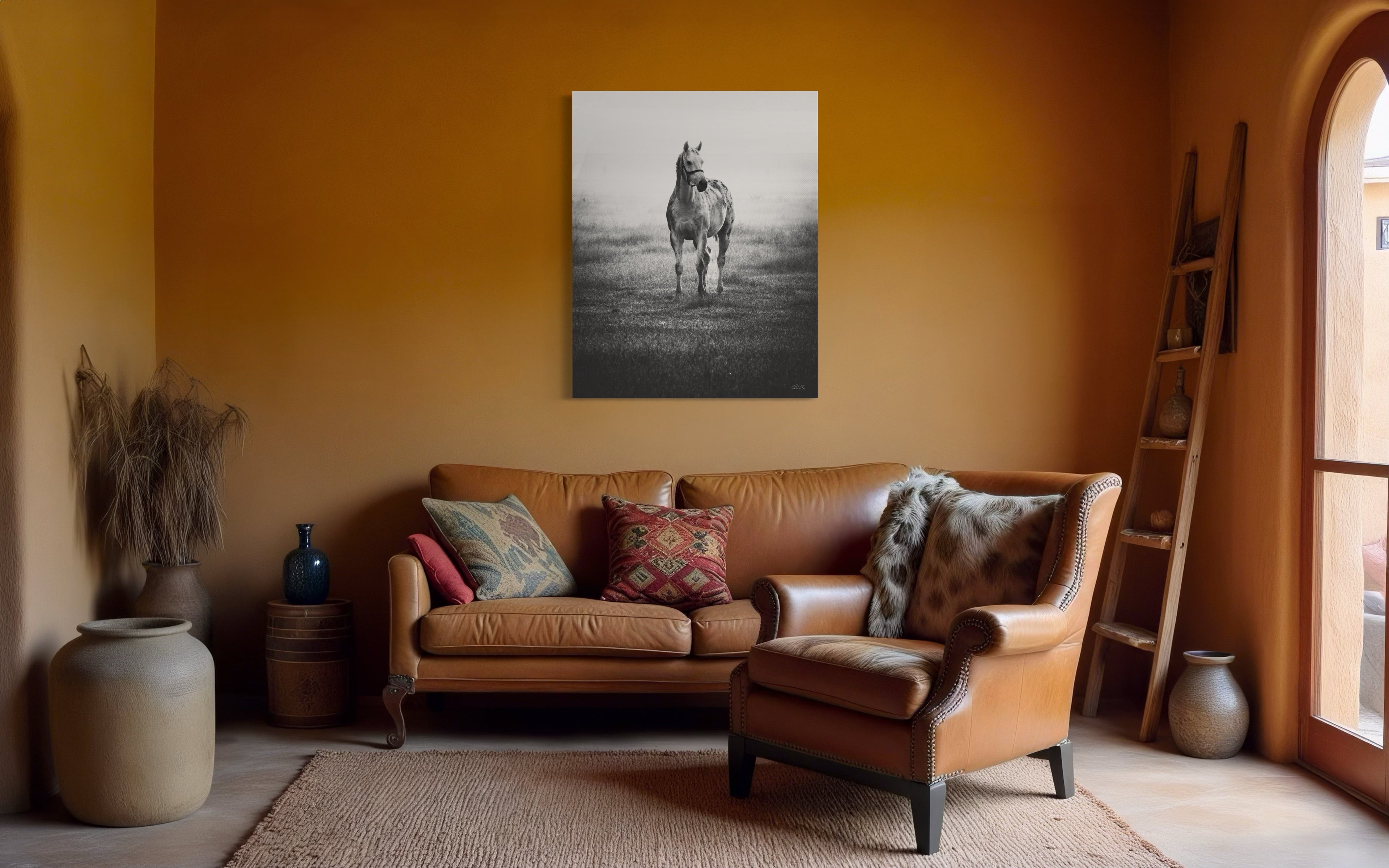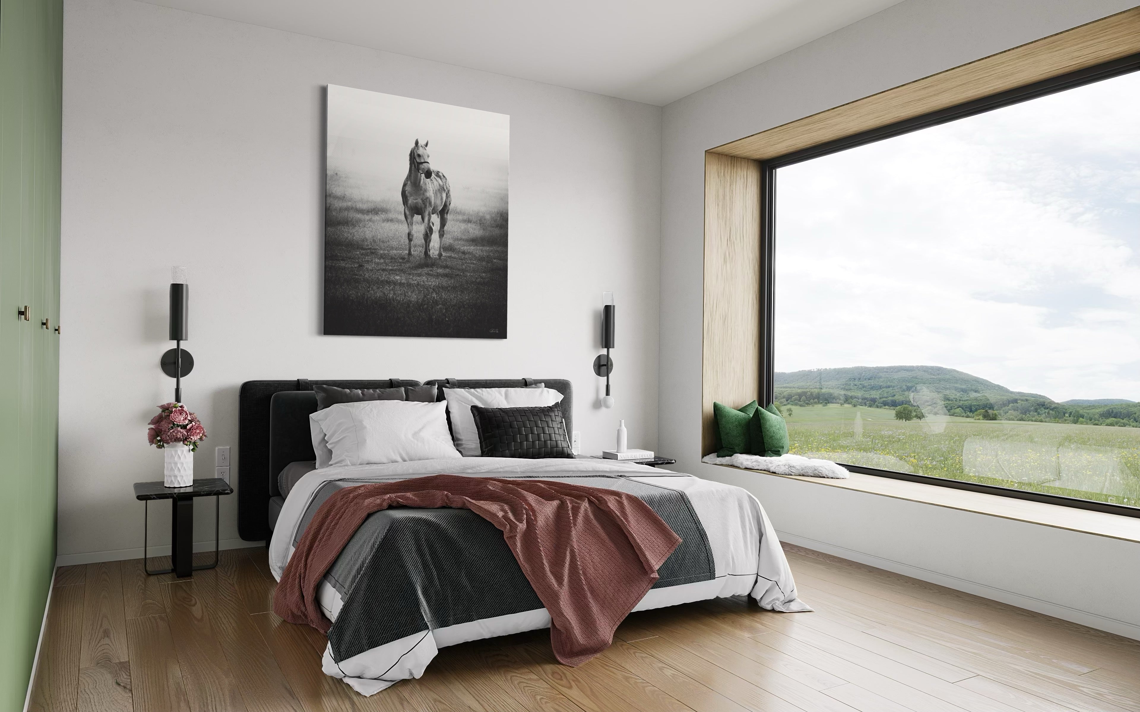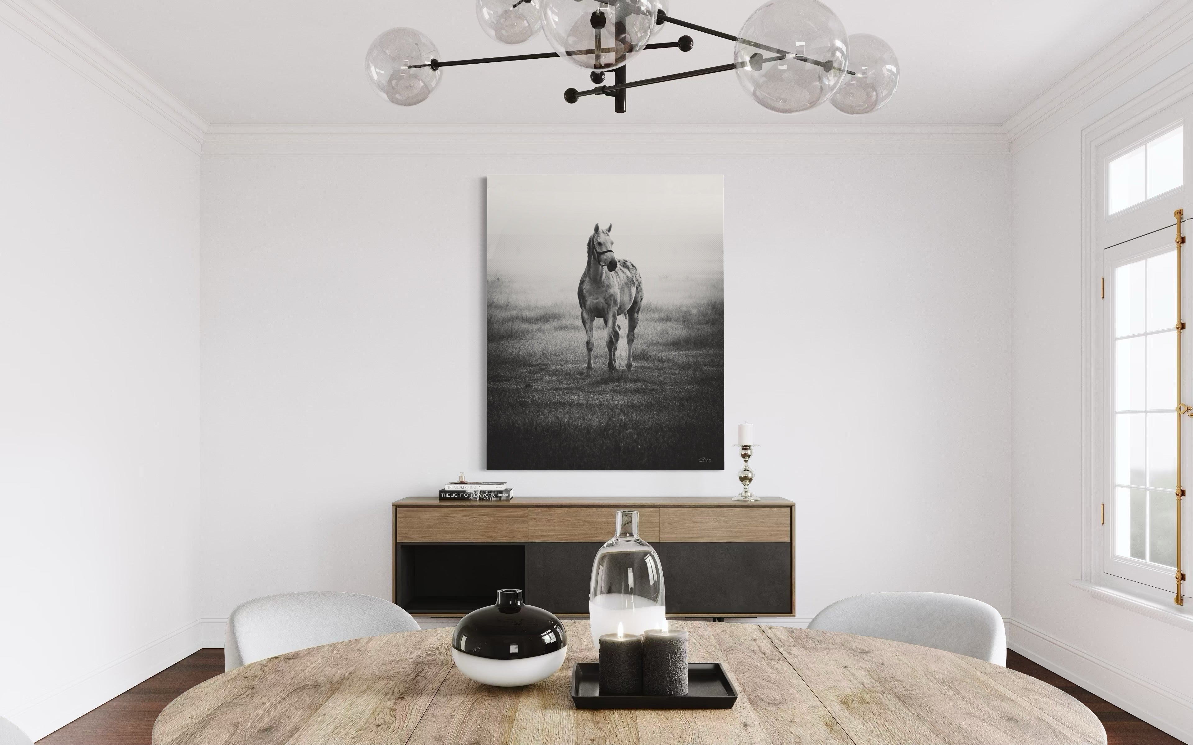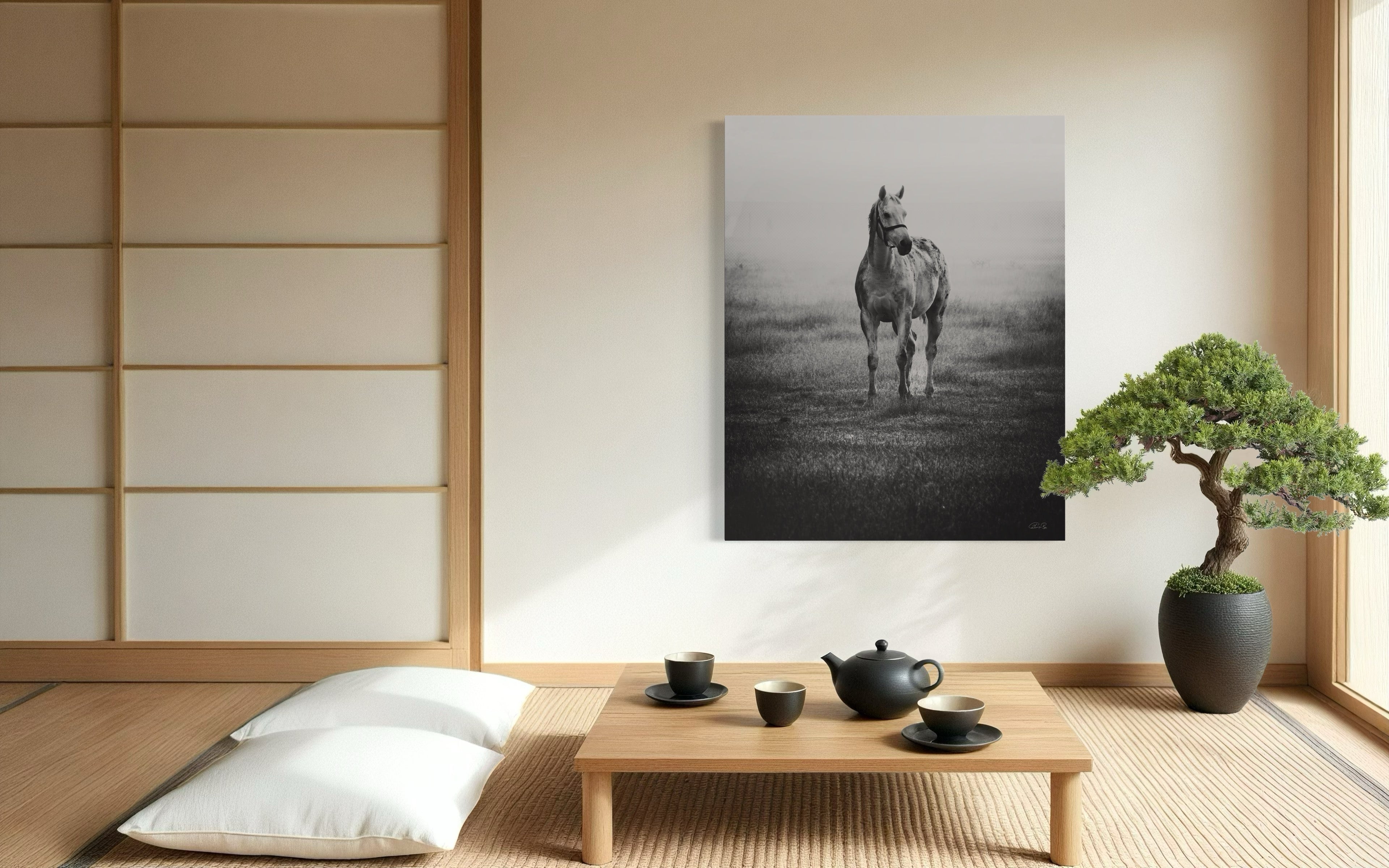 In the midst of a serene mid-December winter, as I found myself in the enchanting realm of a picturesque thoroughbred stud nestled in India, my gaze was instantly captured by a vision of ethereal beauty. A graceful grey mare, adorned with the gentle curves of impending maternity, stood with an eloquence that seemed to transcend the earthly plane. As a resident veterinarian at this splendid stud farm, my duties often commenced at the break of dawn. Yet, beyond my equine practice, I harbored a profound passion for the art of capturing life's exquisite moments through the lens of my camera. It was during one of my routine check-ups in the paddock that this celestial creature, with her eyes fixed intently upon me, beckoned me forward. Our connection, forged in that misty morning's embrace, felt nothing short of divine. Rays of sunlight delicately diffused through the backdrop, casting an otherworldly glow upon the scene. In an effort to amplify the mood, beauty, and transcendent essence of the moment, I chose to immortalize it through the medium of monochrome, allowing the very soul of the photograph to shine forth. Truly, I felt blessed to have been granted the privilege of capturing such a sacred encounter. For what more could I ask, being both a veterinarian and a connoisseur of fine art? This elegant masterpiece, encapsulating the essence of both fine art and the magnificence of thoroughbreds, shall remain a limited edition, with only twenty-one prints in existence. Those fortunate enough to possess one shall bear witness to the profound harmony between the realms of artistry and equine majesty.