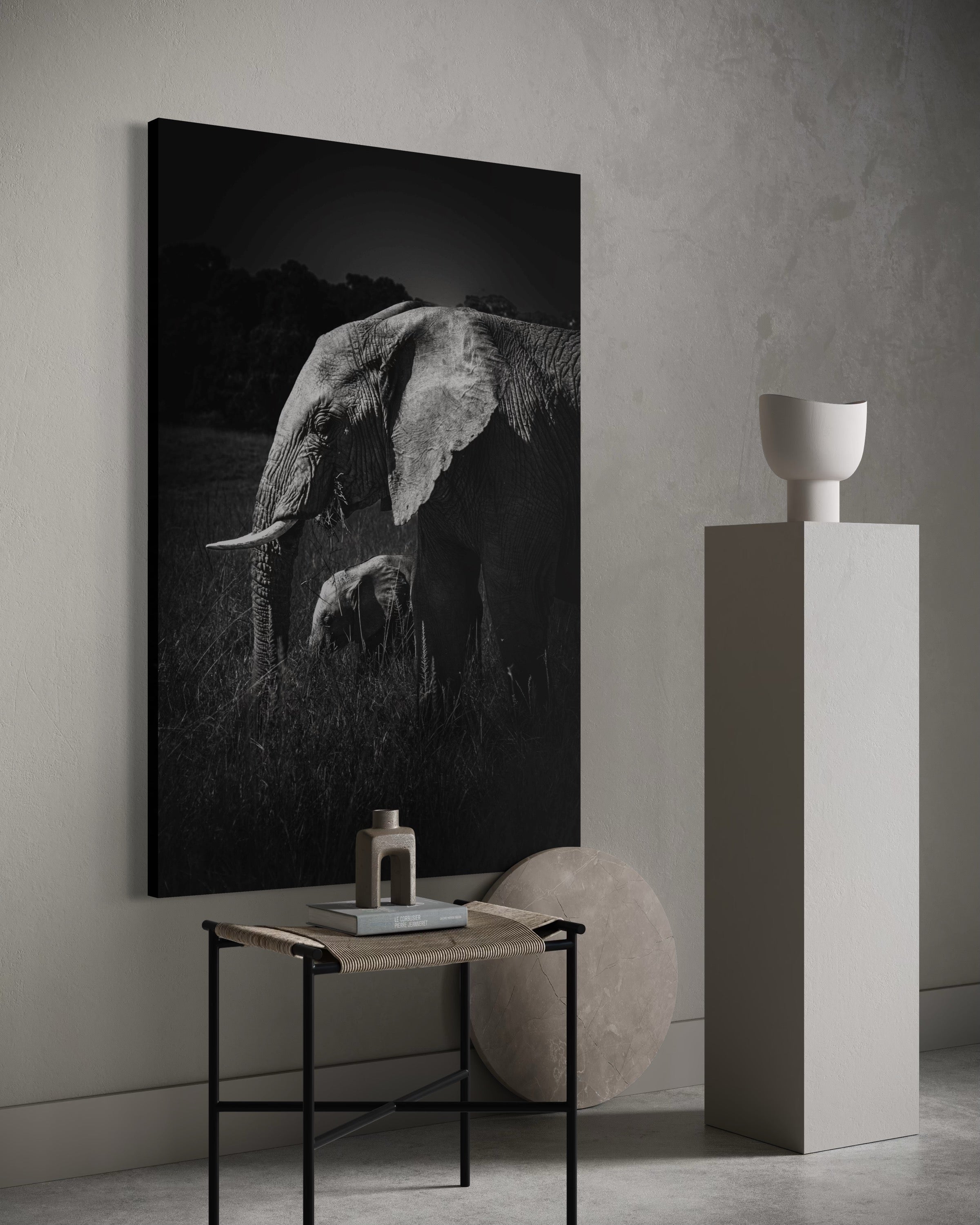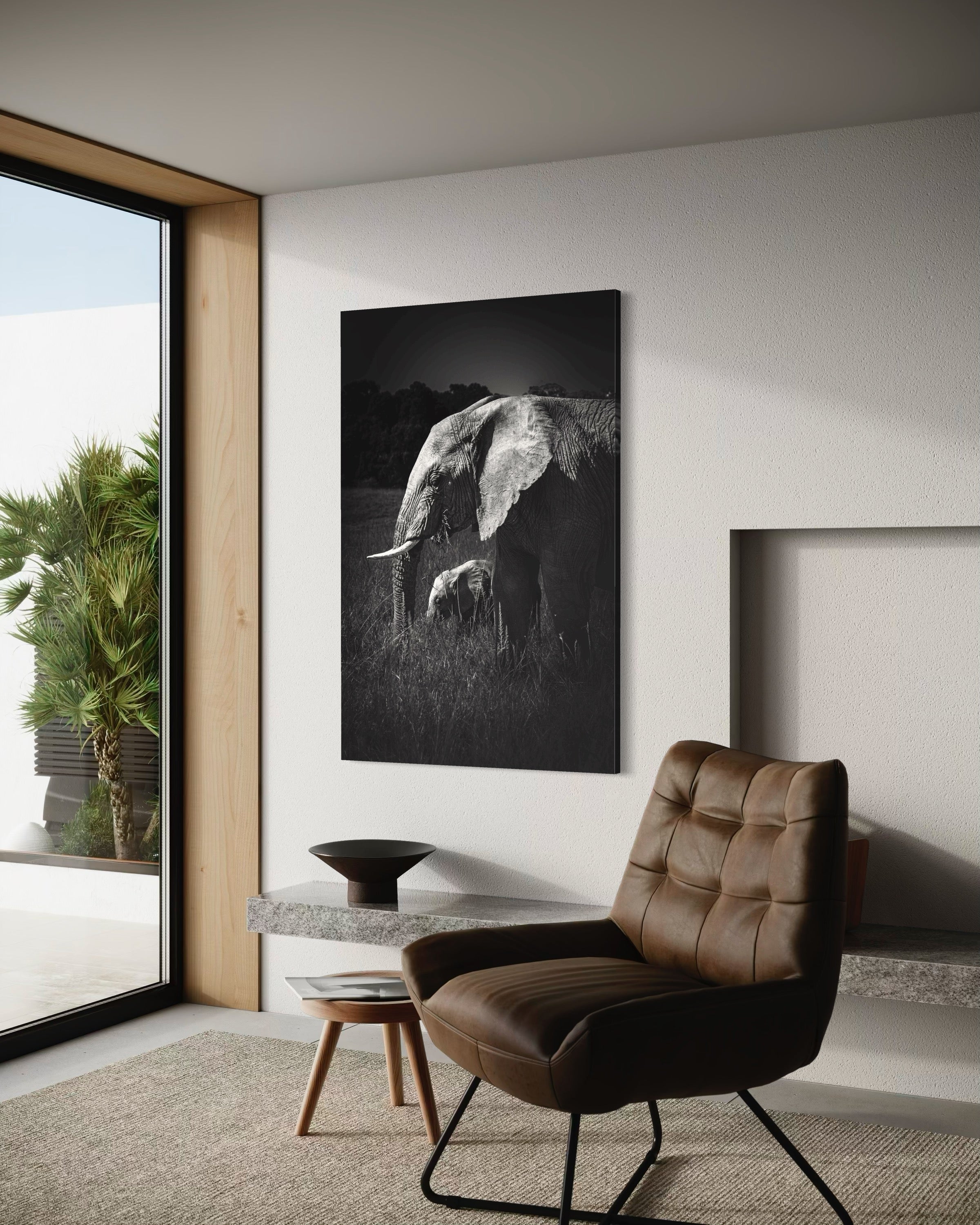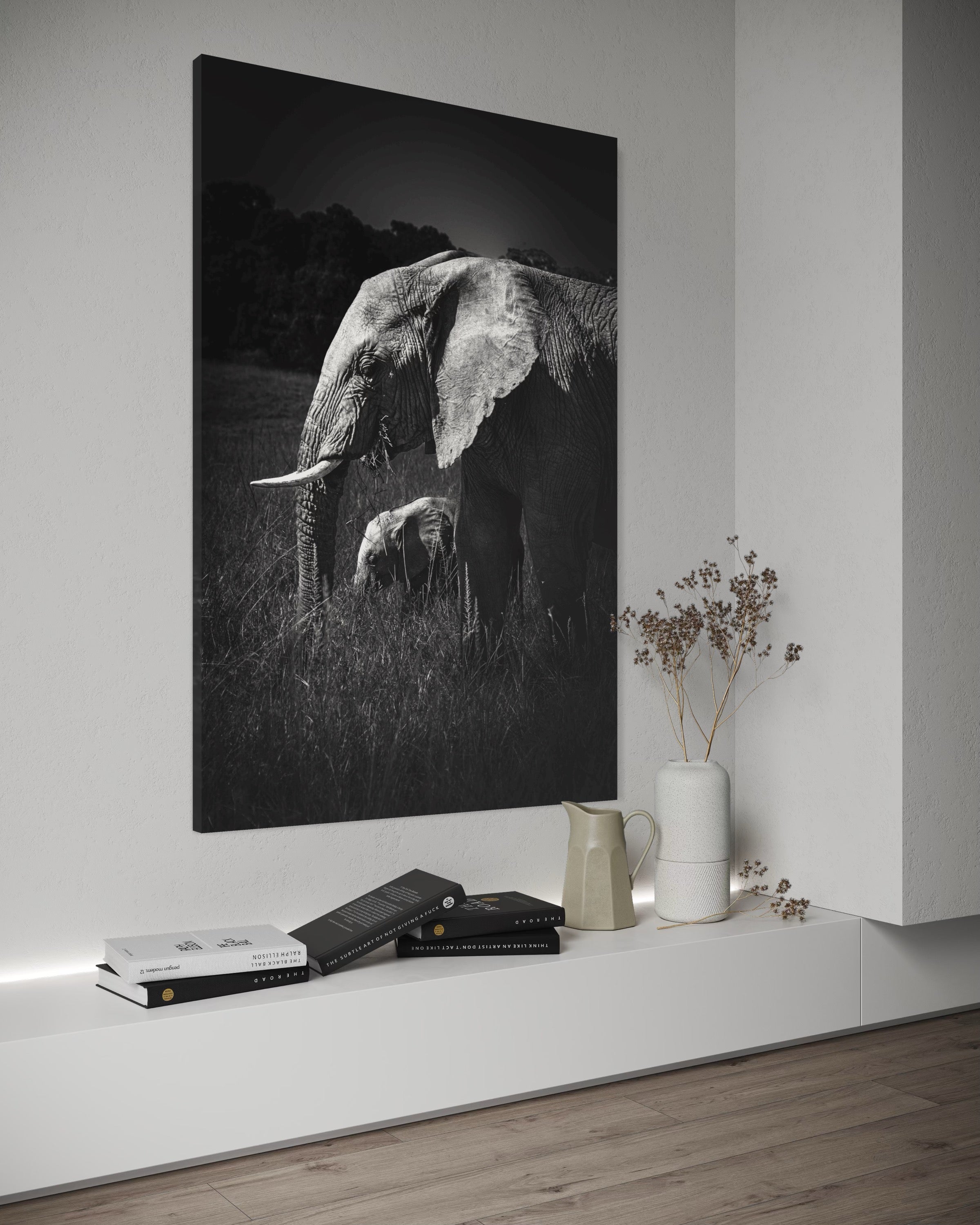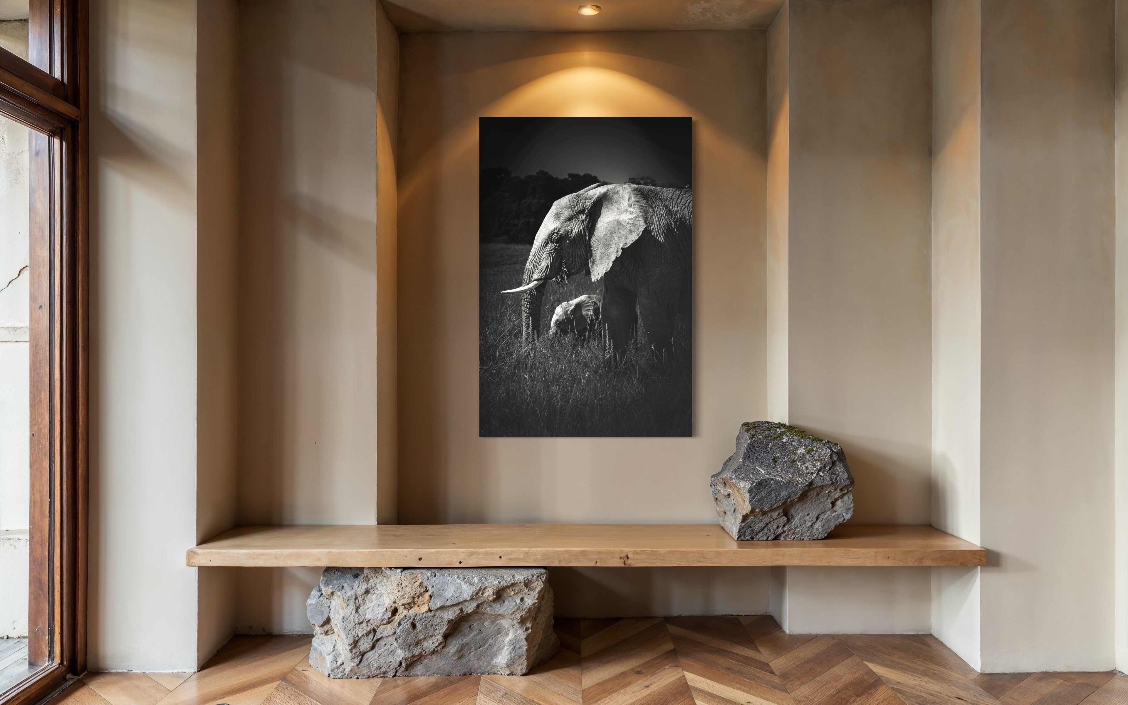 As a fine art photographer, My artistic affinity for black and white photography finds its deepest expression when elephants become my muse. Their textured skin, soulful eyes, and commanding presence come alive in monochrome with profound emotion. On a quiet morning safari in the heart of Masai Mara, I encountered a serene herd of elephants grazing gracefully across the golden plains. Amidst their slow, deliberate movements, one tender moment reached out and held me still — a few-month-old calf, nestled close to its mother, exploring the world with innocent curiosity and complete trust.Through my lens, I captured an exquisite instant: the young calf framed perfectly between the mother’s strong, towering legs, her trunk gently curved around it like a protective veil. The contrast between their sizes — one monumental, one miniature — echoed a poetic symmetry, like a smaller echo carved from the same essence. It was more than just a visual alignment; it was a portrait of maternal devotion, of legacy, of life carried forward.Rendered in black and white, this fine art print strips away distraction, revealing only the raw intimacy, strength, and vulnerability of this bond. It speaks softly of protection, of quiet beginnings, and the enduring rhythm of the wild — where every giant once stood small in the shelter of love.