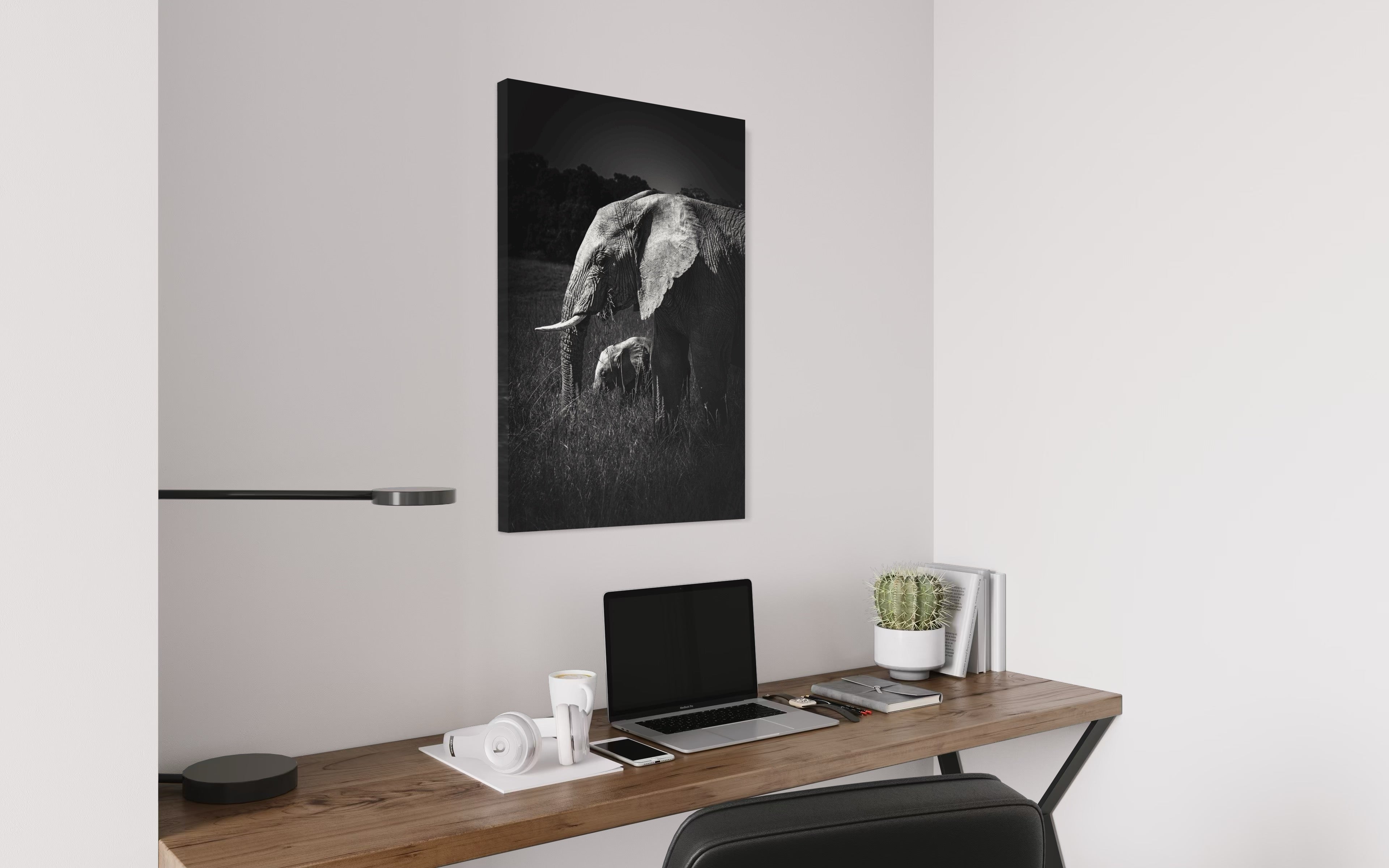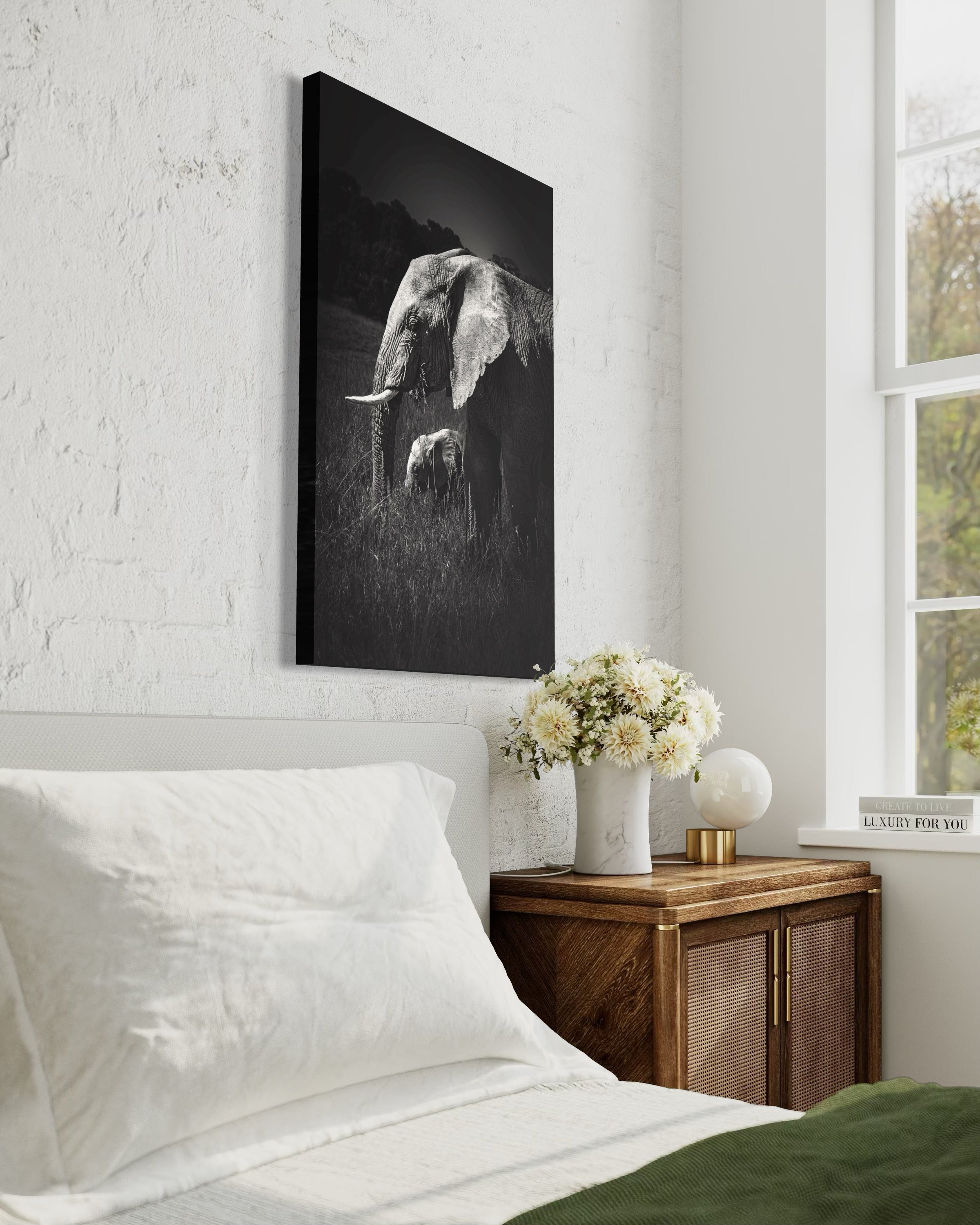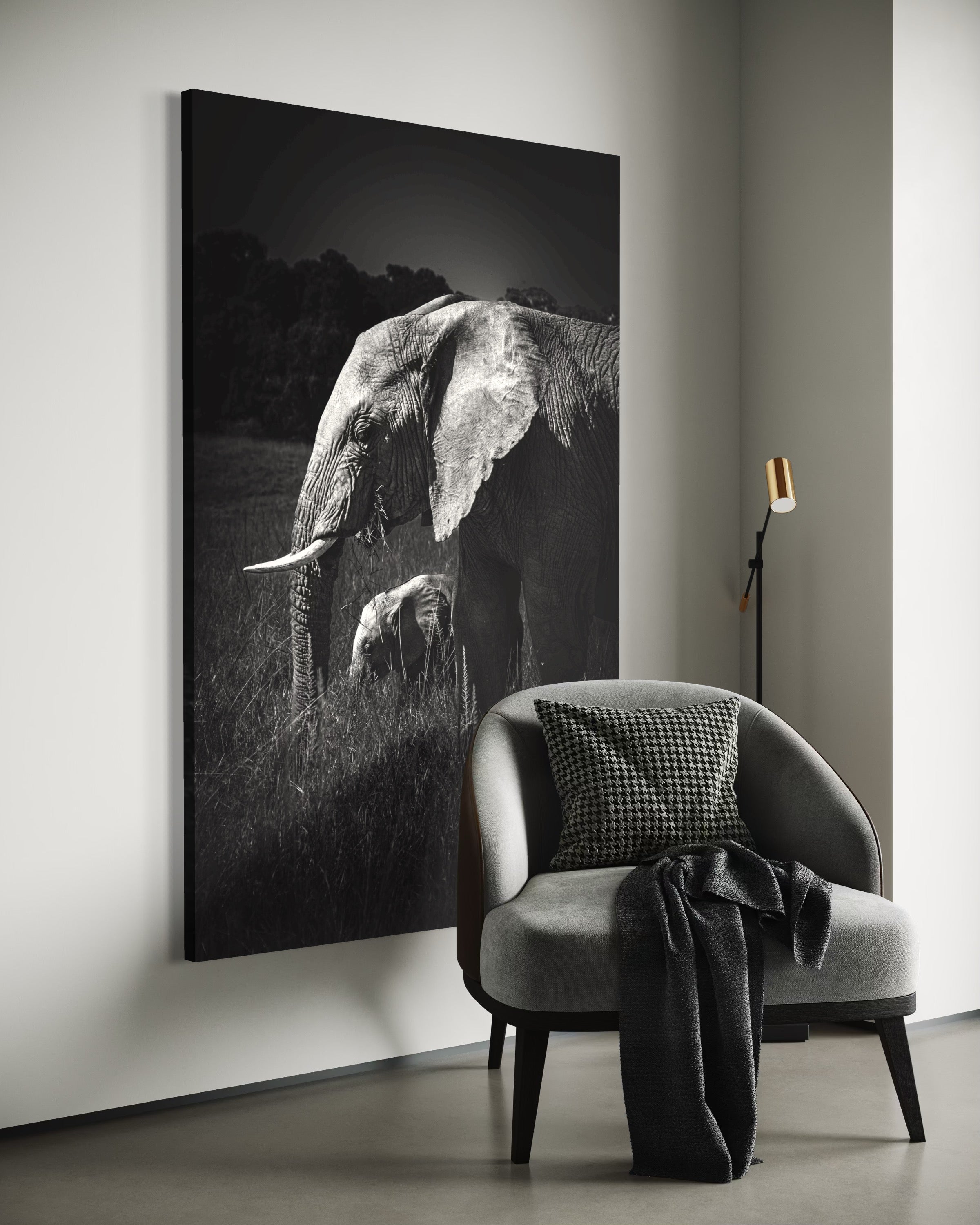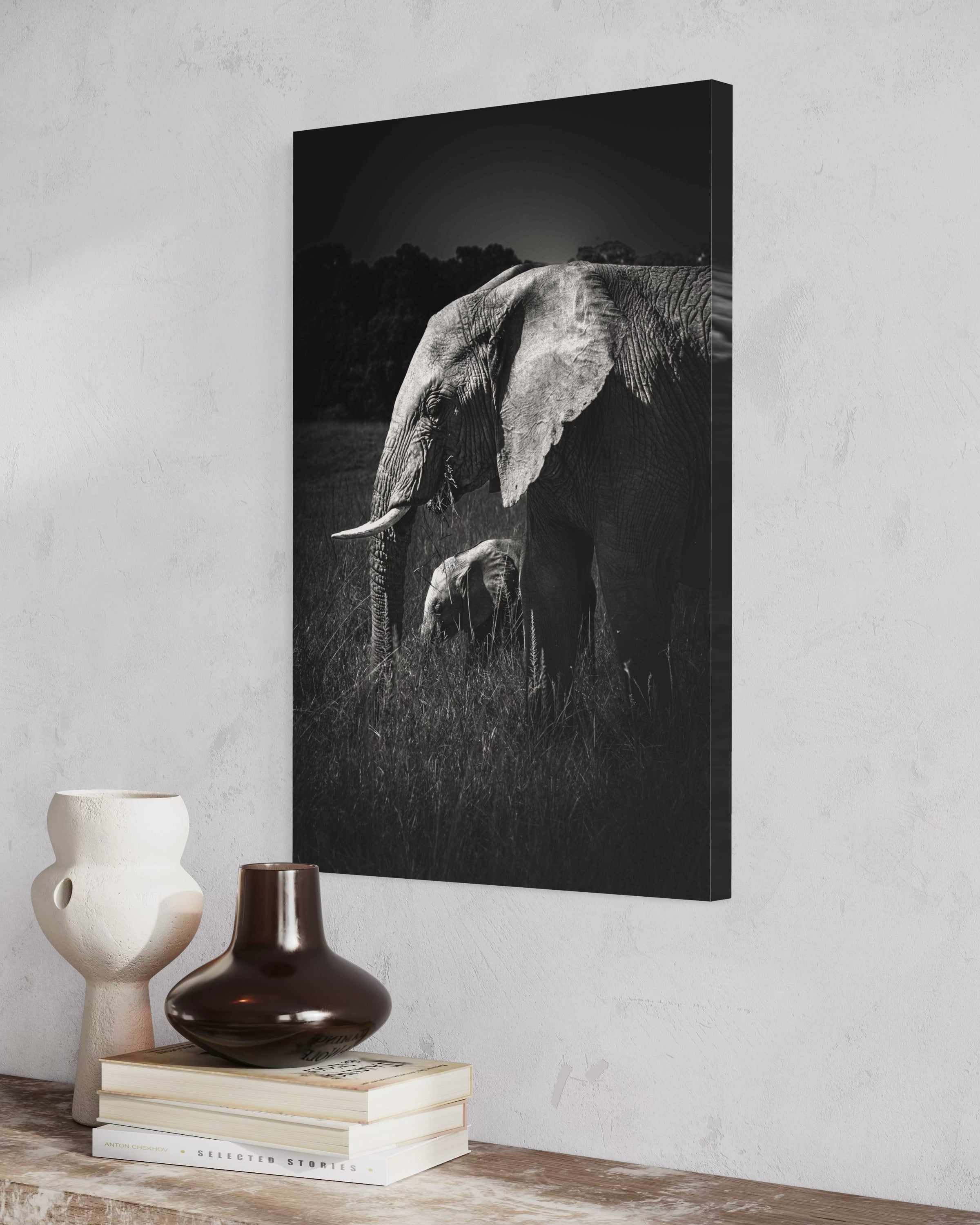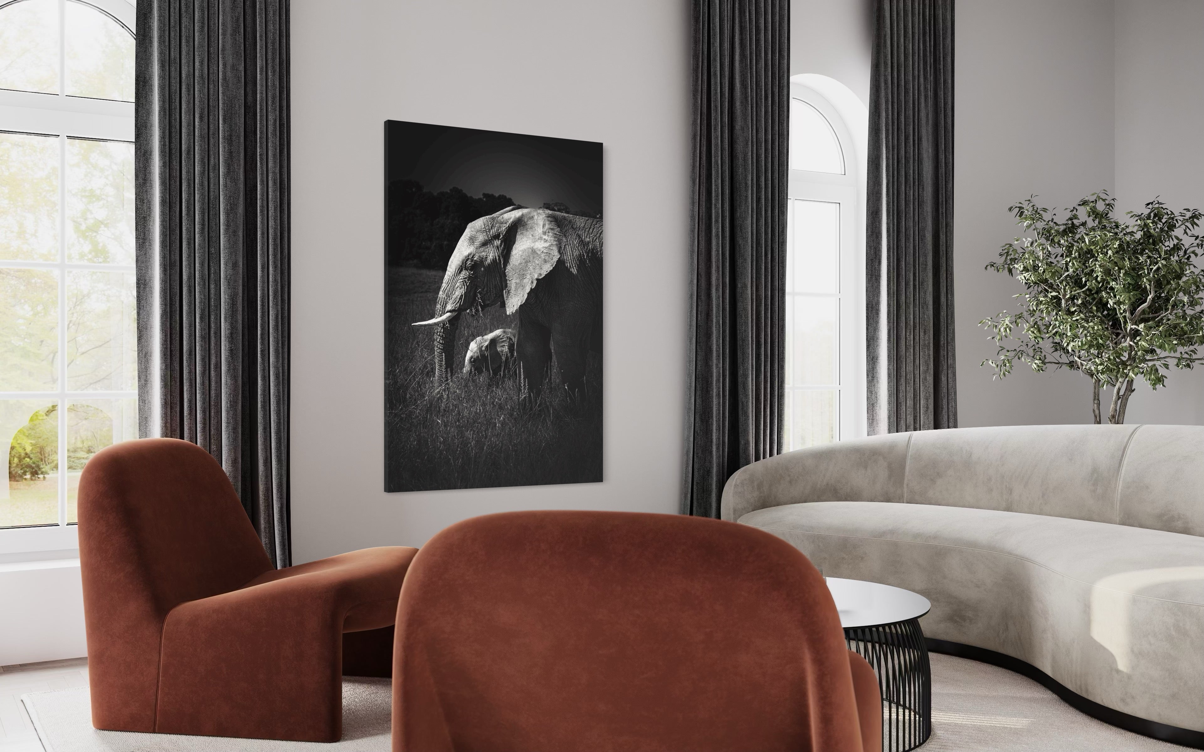 As a fine art photographer, My artistic affinity for black and white photography finds its deepest expression when elephants become my muse. Their textured skin, soulful eyes, and commanding presence come alive in monochrome with profound emotion. On a quiet morning safari in the heart of Masai Mara, I encountered a serene herd of elephants grazing gracefully across the golden plains. Amidst their slow, deliberate movements, one tender moment reached out and held me still — a few-month-old calf, nestled close to its mother, exploring the world with innocent curiosity and complete trust.Through my lens, I captured an exquisite instant: the young calf framed perfectly between the mother’s strong, towering legs, her trunk gently curved around it like a protective veil. The contrast between their sizes — one monumental, one miniature — echoed a poetic symmetry, like a smaller echo carved from the same essence. It was more than just a visual alignment; it was a portrait of maternal devotion, of legacy, of life carried forward.Rendered in black and white, this fine art print strips away distraction, revealing only the raw intimacy, strength, and vulnerability of this bond. It speaks softly of protection, of quiet beginnings, and the enduring rhythm of the wild — where every giant once stood small in the shelter of love.