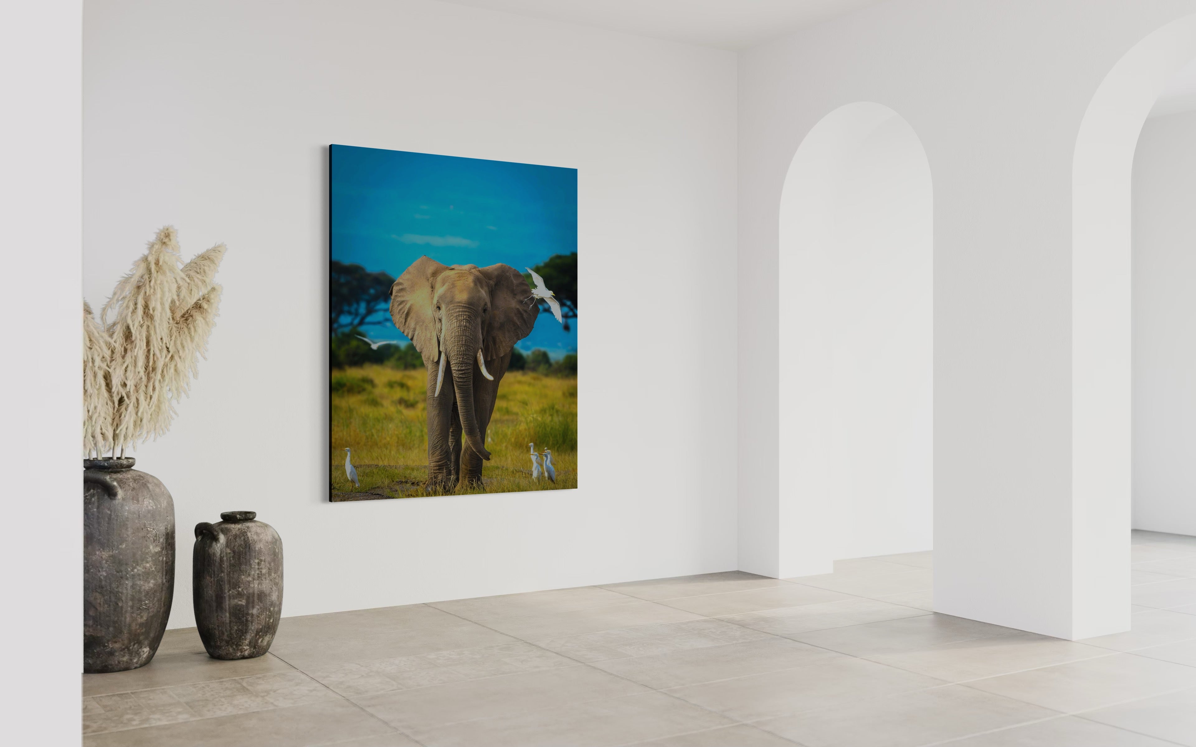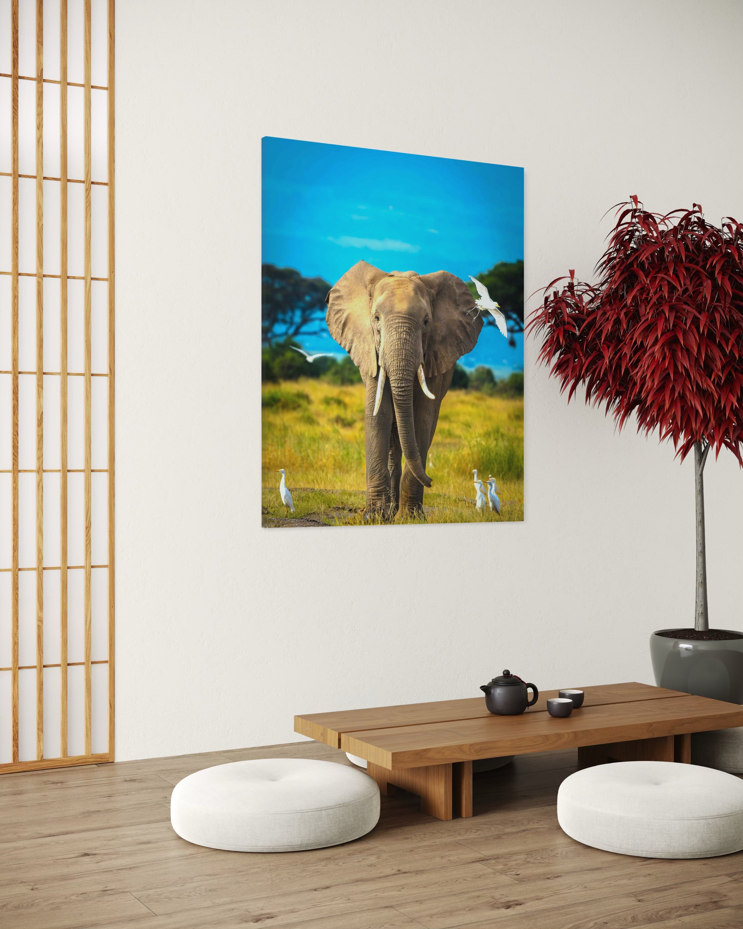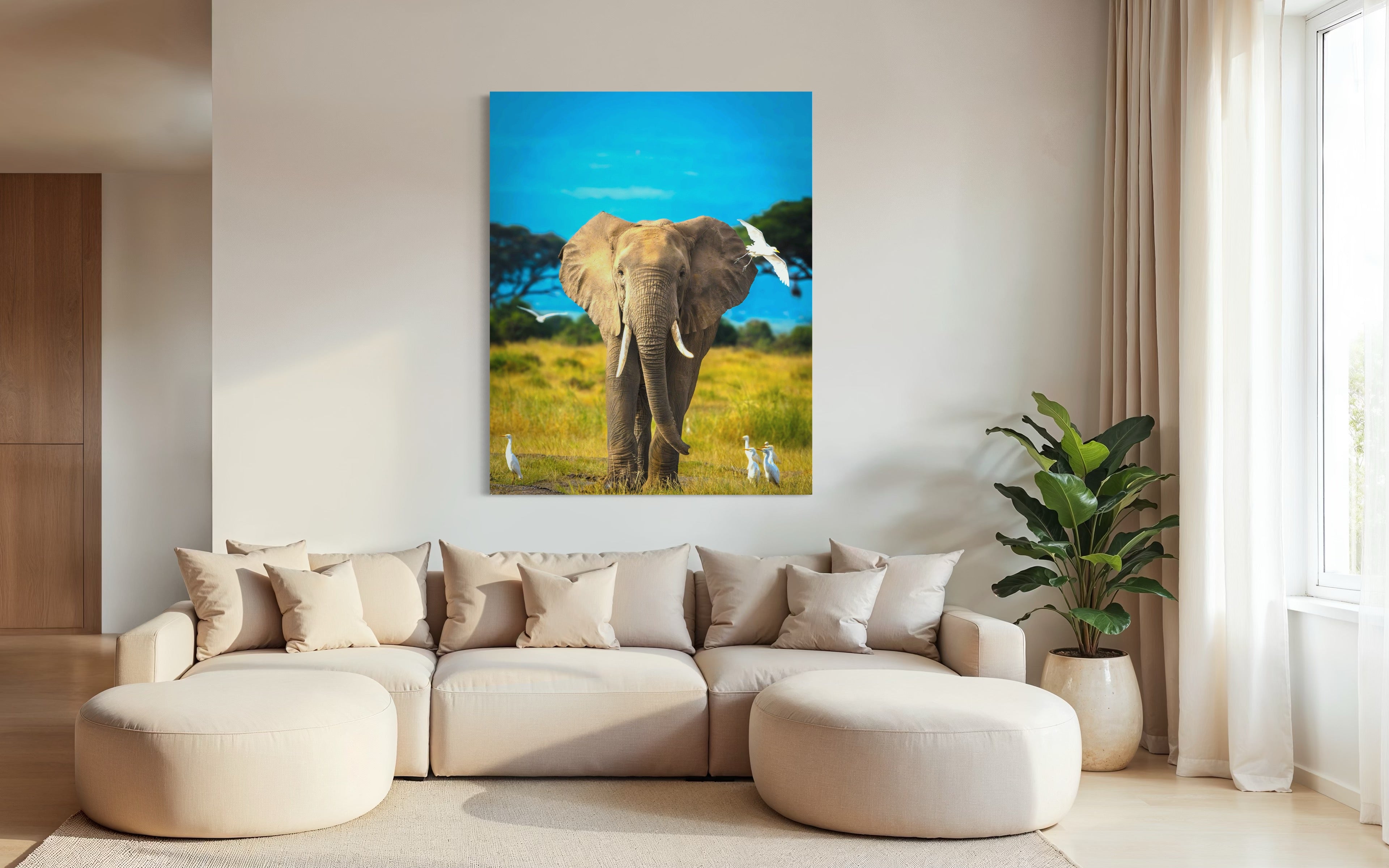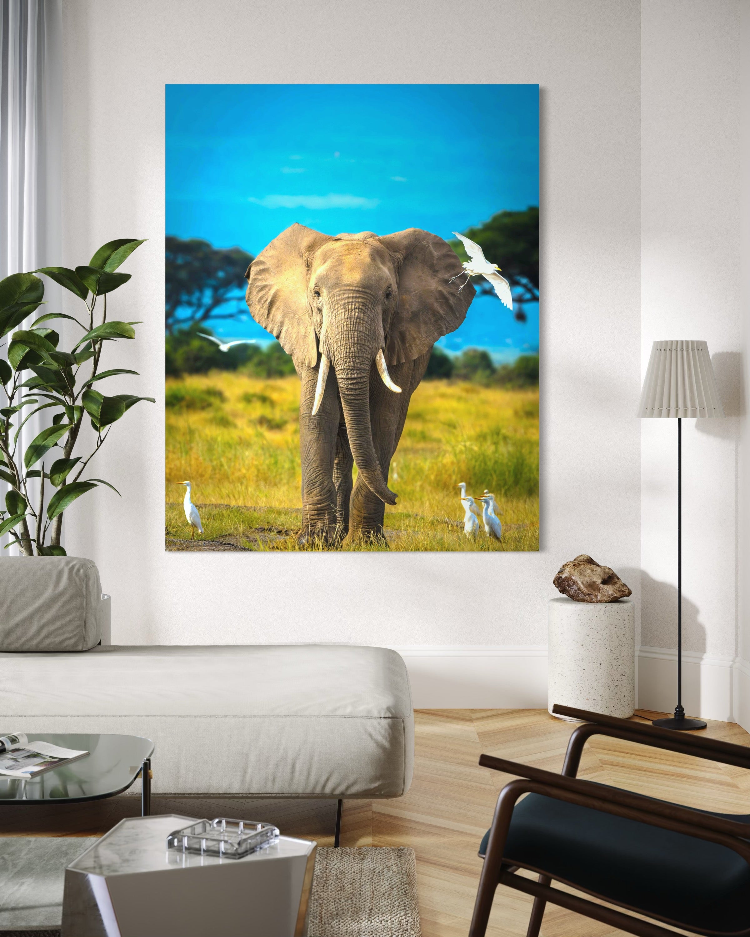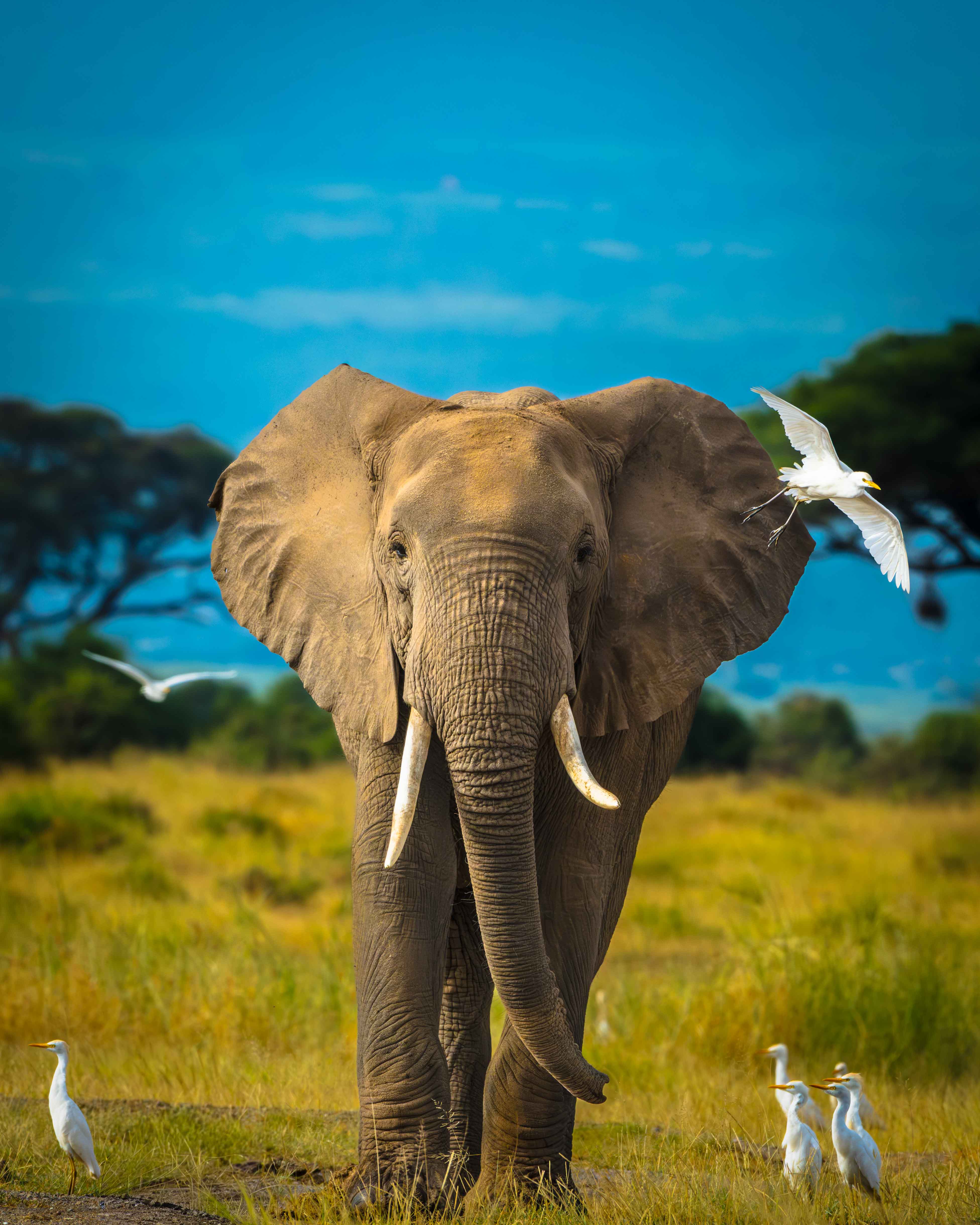 This is not merely an animal captured in frame. This is the living embodiment of the wild’s memory, a creature shaped by dust, time, and the rhythm of migration. His posture is calm yet commanding, his tusks gleaming with stories untold. Surrounding him, a chorus of white egrets — delicate and free — move without fear, their presence a gentle reminder of nature’s quiet symbiosis.