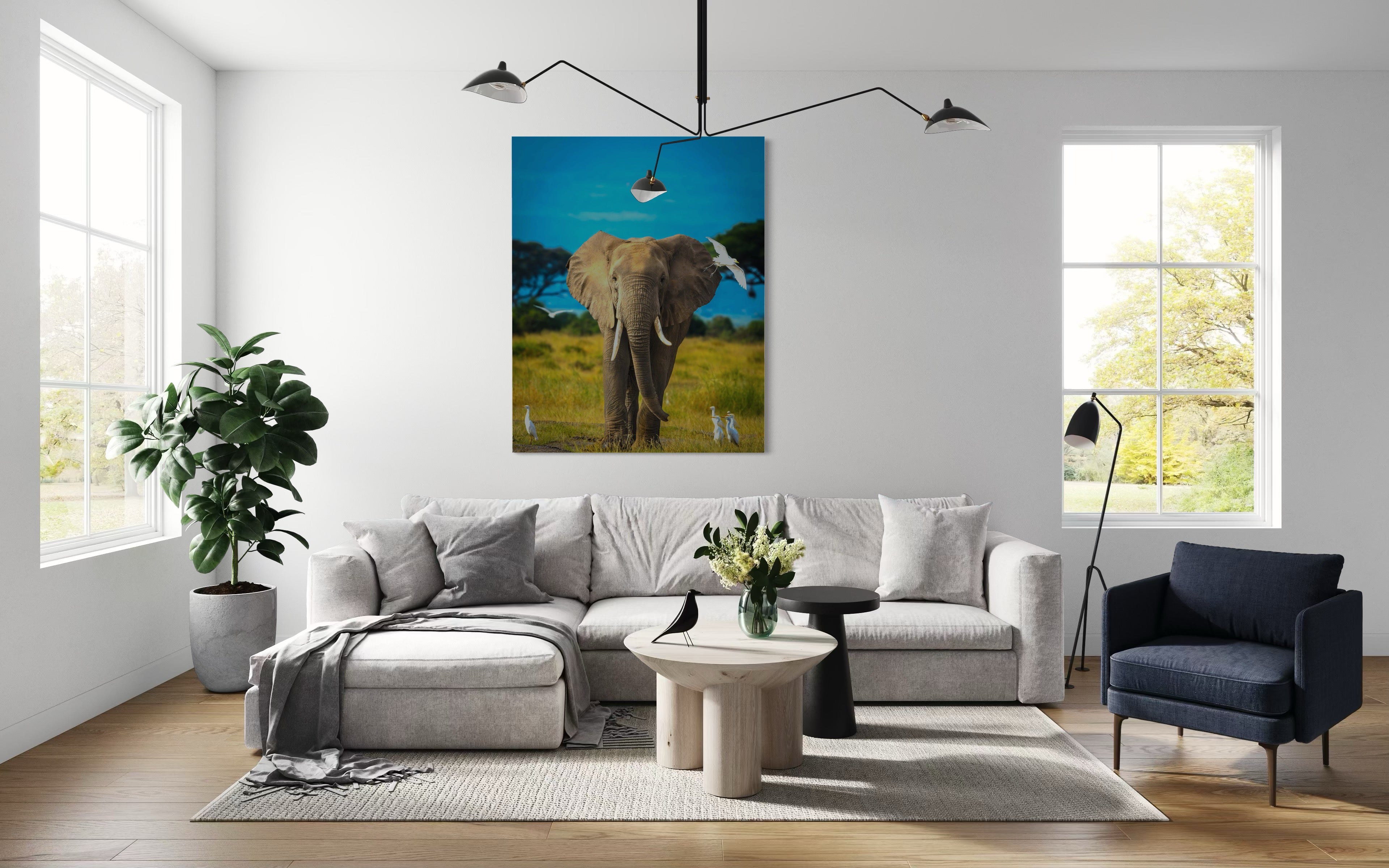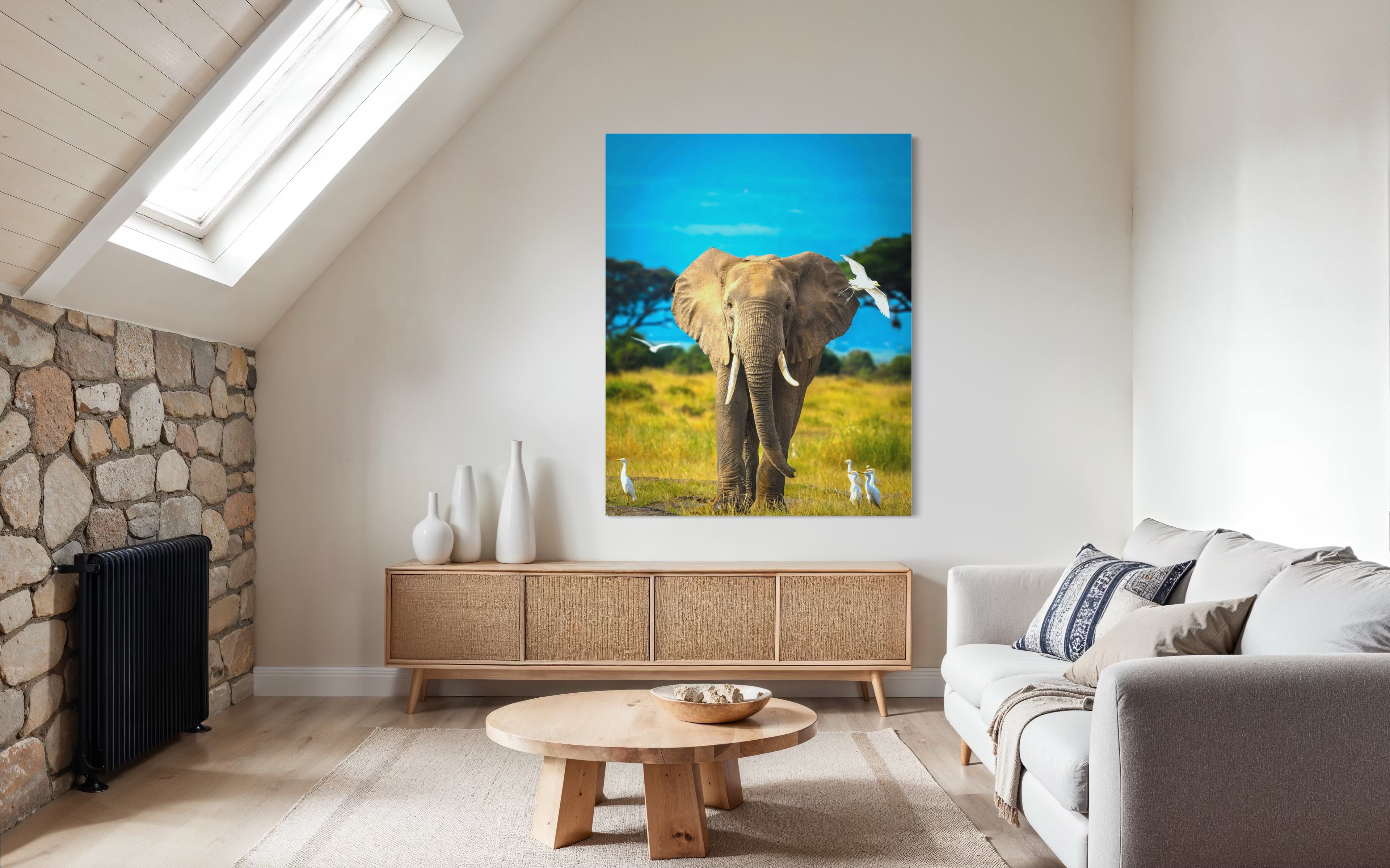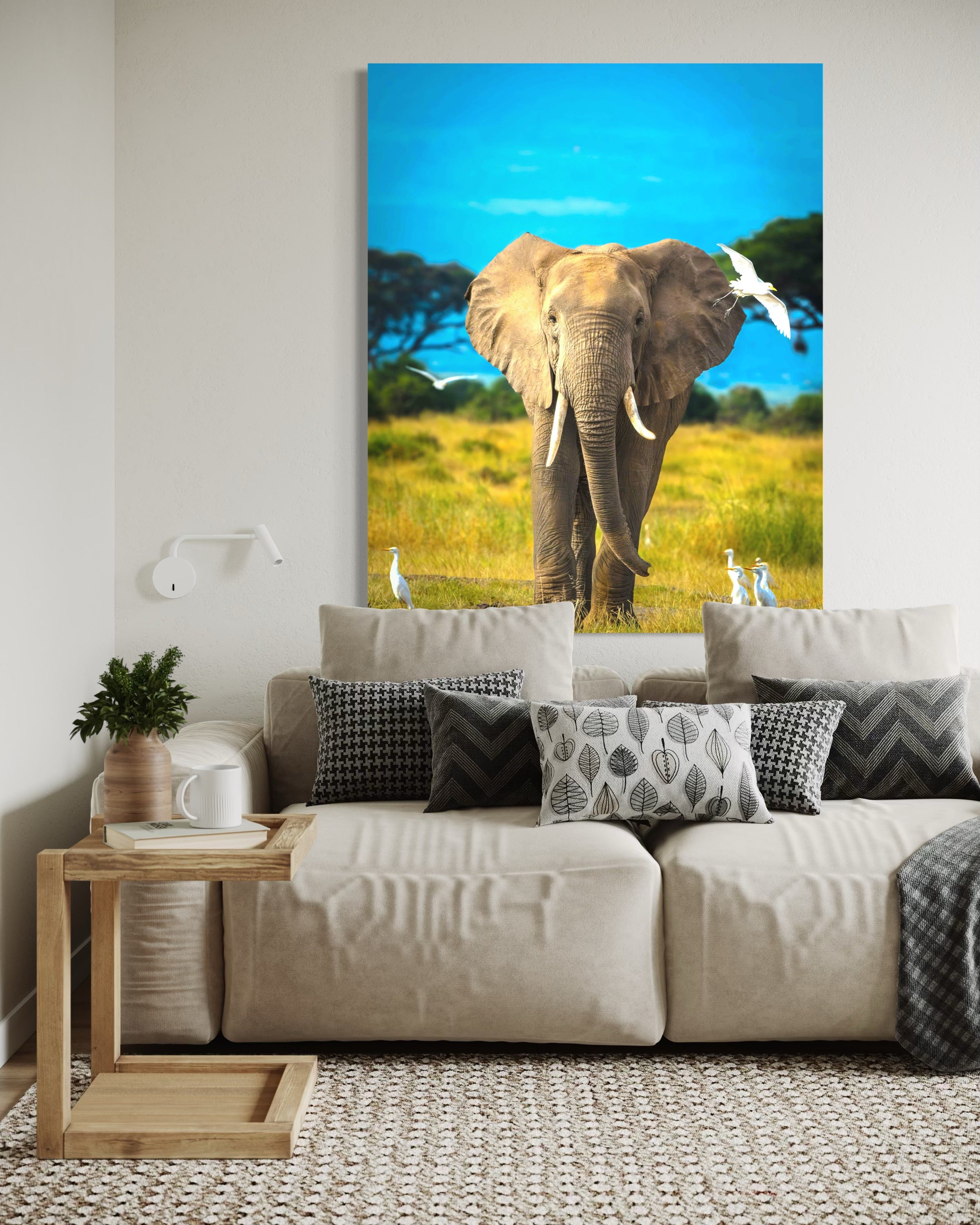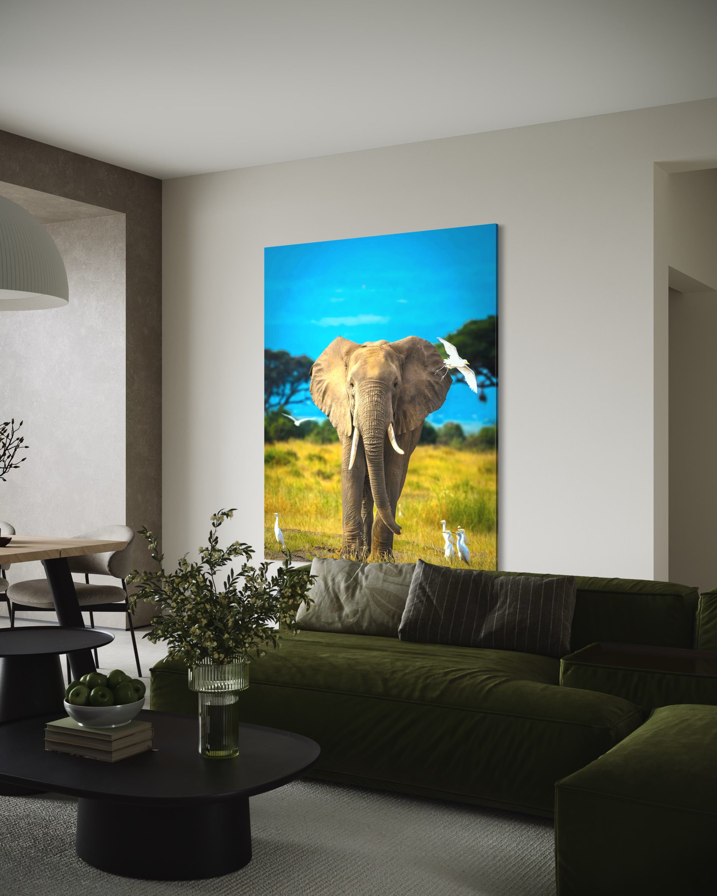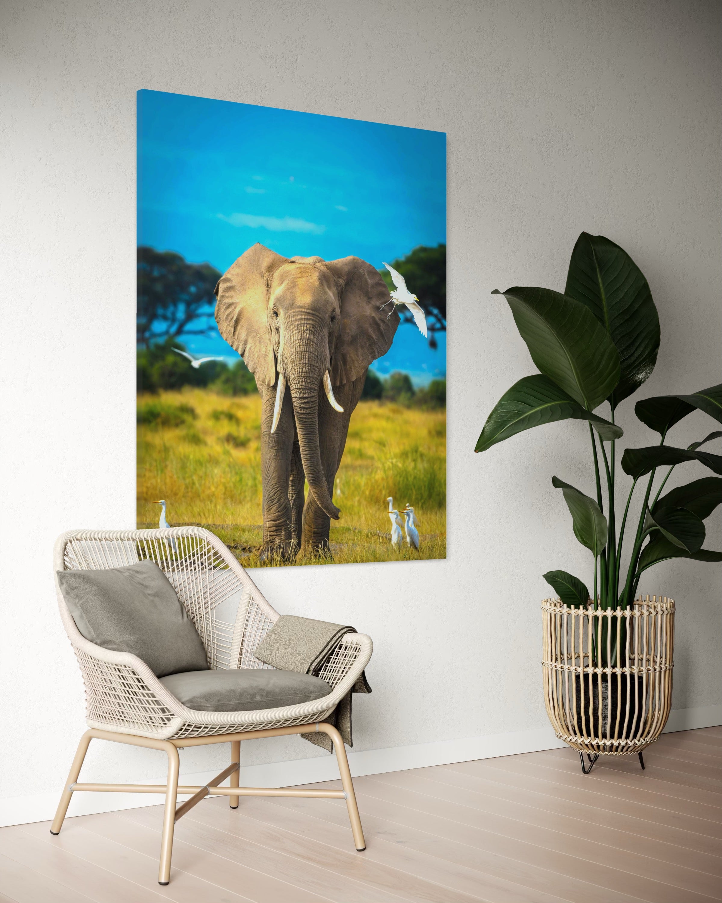 This is not merely an animal captured in frame. This is the living embodiment of the wild’s memory, a creature shaped by dust, time, and the rhythm of migration. His posture is calm yet commanding, his tusks gleaming with stories untold. Surrounding him, a chorus of white egrets — delicate and free — move without fear, their presence a gentle reminder of nature’s quiet symbiosis.