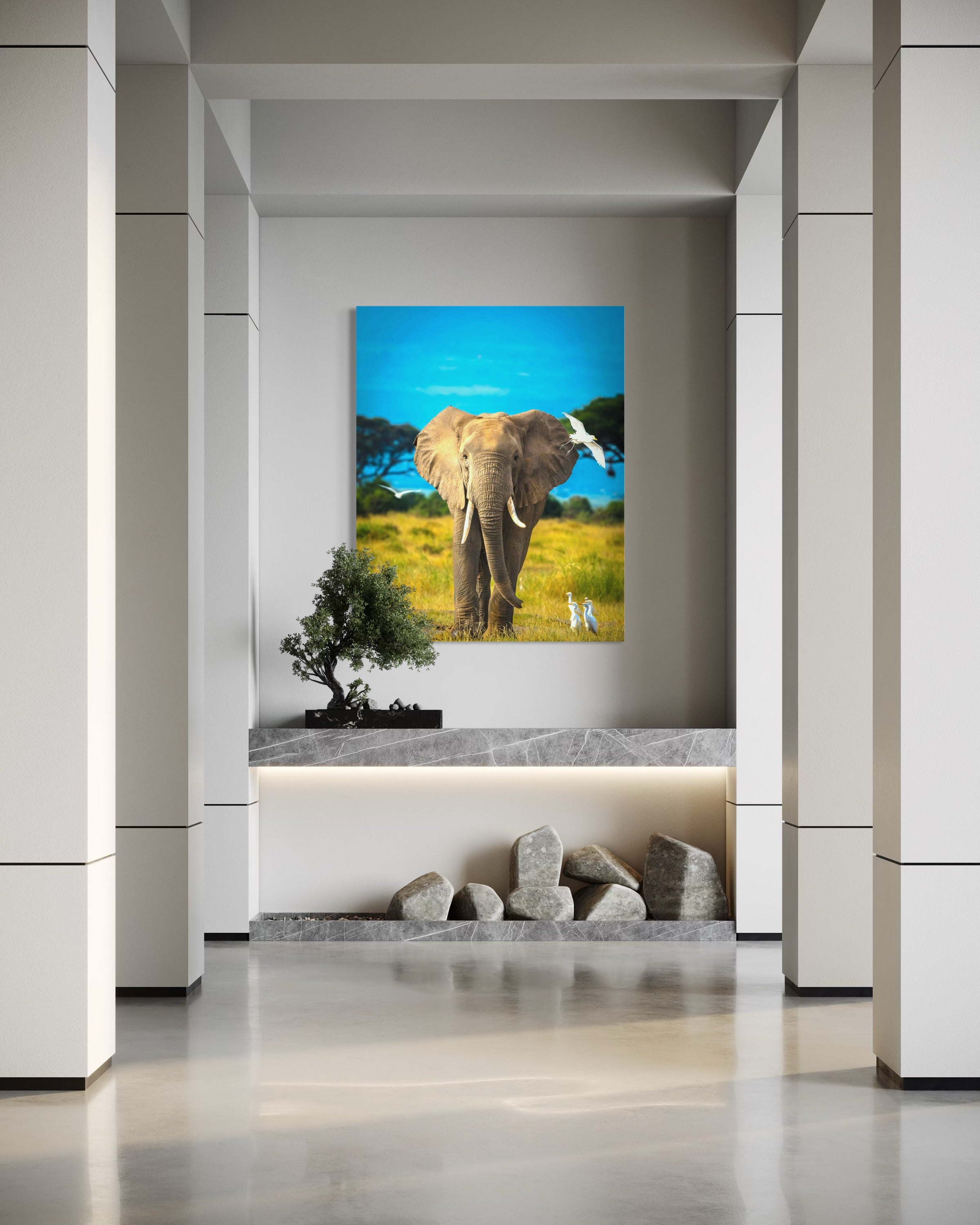 This fine art print is a tribute to strength wrapped in serenity, to the quiet confidence of the land’s great monarch, and to the tender balance that binds all creatures beneath the African sun.