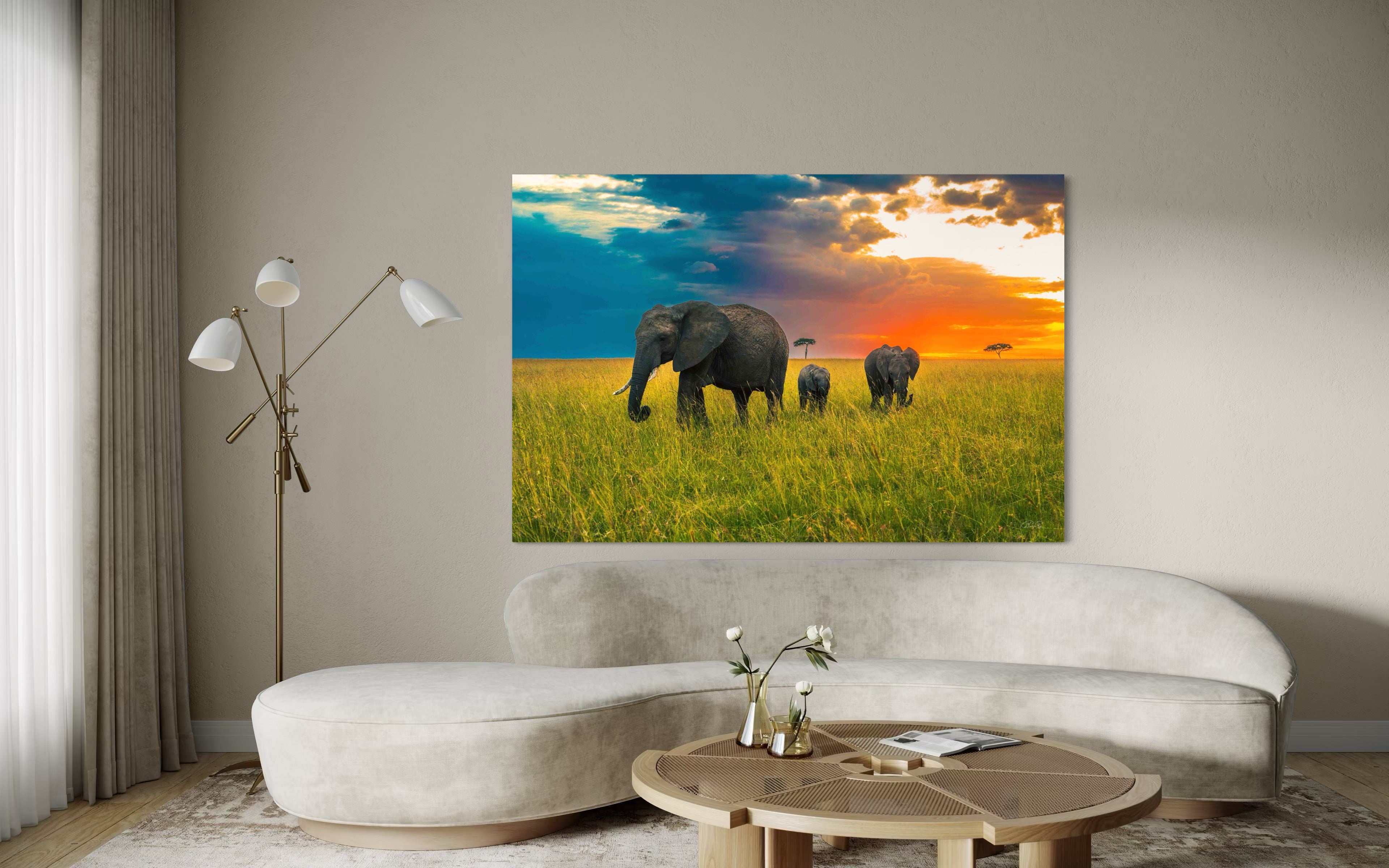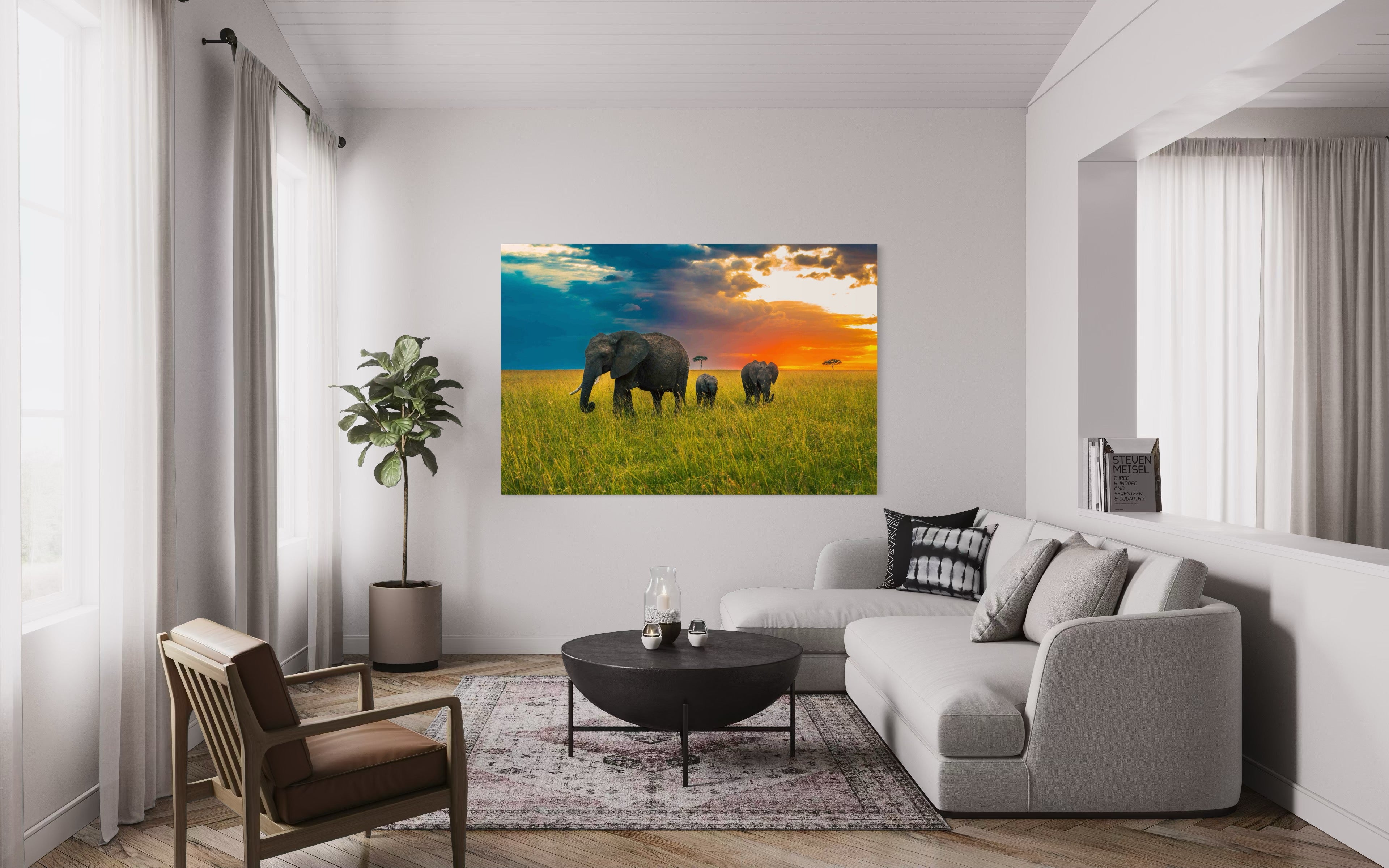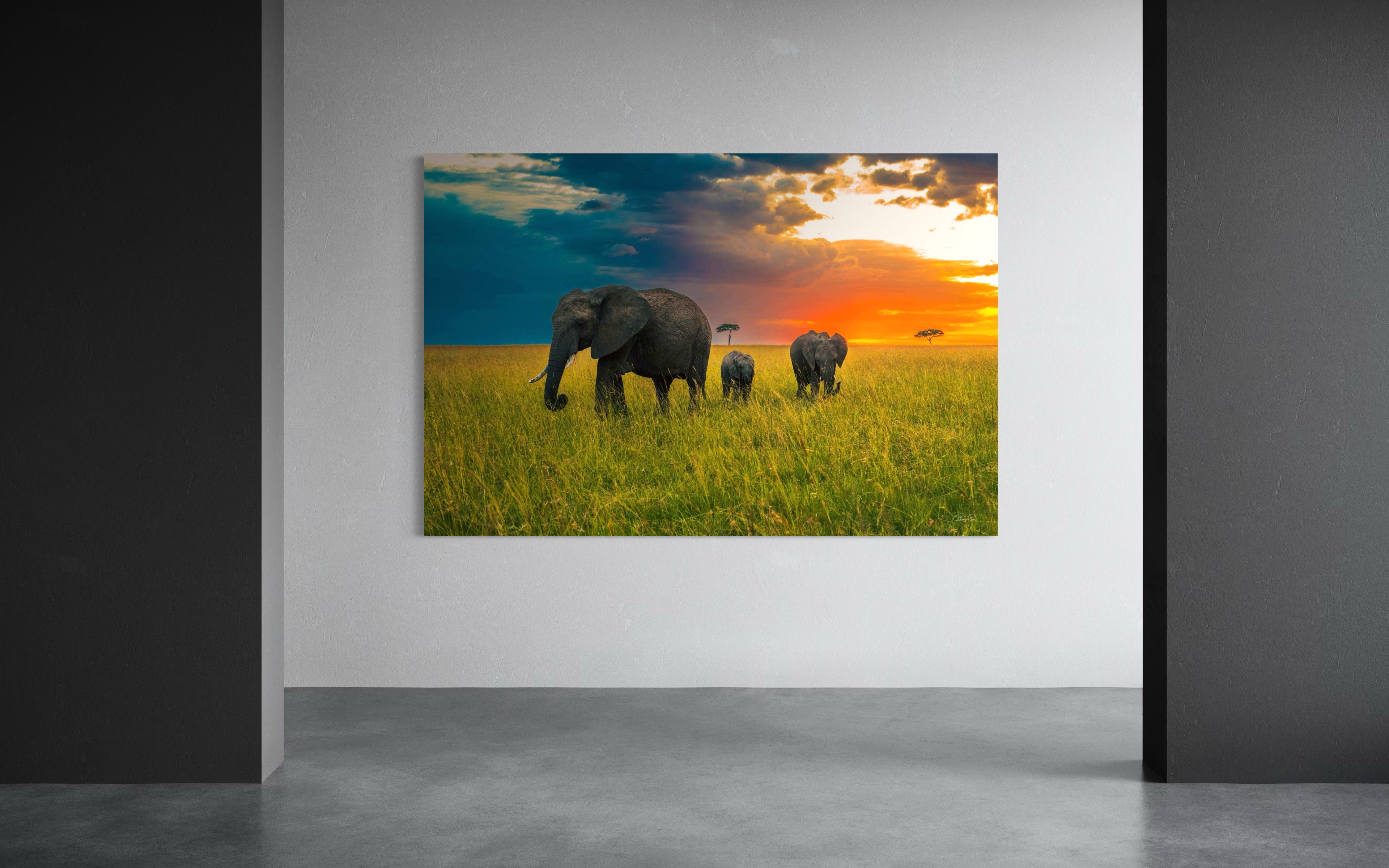 As the sun began its descent beyond the horizon, the sky ignited with breathtaking hues — amber, violet, rose, and flame — merging in dramatic swirls across the vast African expanse. And in that celestial theatre appeared the true monarchs of the land: a family of elephants, emerging slowly, gracefully, as if summoned by the very light. As a fine art wildlife landscape photographer, I stood motionless in awe, my lens becoming a witness rather than a tool. This was more than a photograph — it was a communion with nature’s most honest beauty. The light, the land, the giants… all aligned in perfect harmony.This fine art piece is a tribute to that fleeting, magical encounter — where elephants walked beneath heaven’s brushstrokes, and the Masai Mara reminded me that sometimes, the wild doesn’t roar… it whispers, in colour and dust and awe.