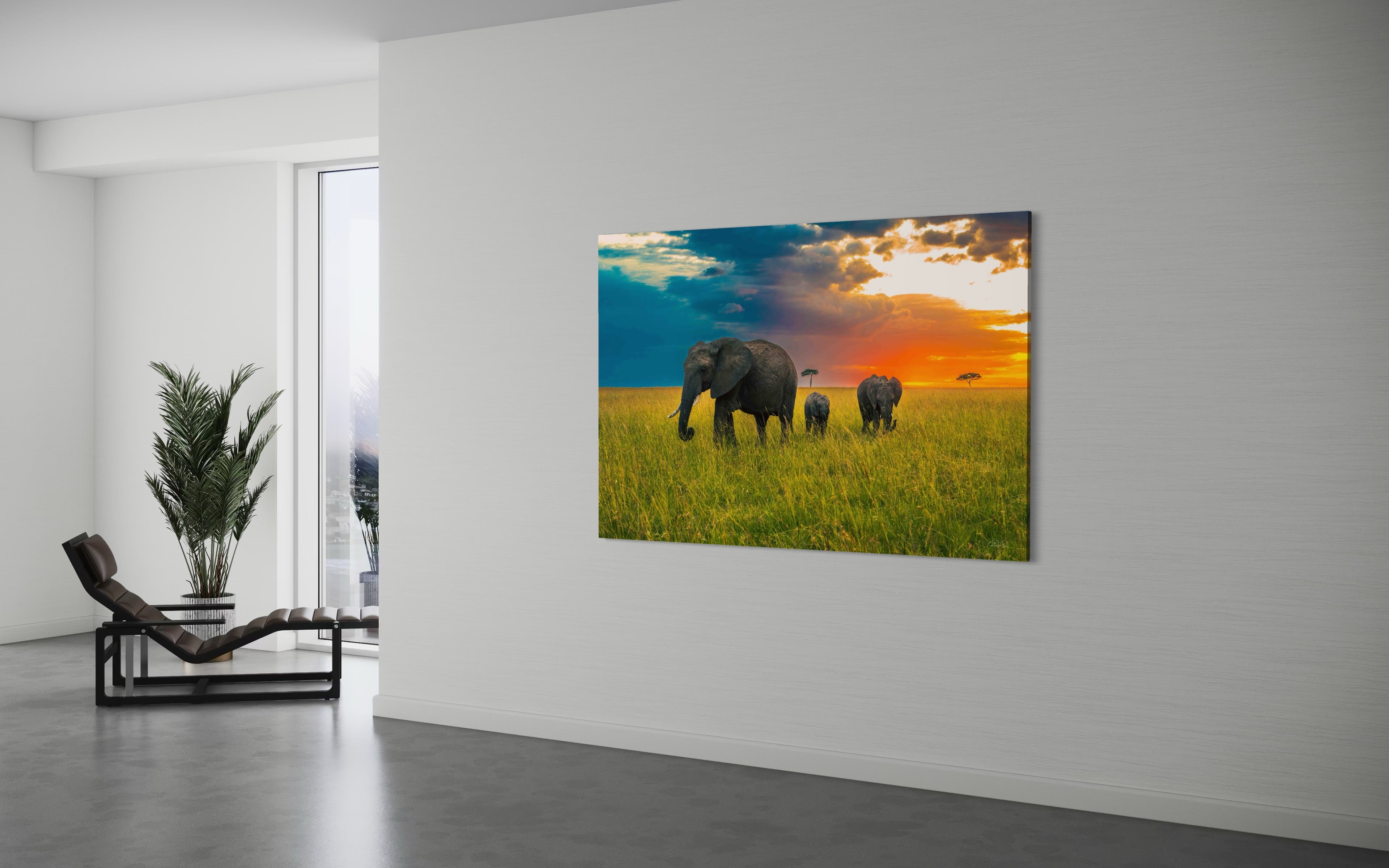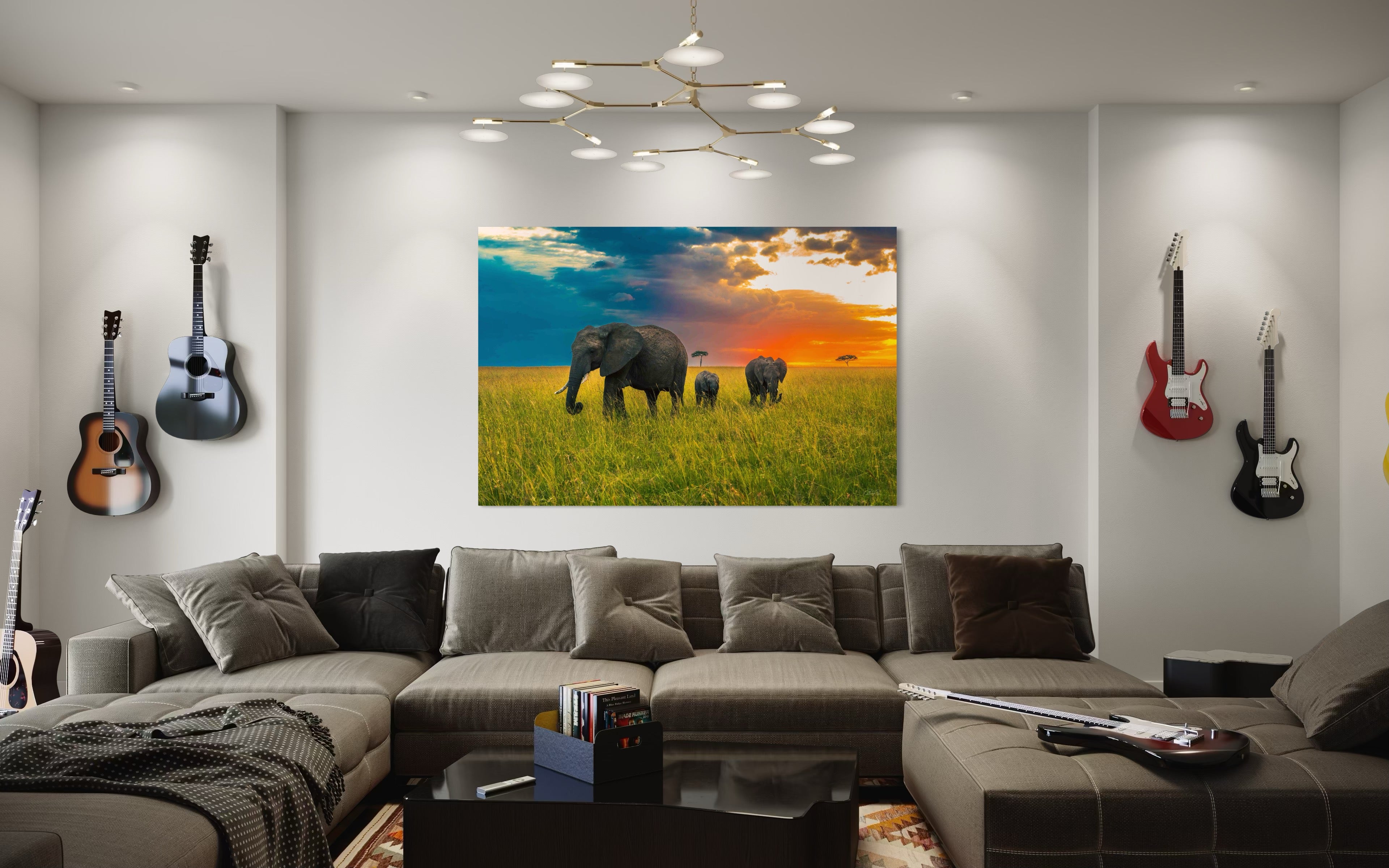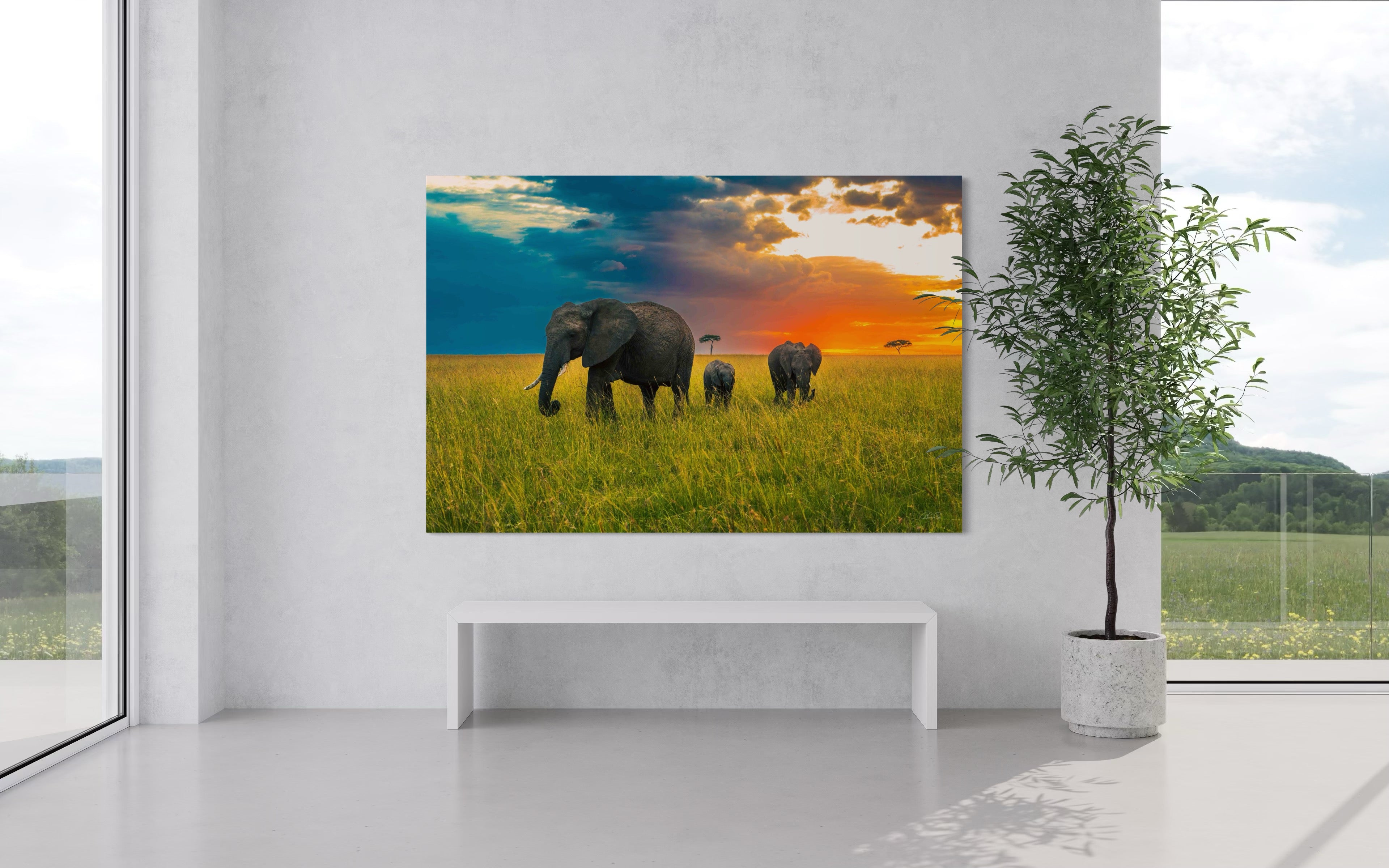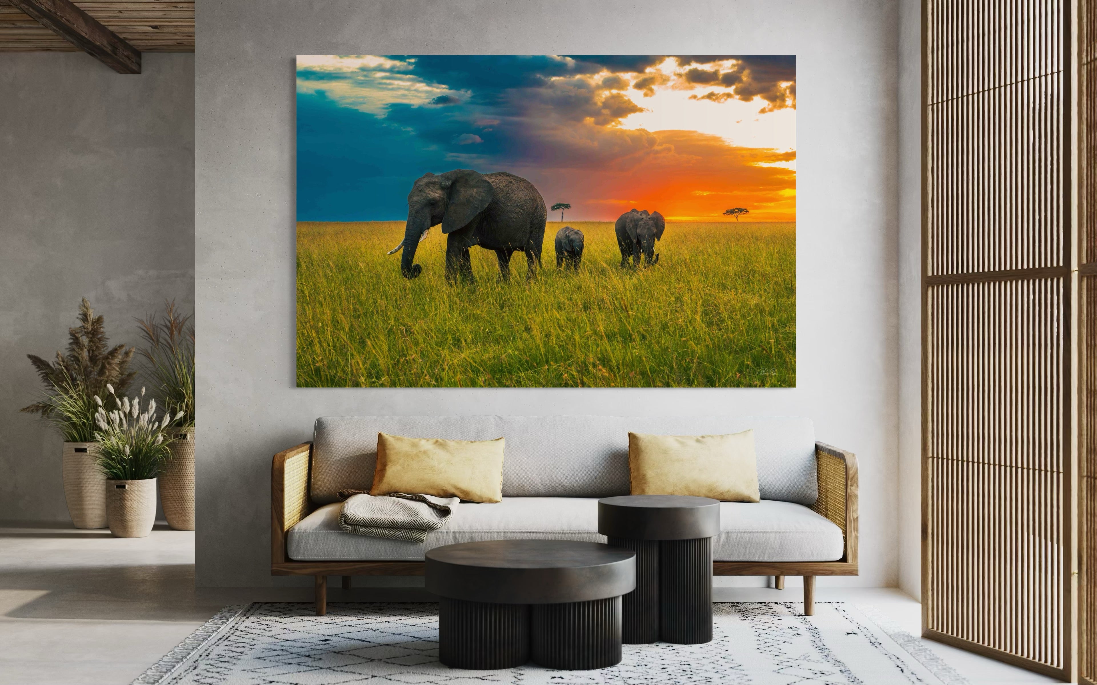 As the sun began its descent beyond the horizon, the sky ignited with breathtaking hues — amber, violet, rose, and flame — merging in dramatic swirls across the vast African expanse. And in that celestial theatre appeared the true monarchs of the land: a family of elephants, emerging slowly, gracefully, as if summoned by the very light. As a fine art wildlife landscape photographer, I stood motionless in awe, my lens becoming a witness rather than a tool. This was more than a photograph — it was a communion with nature’s most honest beauty. The light, the land, the giants… all aligned in perfect harmony.This fine art piece is a tribute to that fleeting, magical encounter — where elephants walked beneath heaven’s brushstrokes, and the Masai Mara reminded me that sometimes, the wild doesn’t roar… it whispers, in colour and dust and awe.