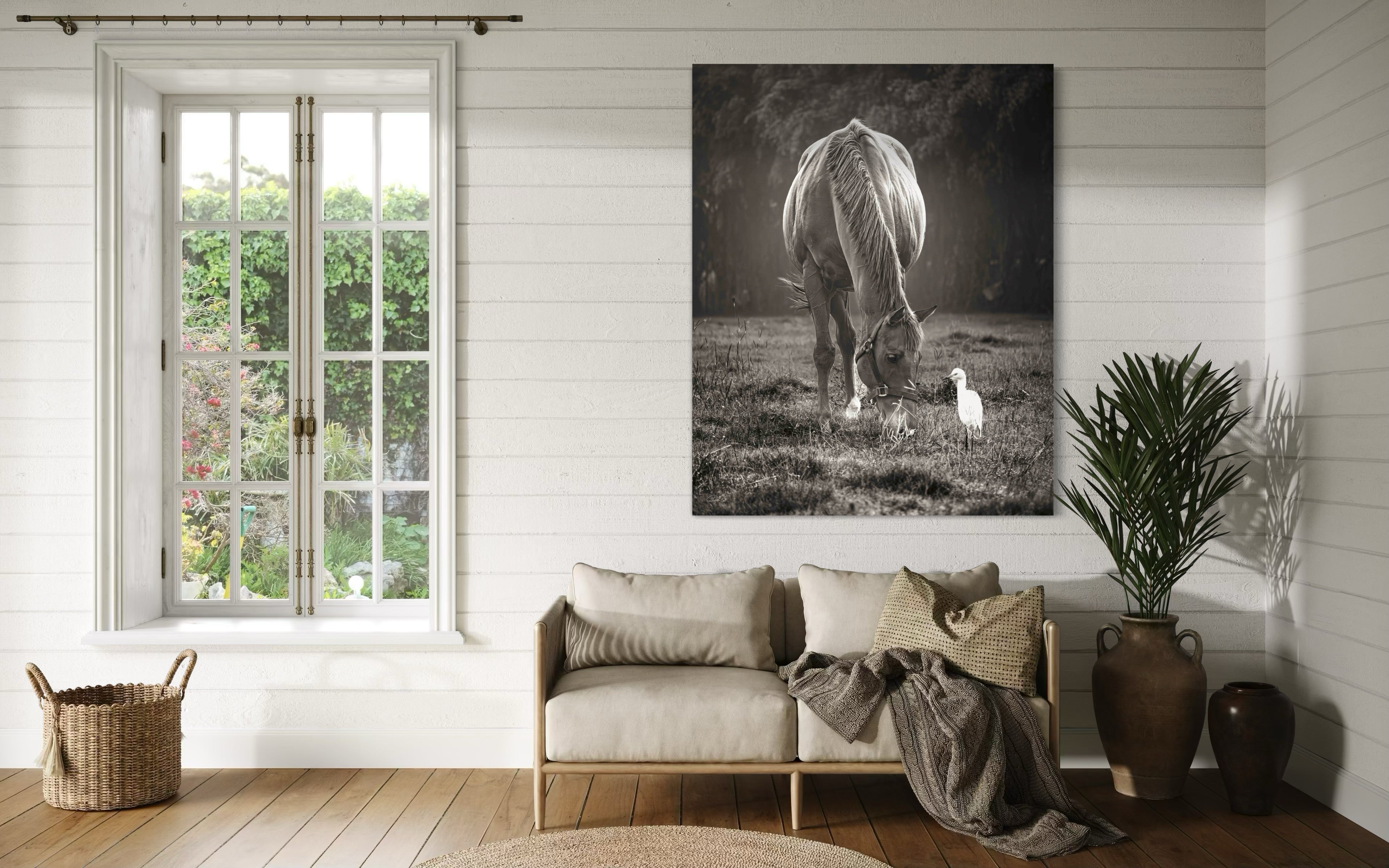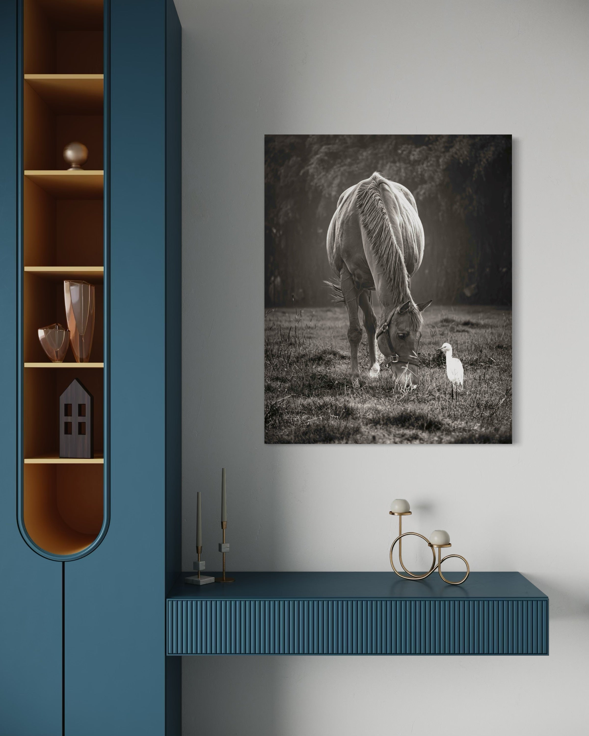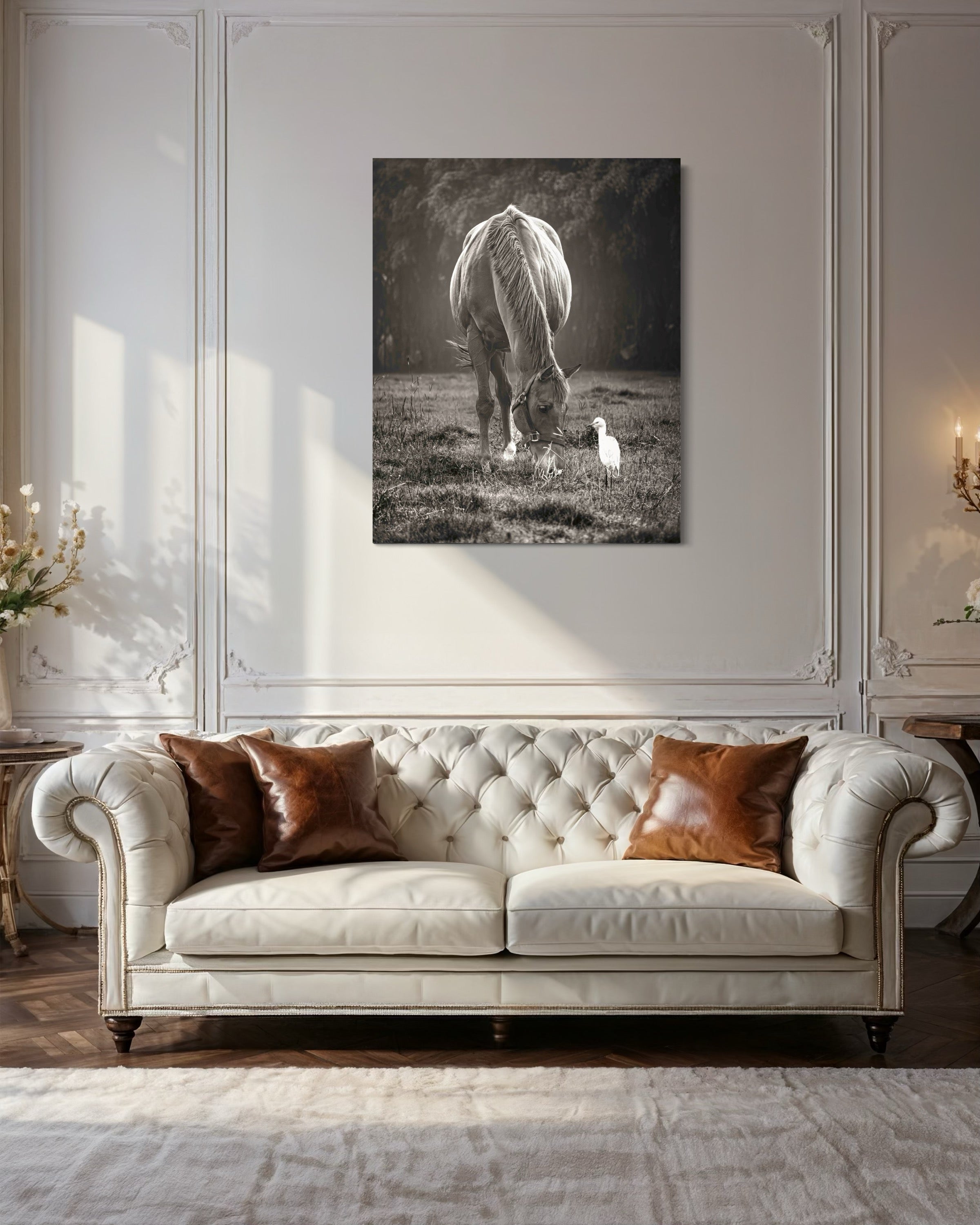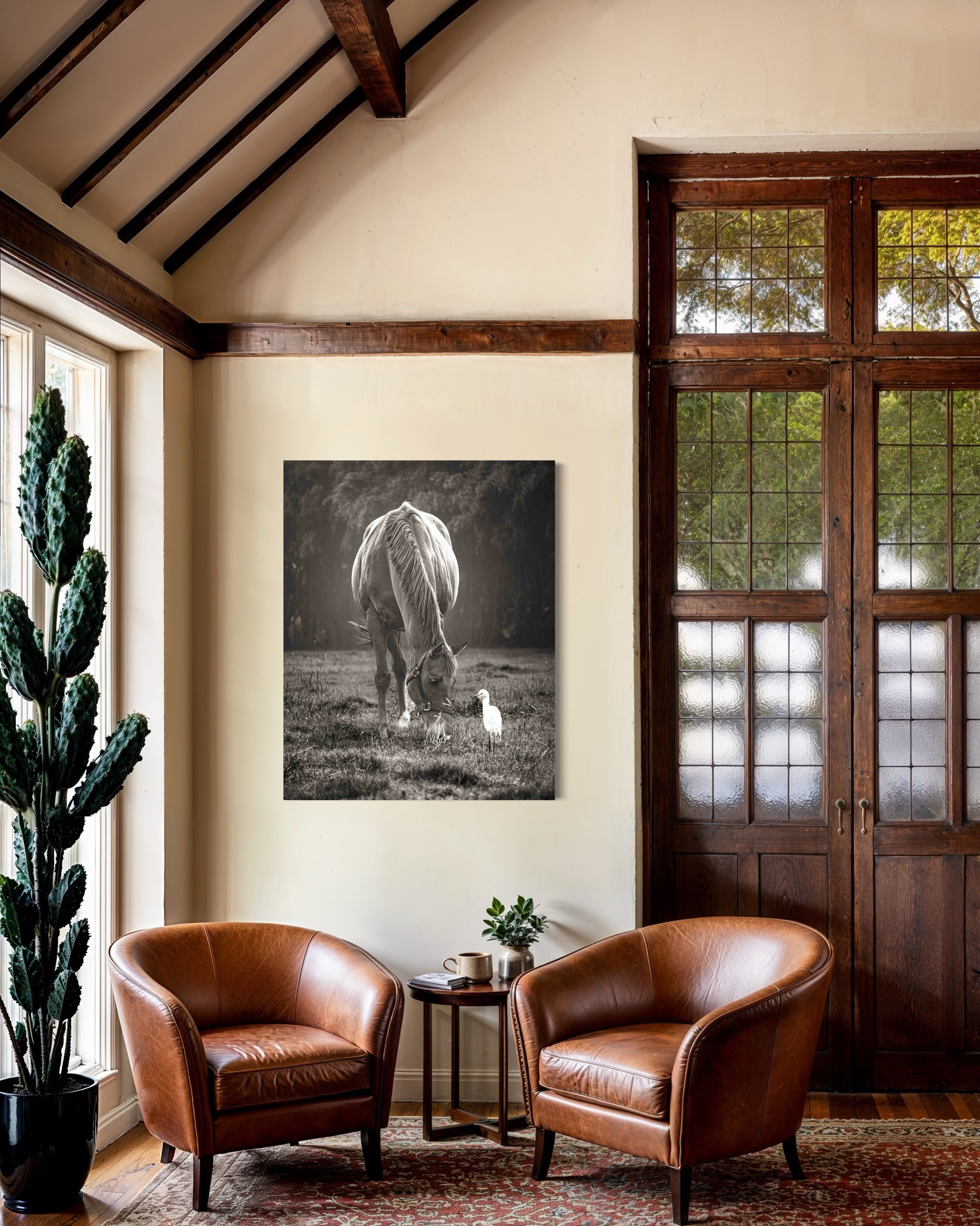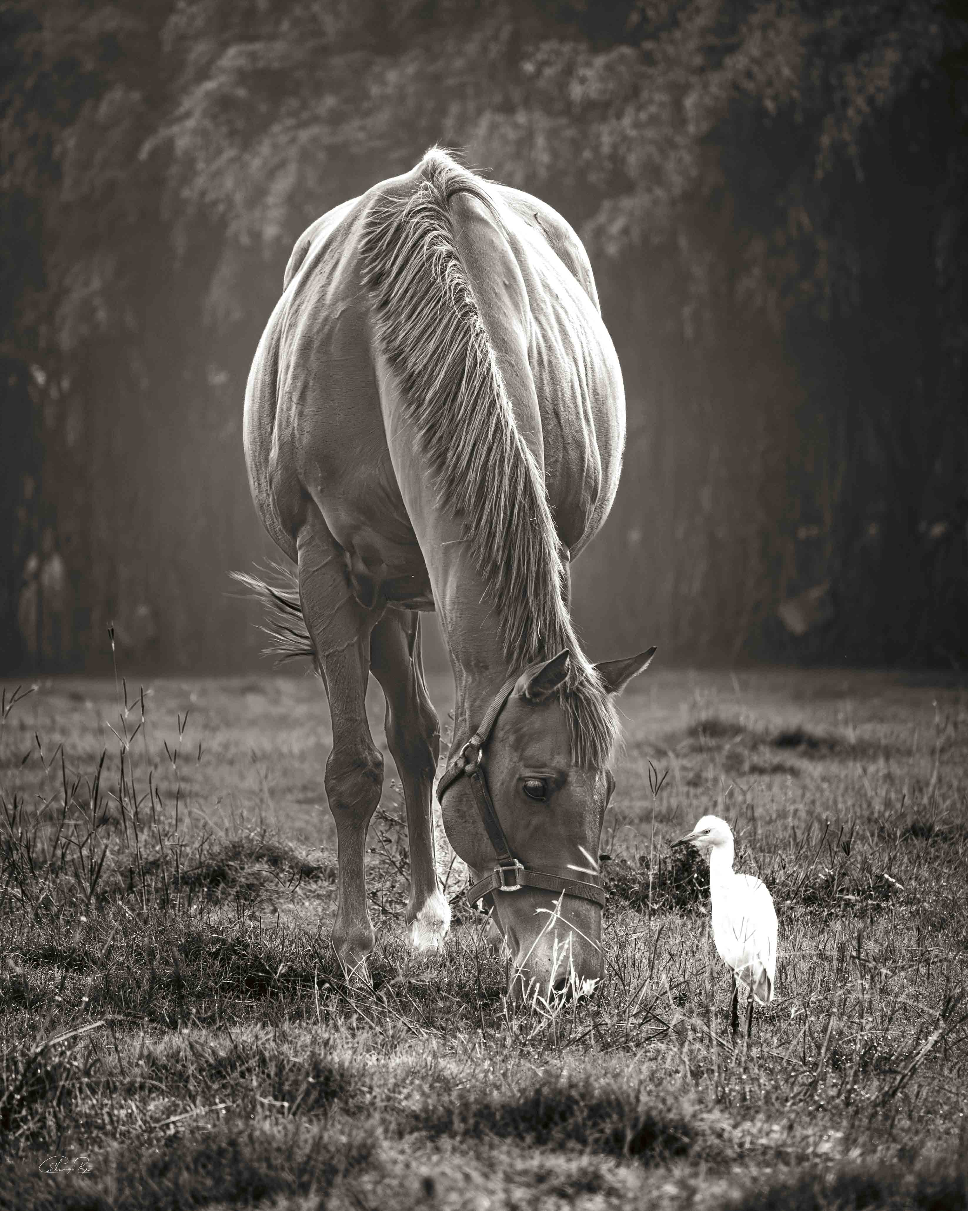 That morning, a scene unfolded before me that I will never forget. In the quiet paddock, a chestnut mare heavy with new life grazed peacefully on the fresh grass. Suddenly, an egret glided in and settled gently in front of her, as if standing guard in the stillness of the morning dew.