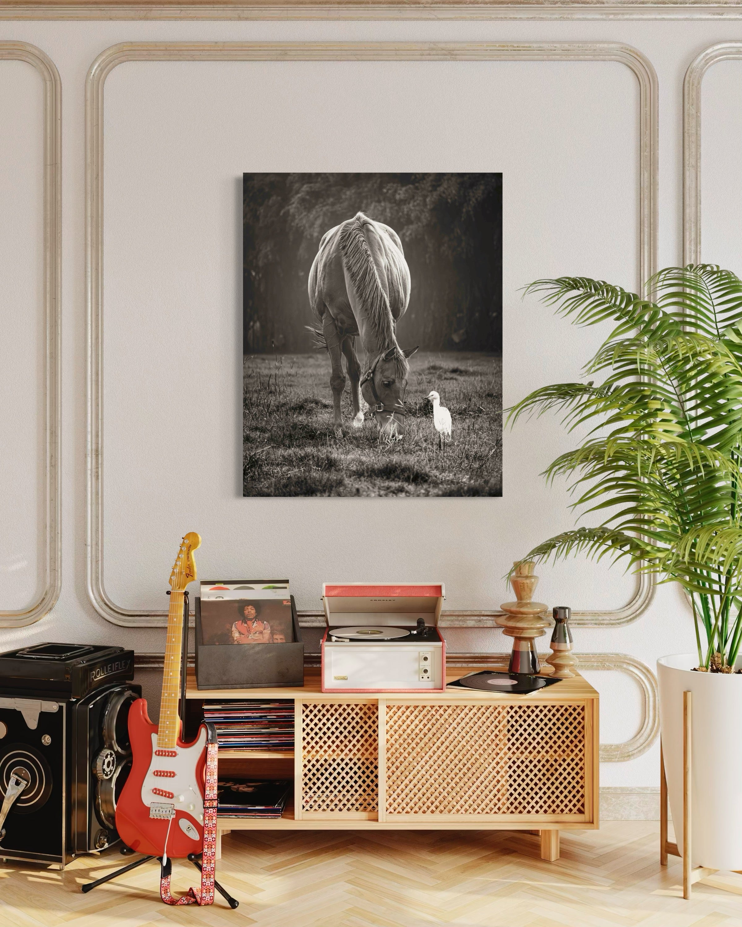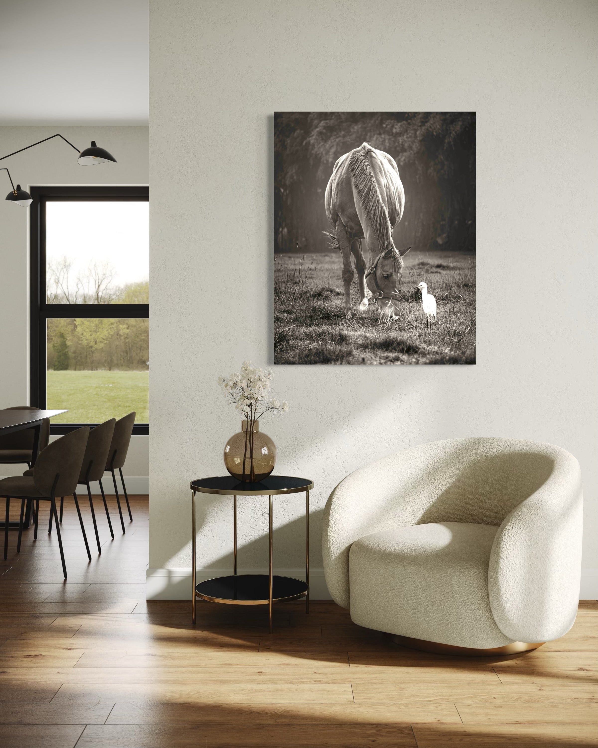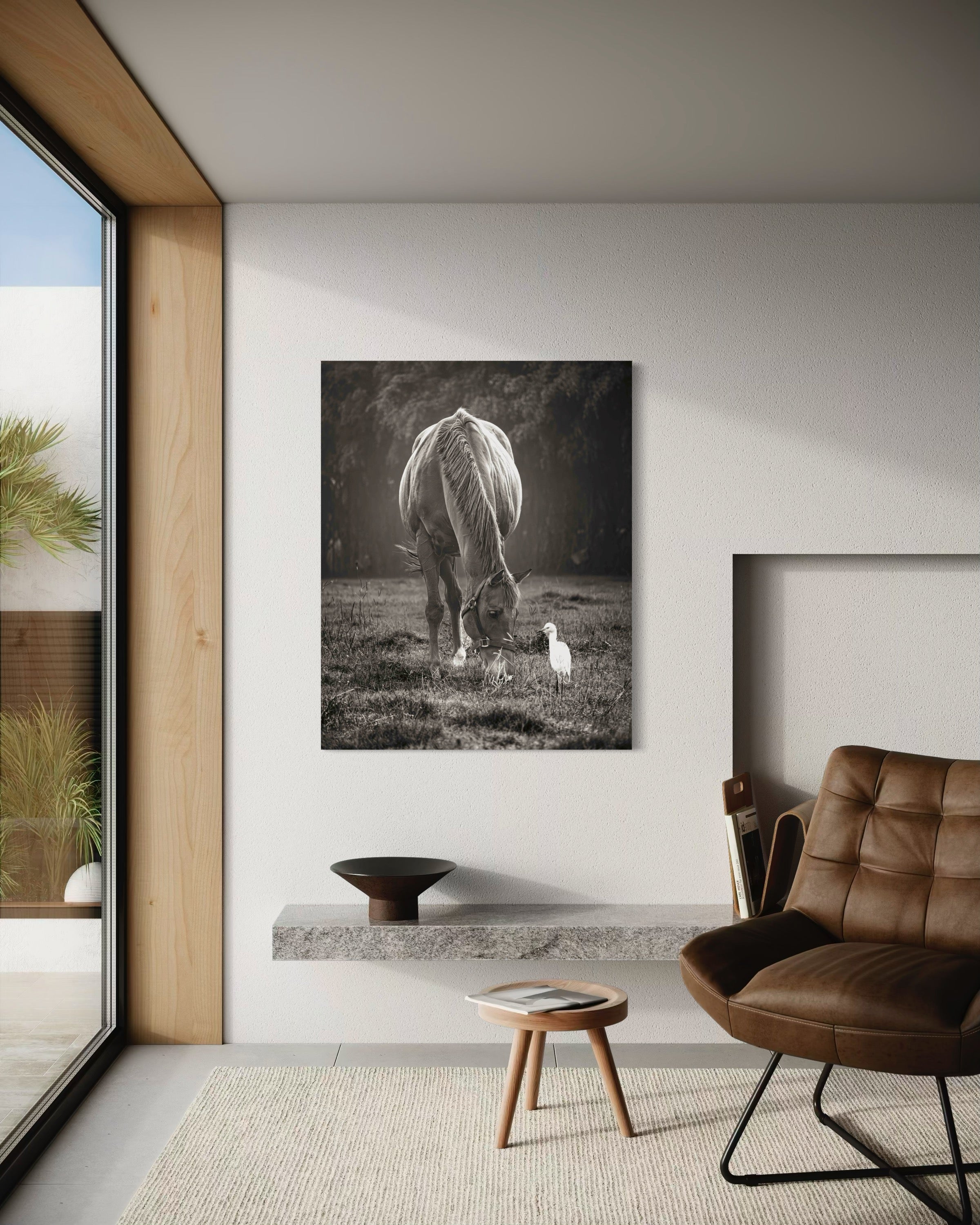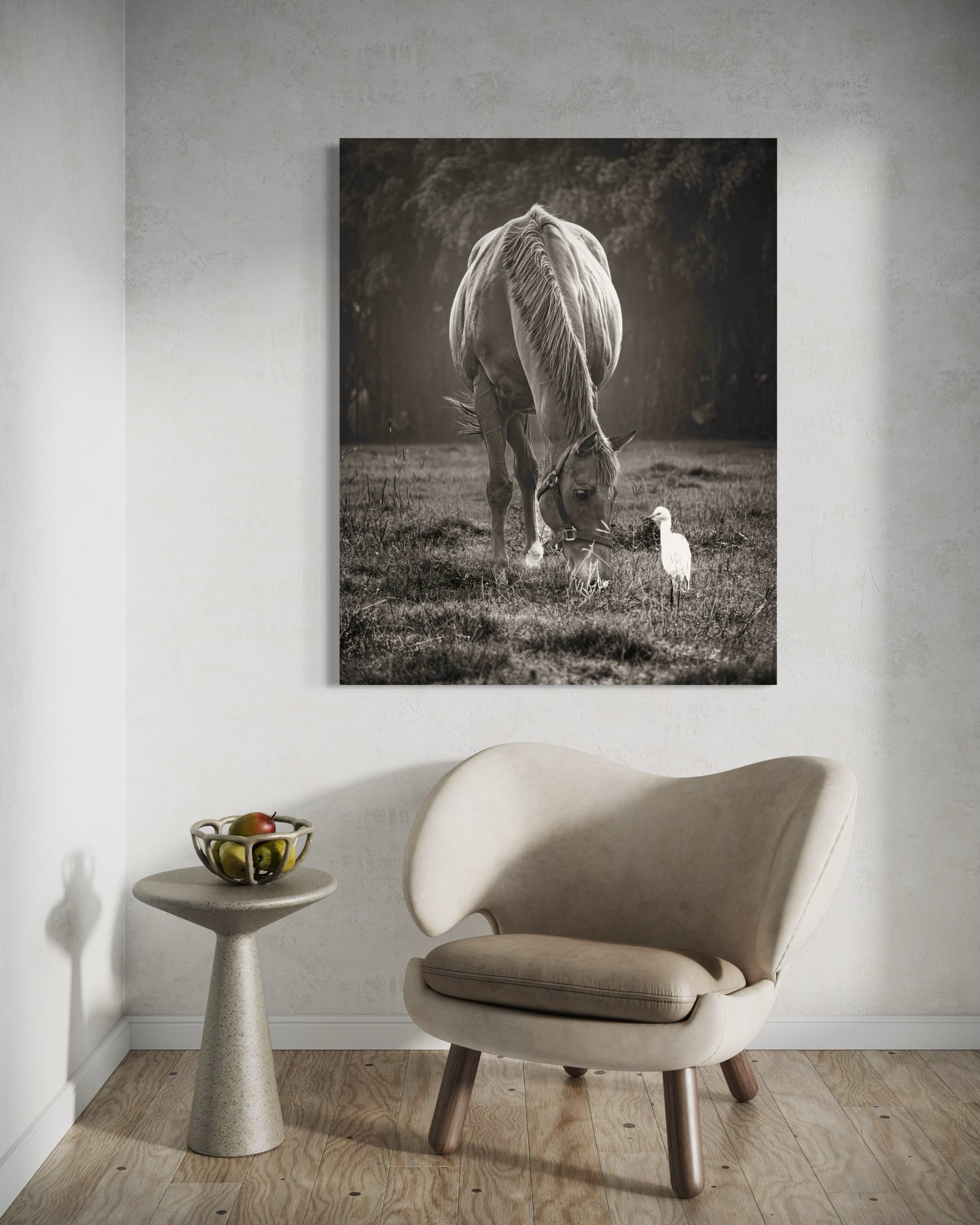 That morning, a scene unfolded before me that I will never forget. In the quiet paddock, a chestnut mare heavy with new life grazed peacefully on the fresh grass. Suddenly, an egret glided in and settled gently in front of her, as if standing guard in the stillness of the morning dew.