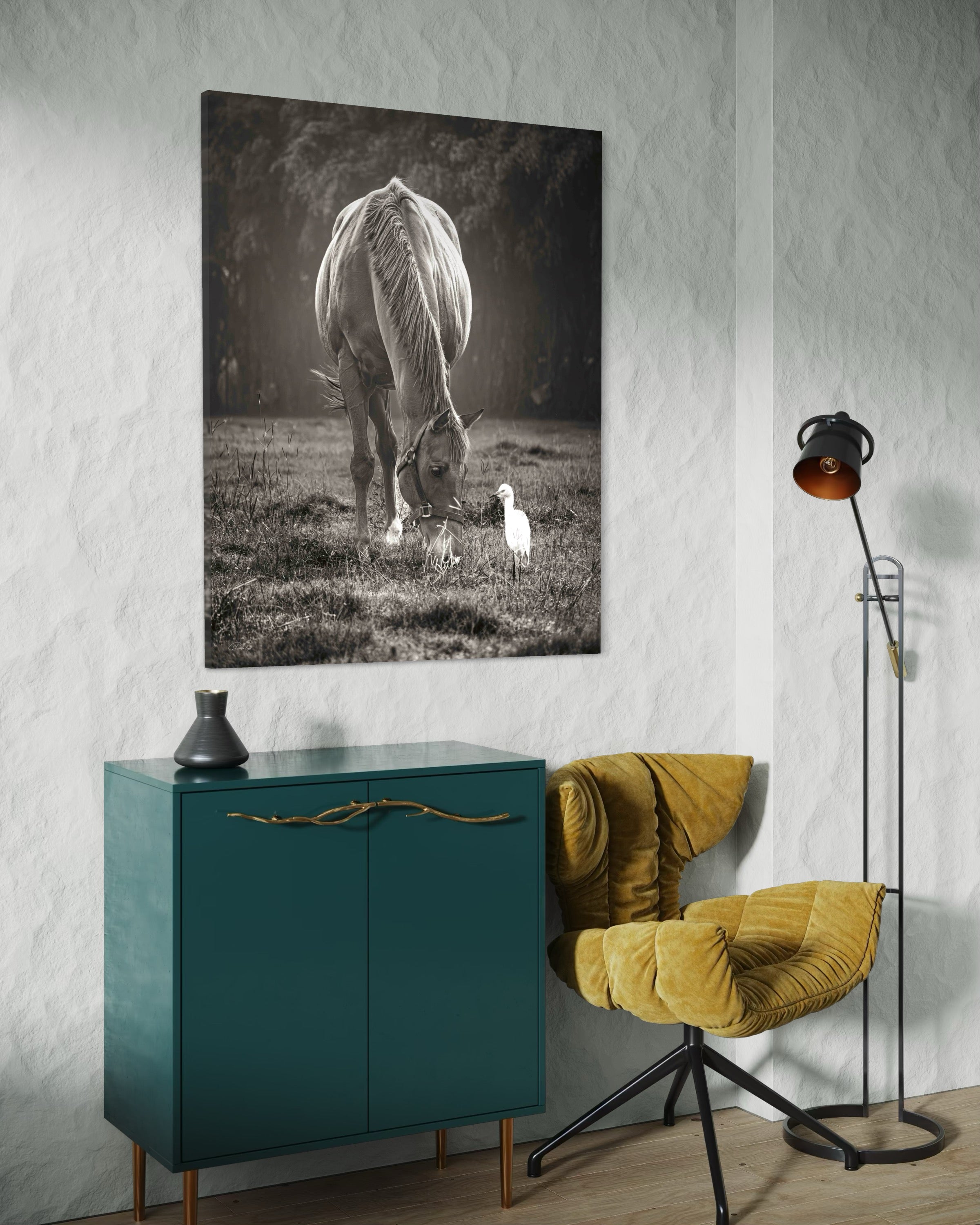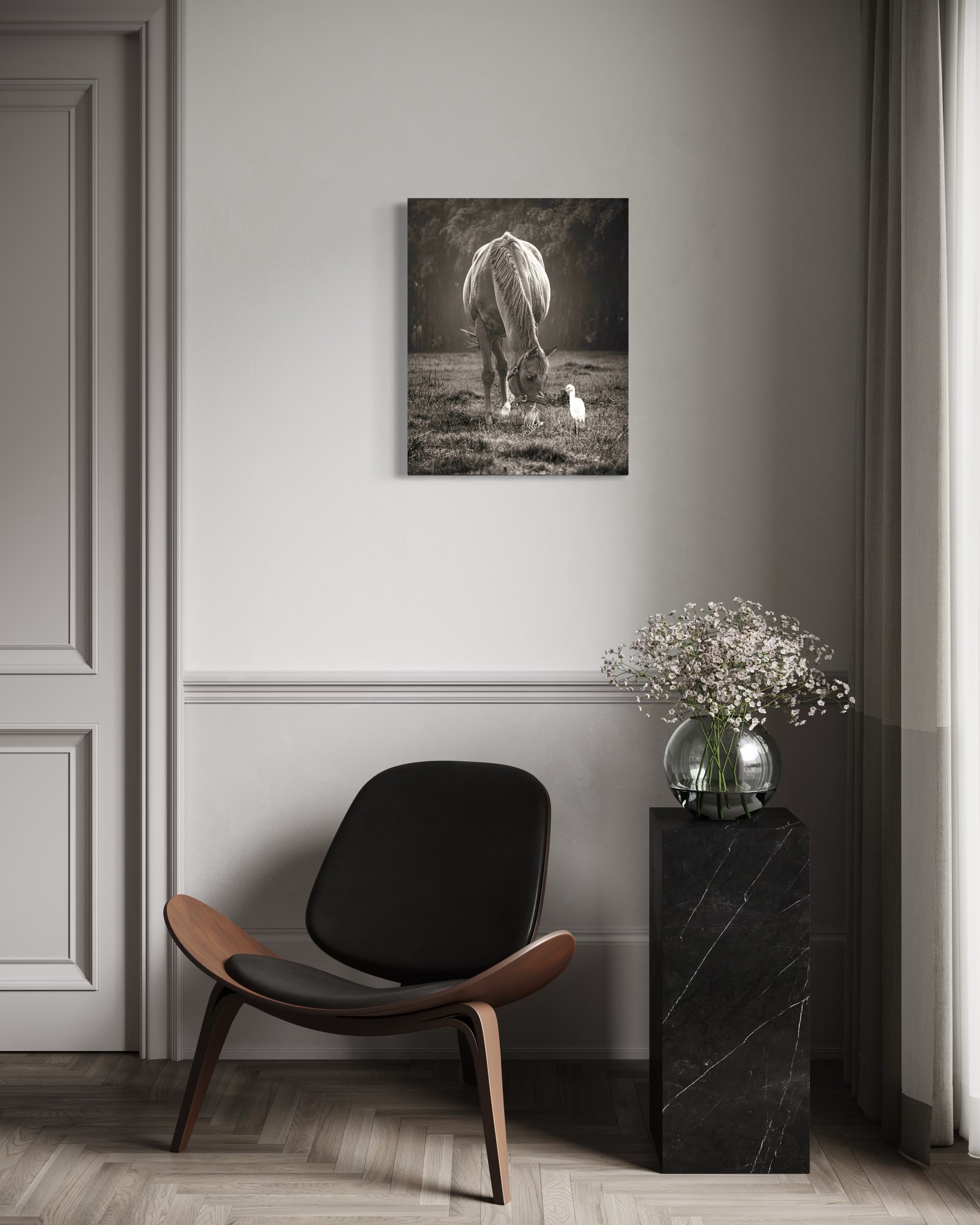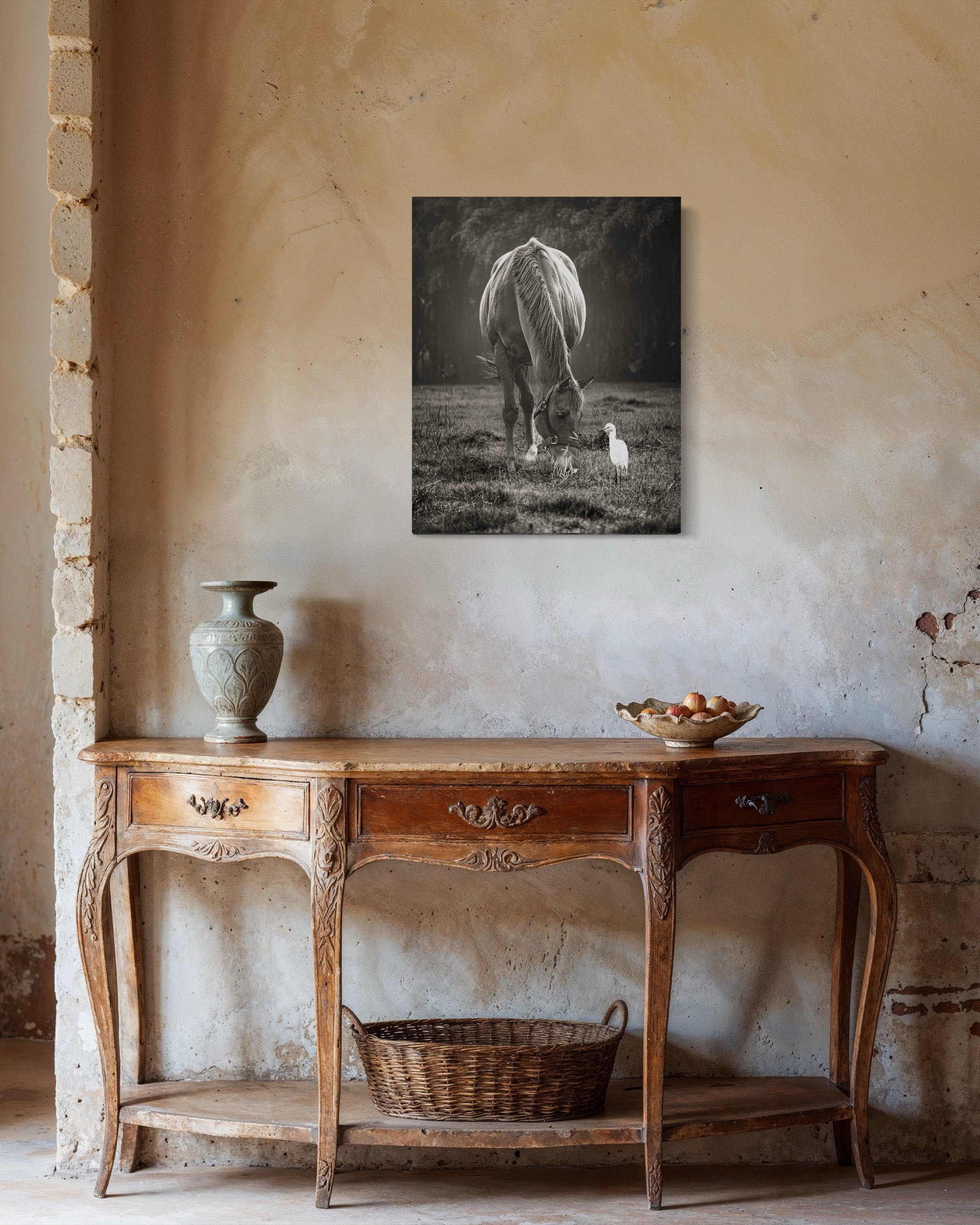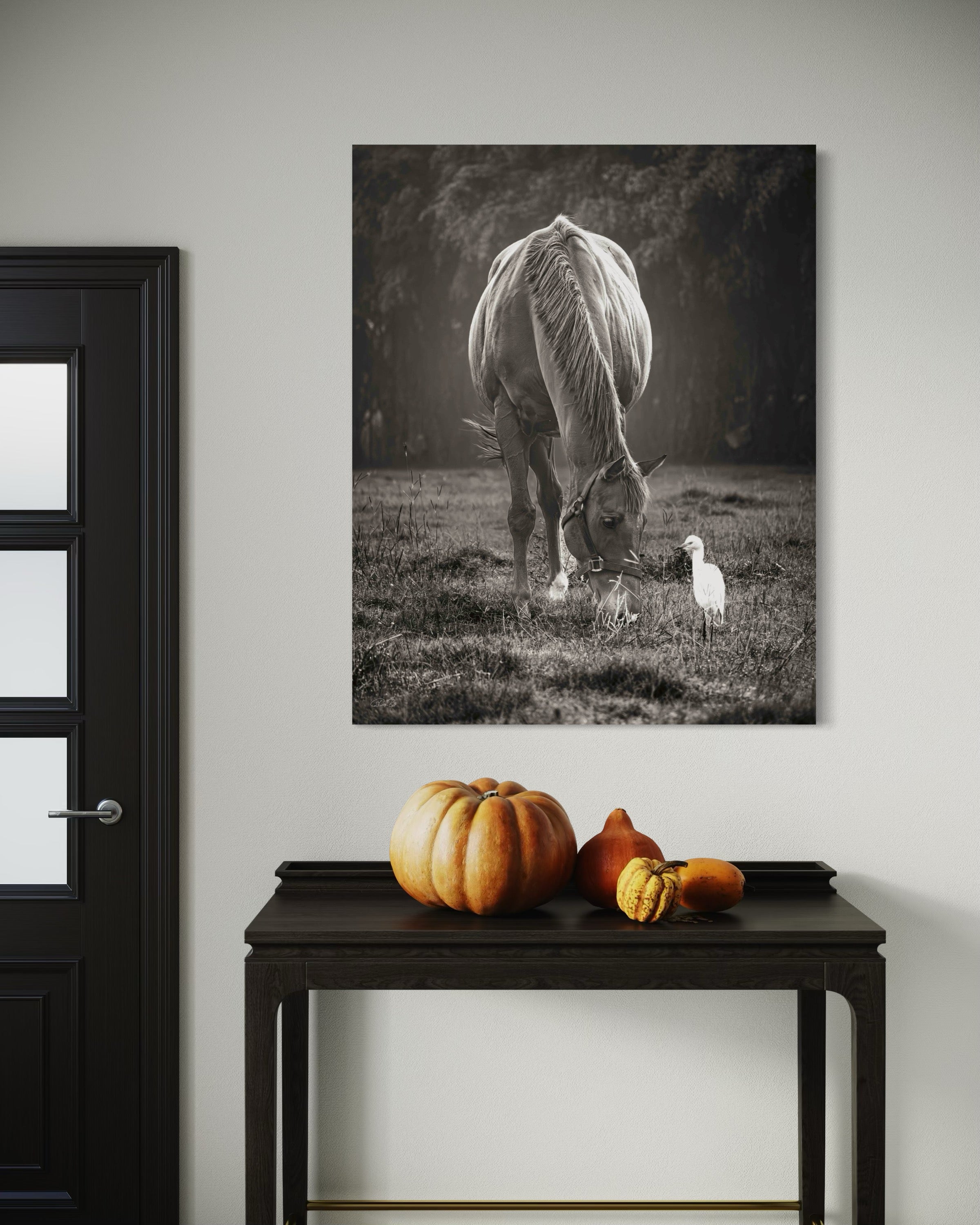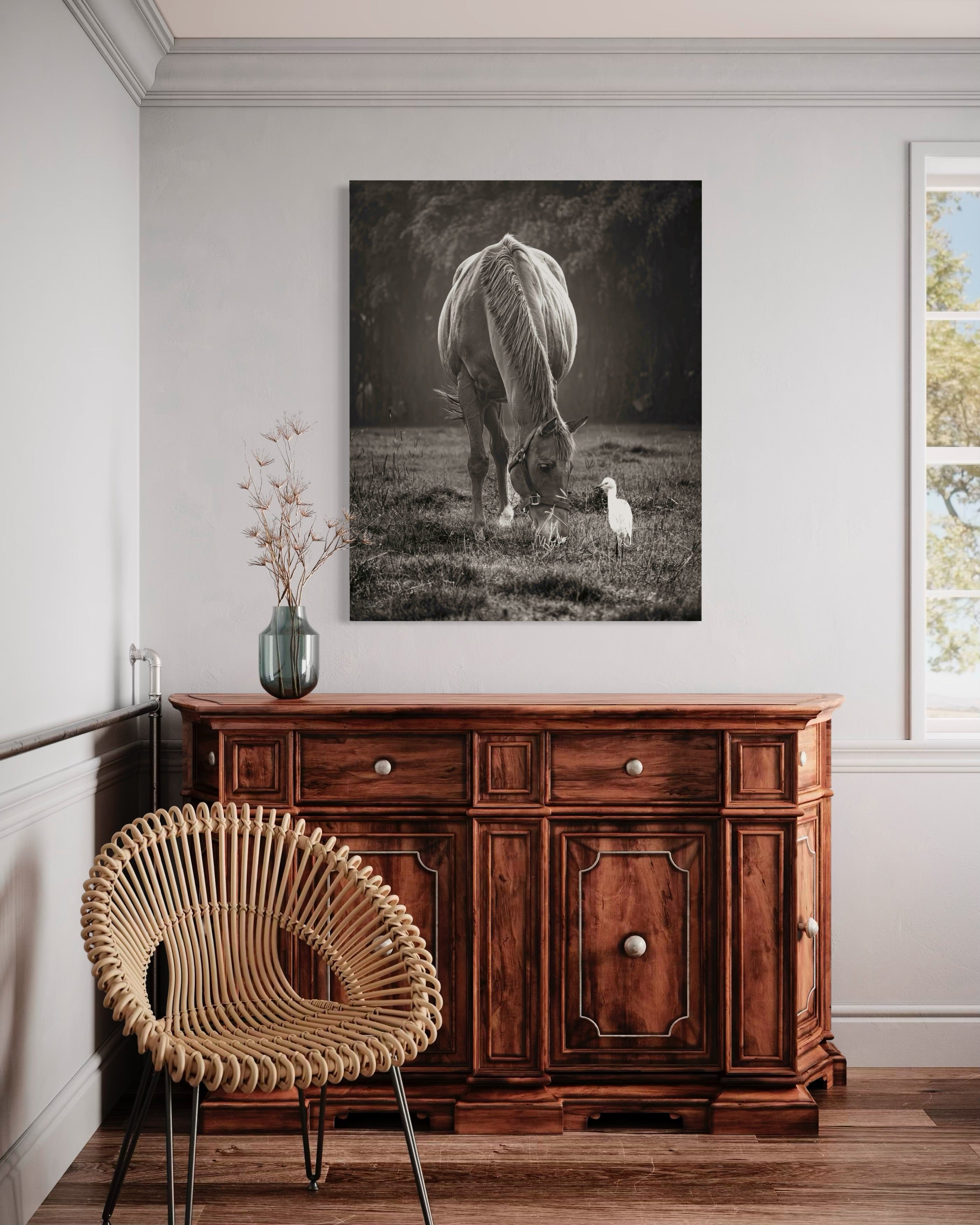 That morning, a scene unfolded before me that I will never forget. In the quiet paddock, a chestnut mare heavy with new life grazed peacefully on the fresh grass. Suddenly, an egret glided in and settled gently in front of her, as if standing guard in the stillness of the morning dew.